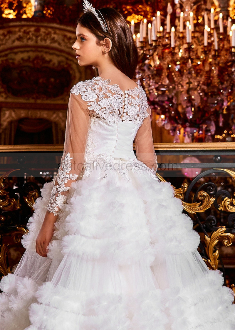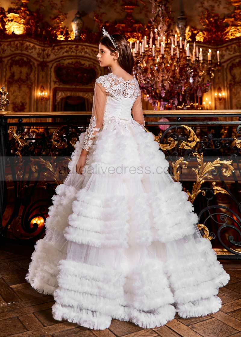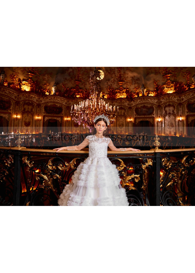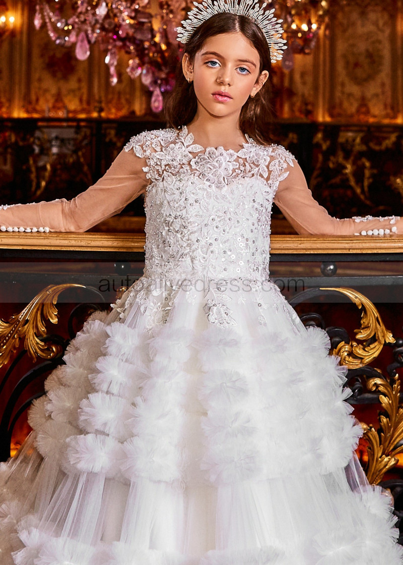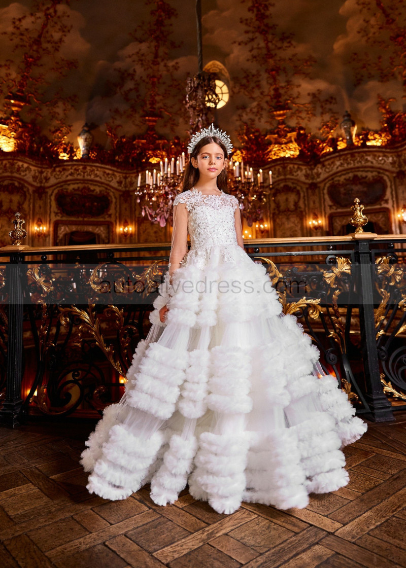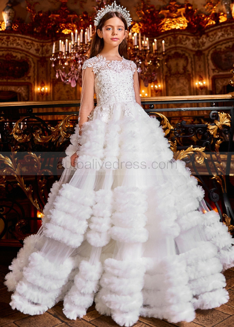 Beaded White Lace Tulle Ruffled Stunning Flower Girl Dress