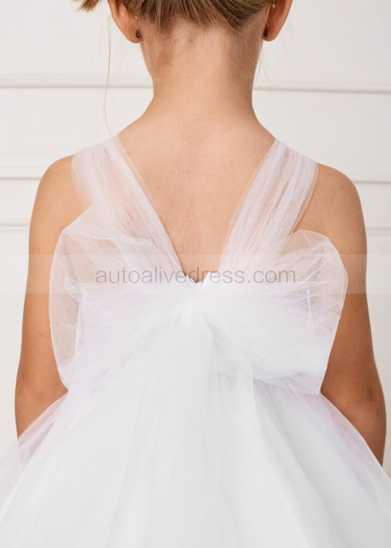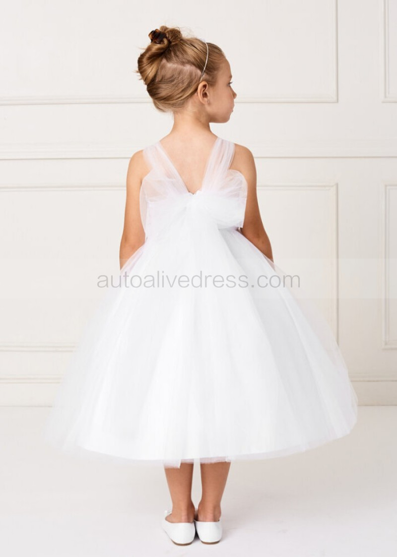Beaded White Lace Tulle Tea Length Flower Girl Dress