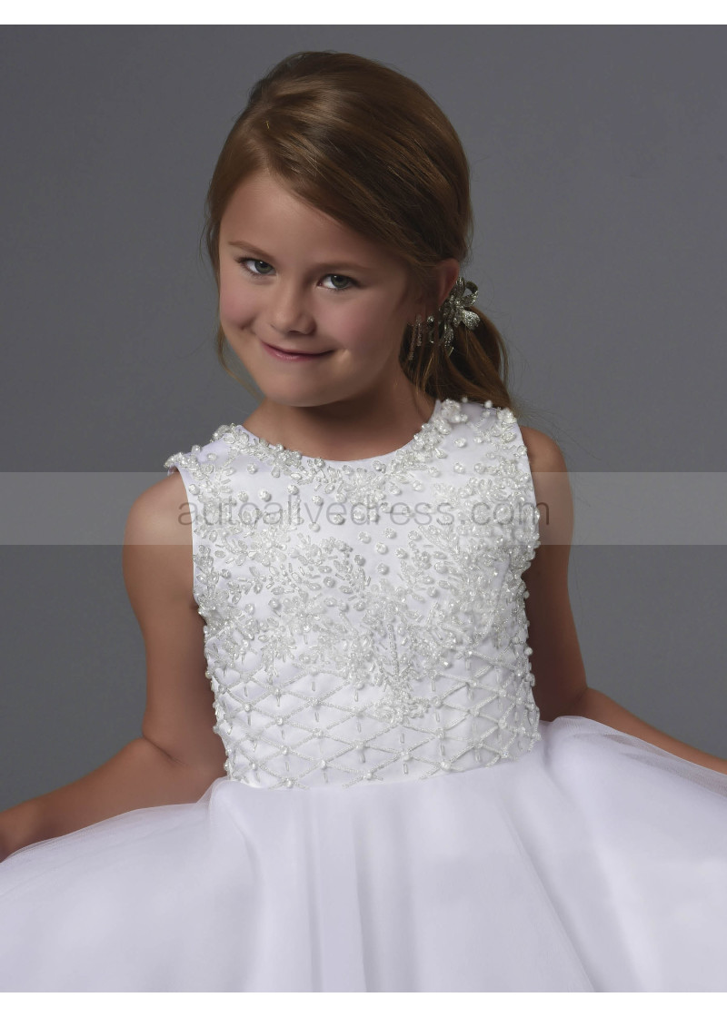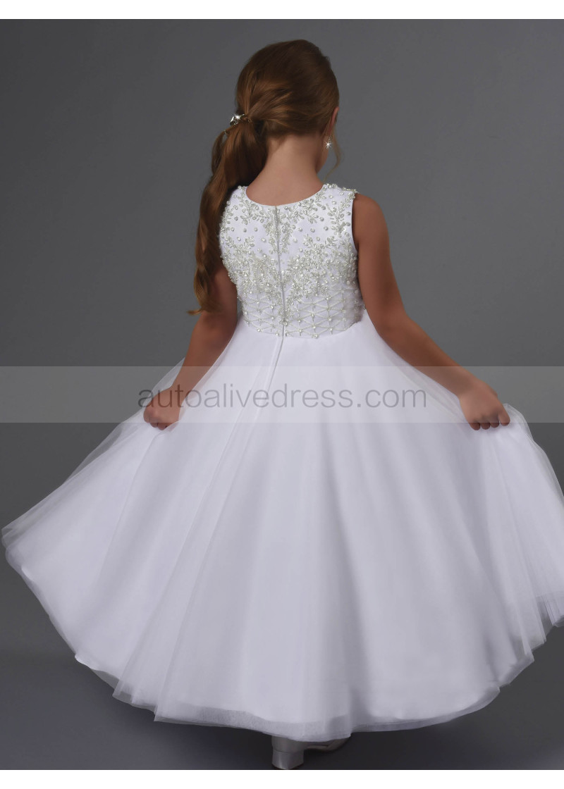 Beaded White Satin Tulle Floor Length Flower Girl Dress