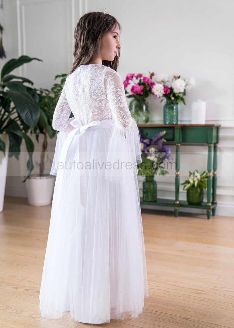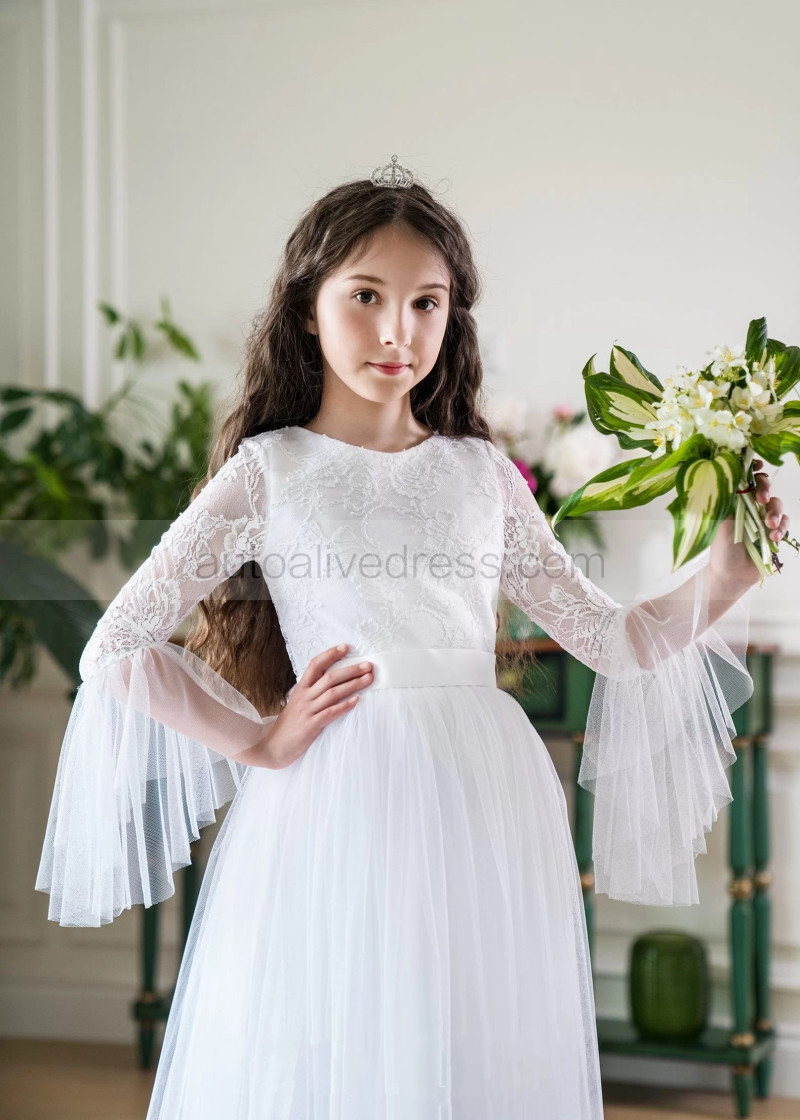 Bell Sleeves White Lace Tulle Flower Girl Dress