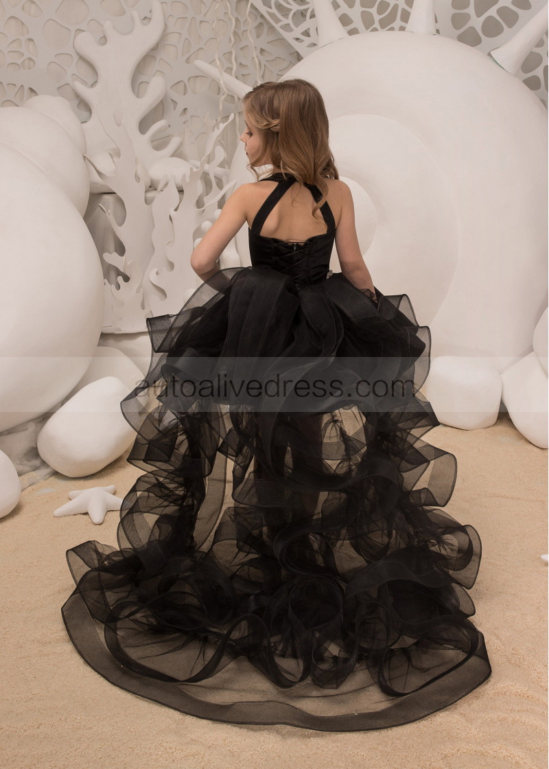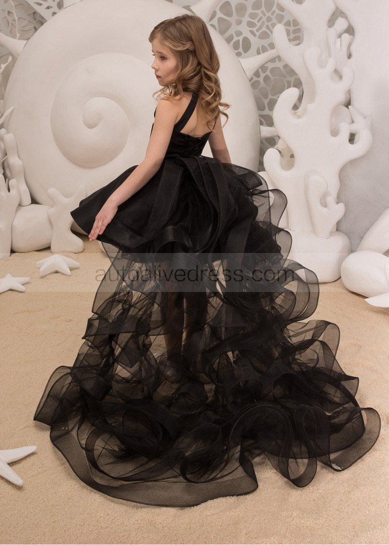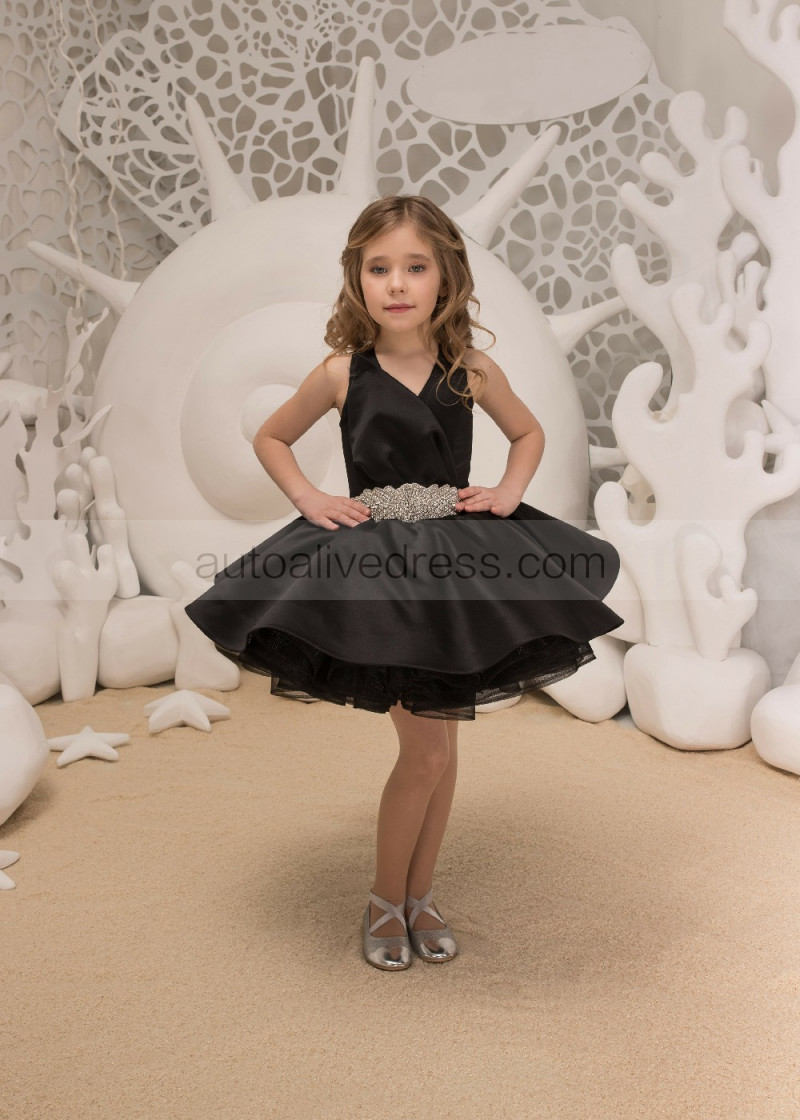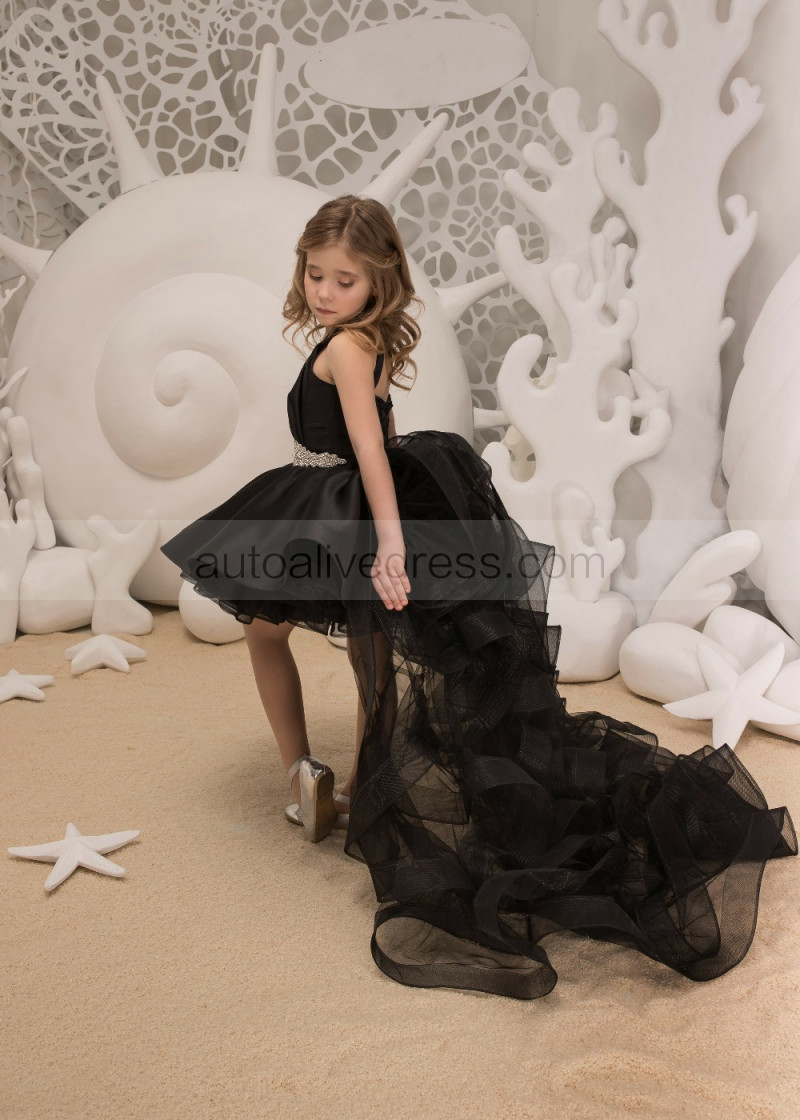 Black Satin Tulle High-low Flower Girl Dress With Beaded Sash