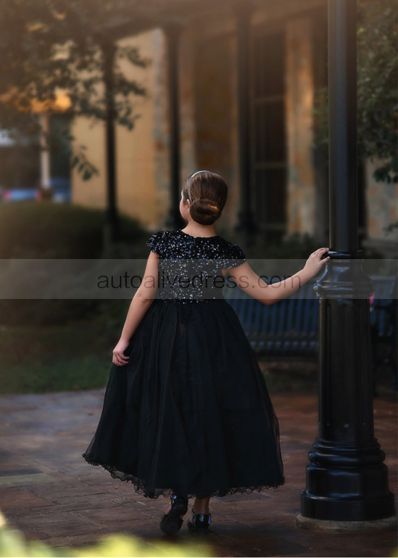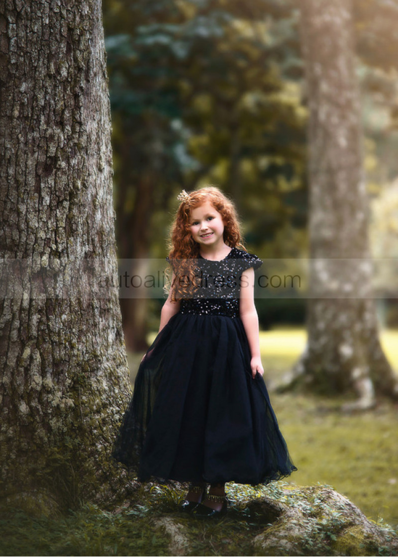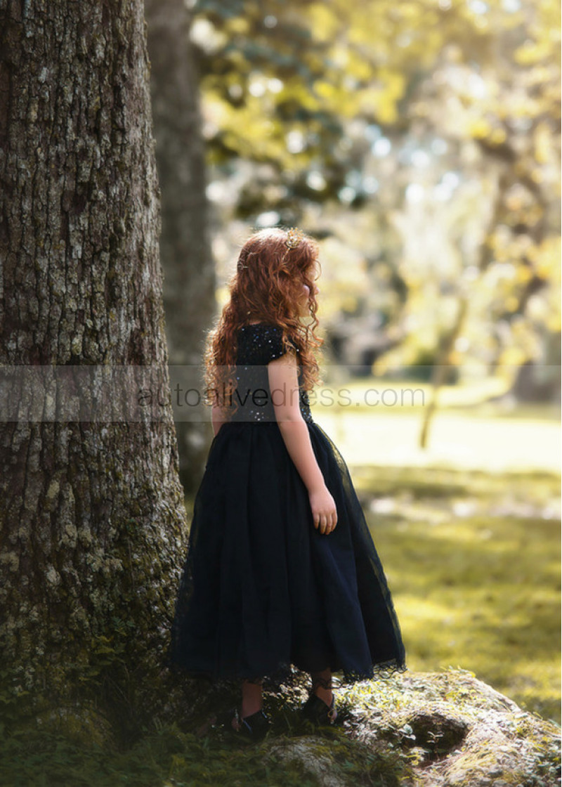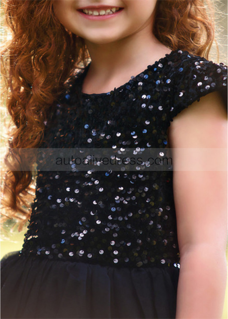 Black Sequin Tulle Curly Hem Flower Girl Dress
