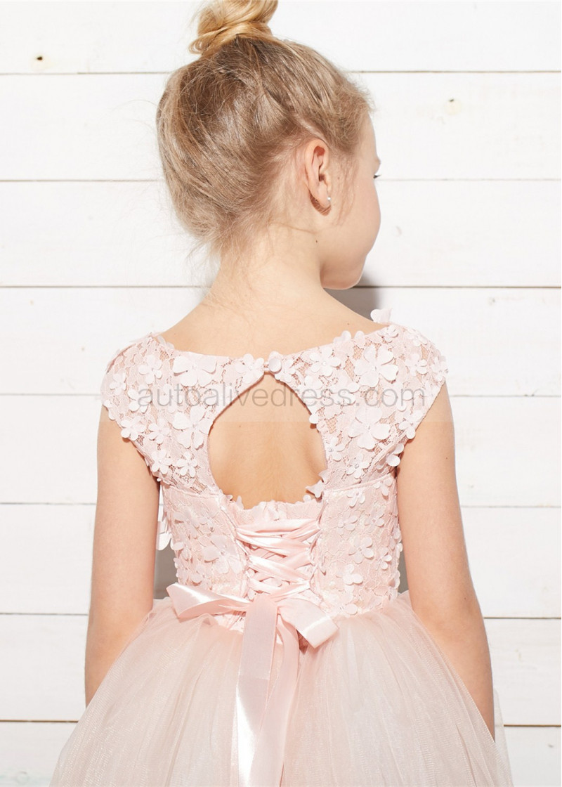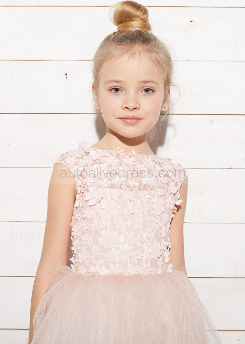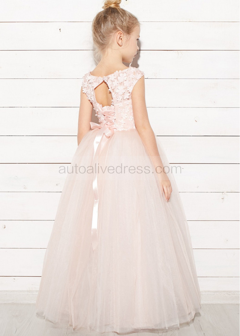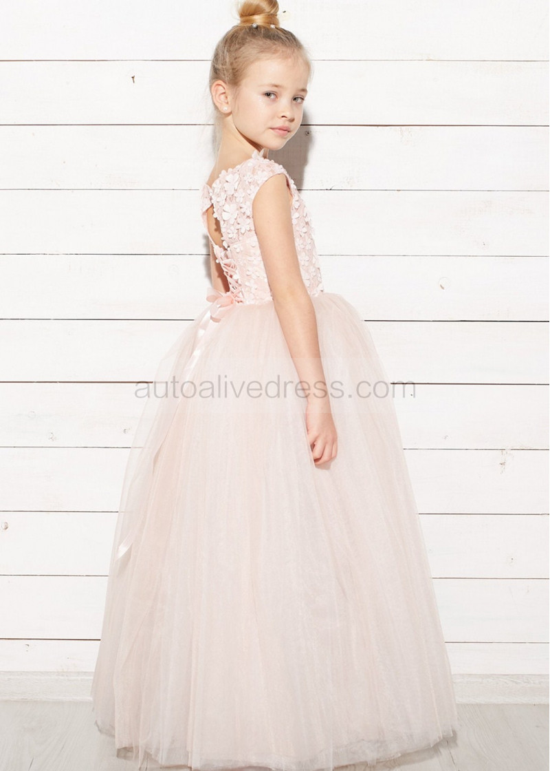 Blush Pink Lace Tulle 3D Flowers Floor Lnegth Flower Girl Dress