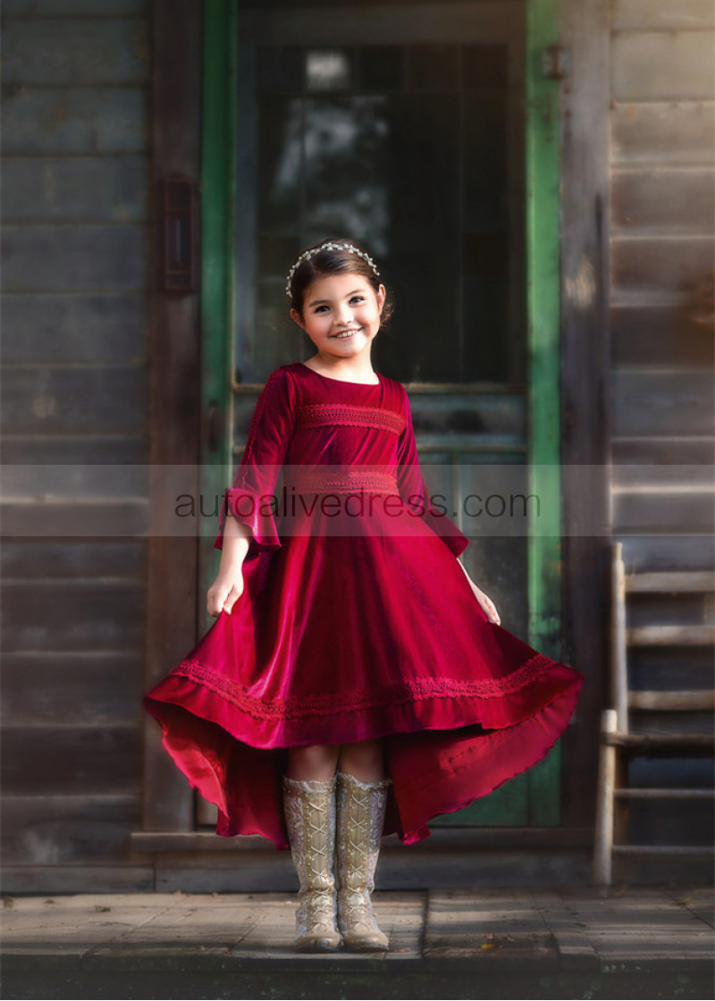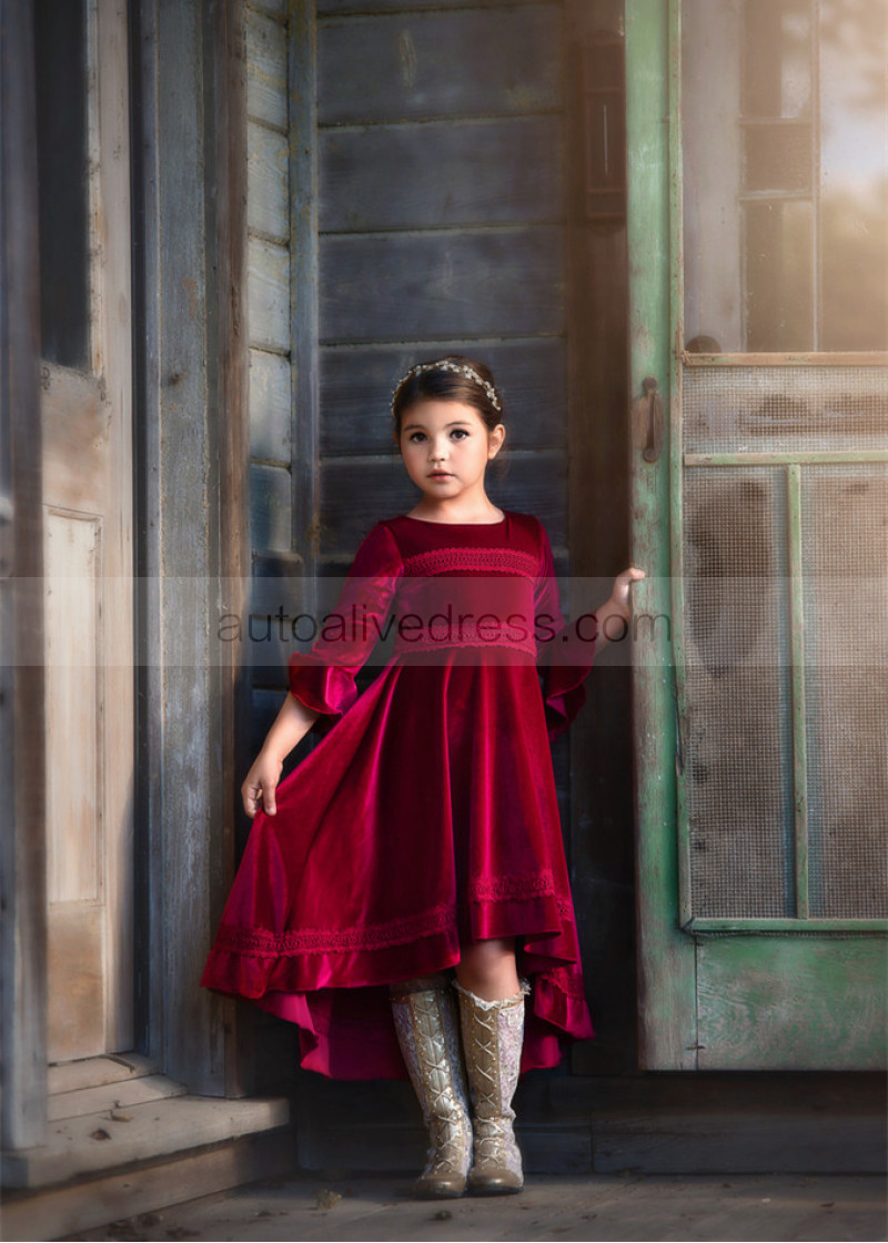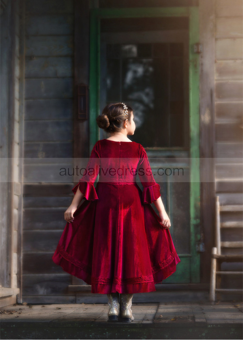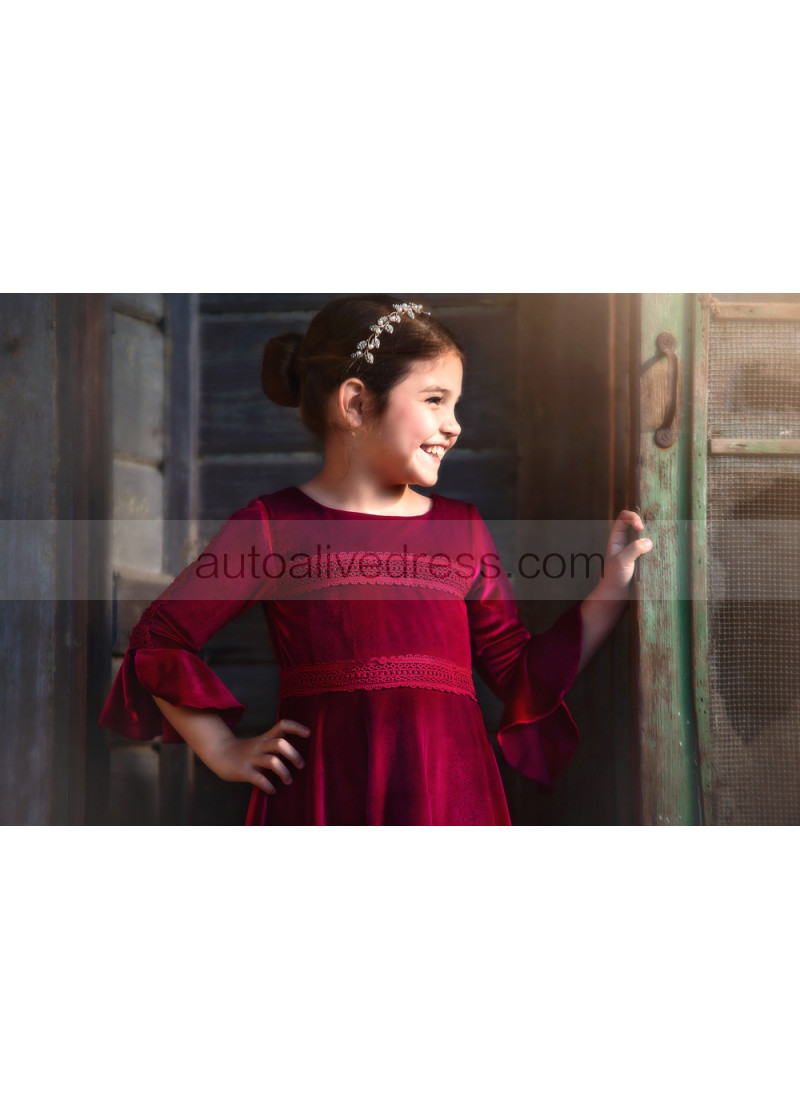 Burgundy Velvet Lace Trim Flower Girl Dress Christmas Dress