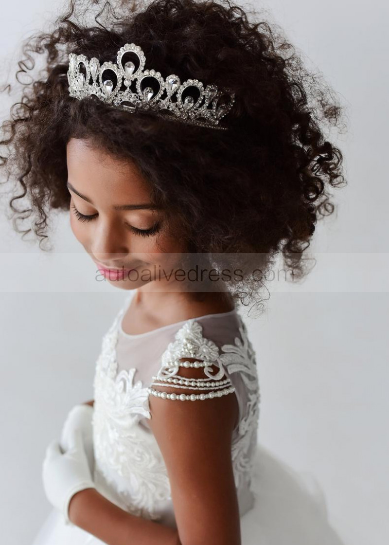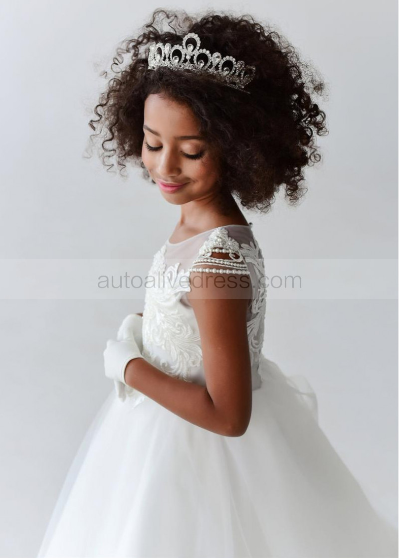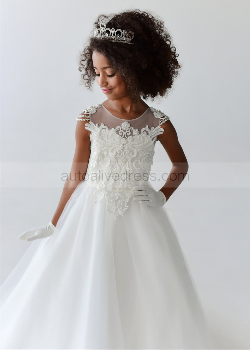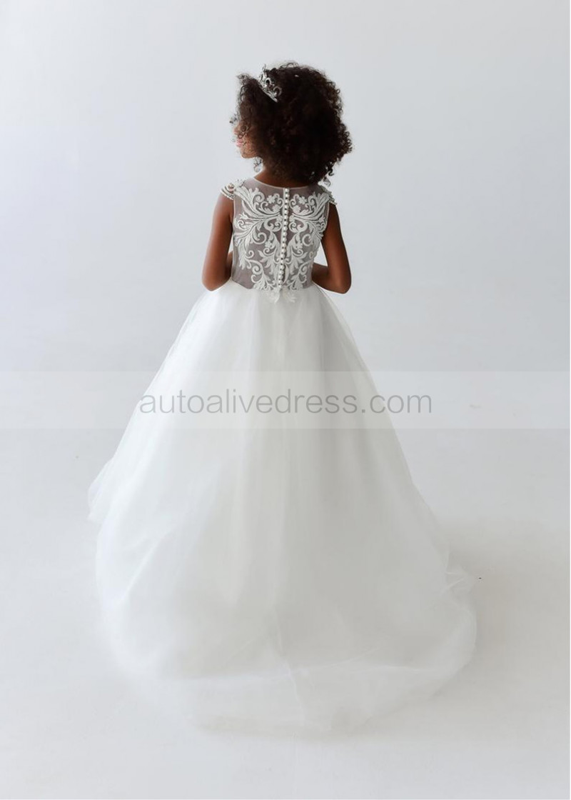 Cap Sleeves Beaded Ivory Lace Tulle Illusion Pearl Buttons Back Flower Girl Dress