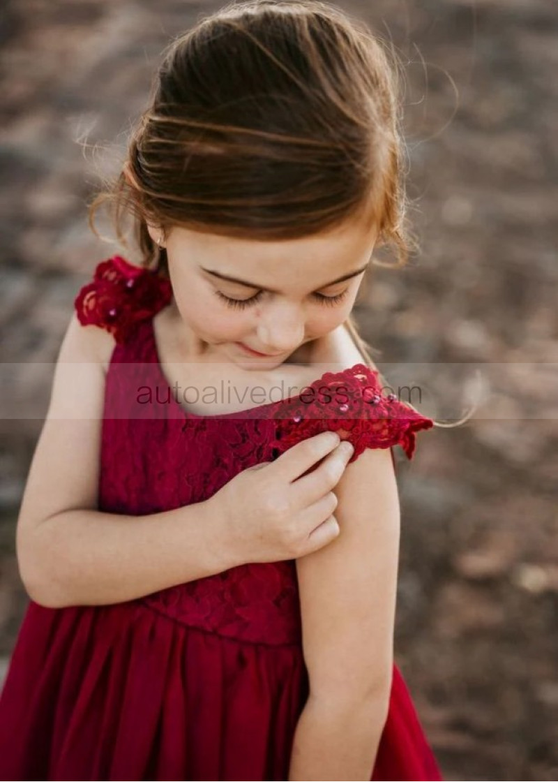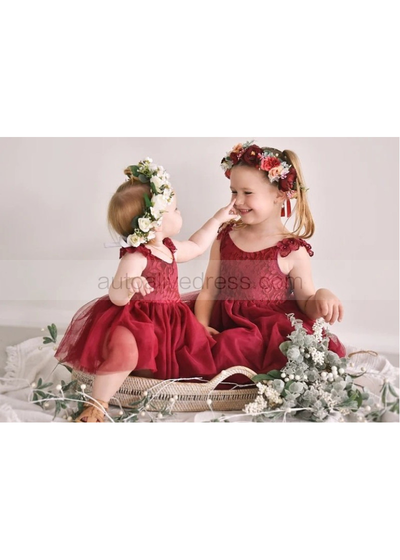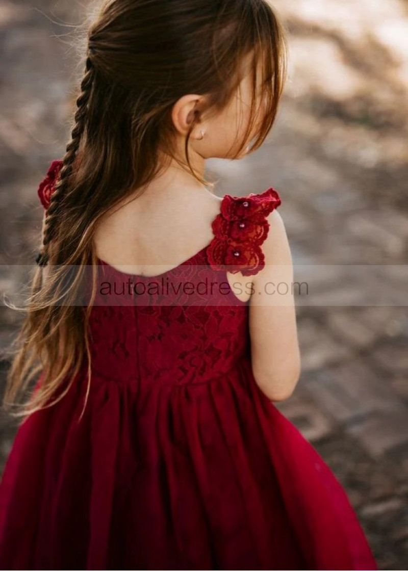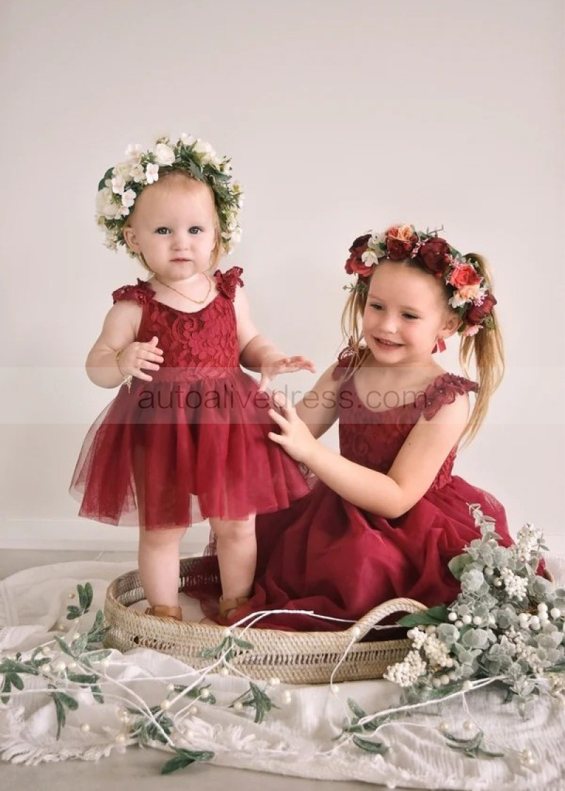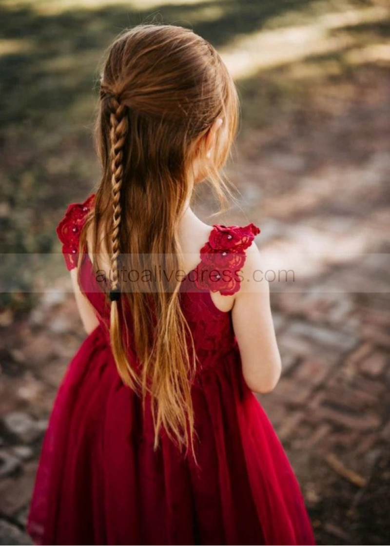 Cap Sleeves Burgundy Lace Tulle Flower Girl Dress
