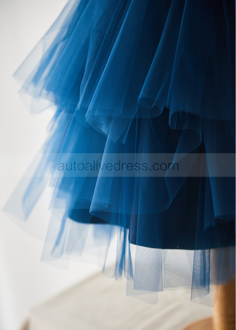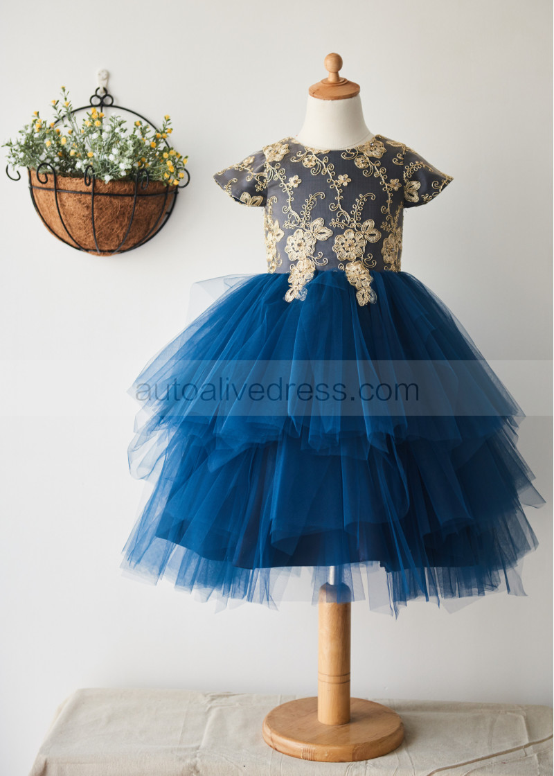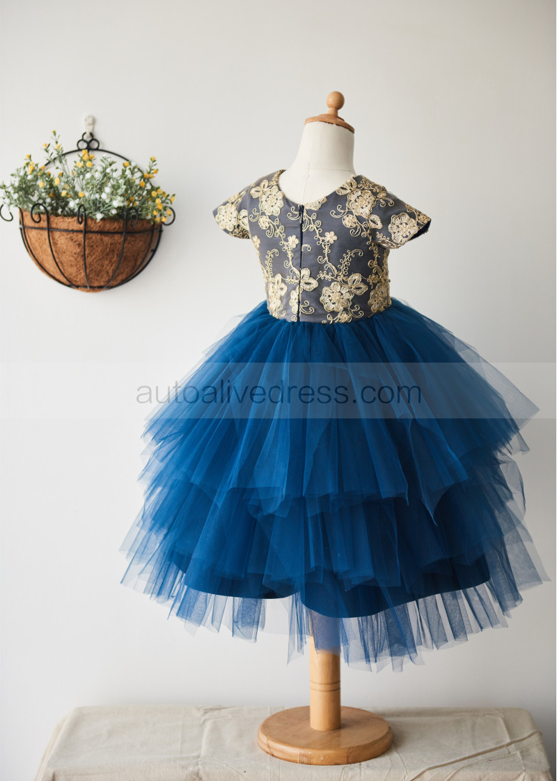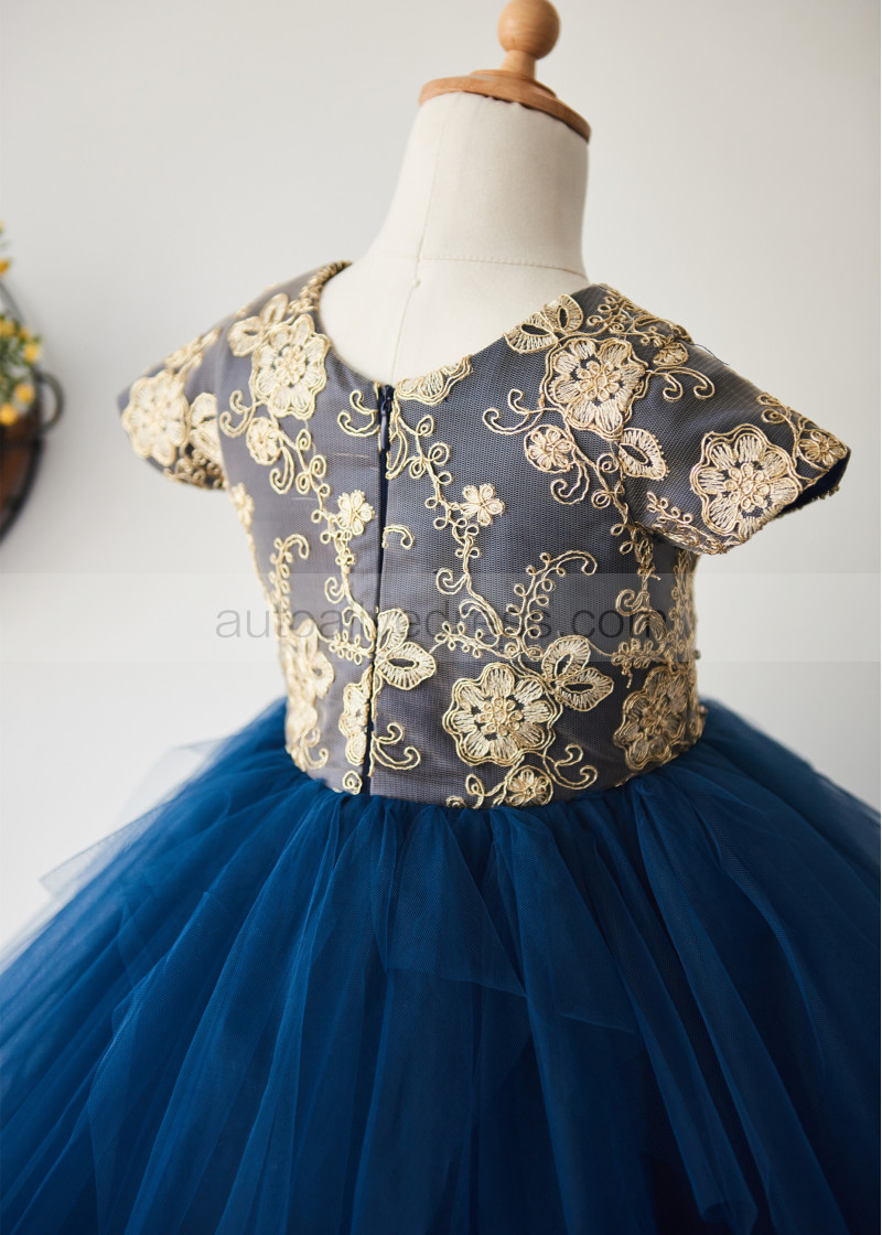 Cap Sleeves Gold Lace Navy Blue Tulle Tea Length Flower Girl Dress