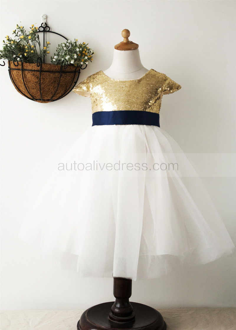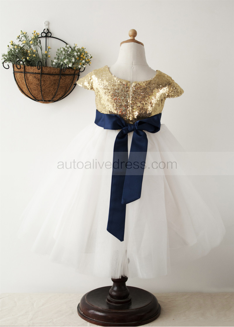 Shown Color | Gold Sequin, Ivory Tulle With Navy Blue Sash |
