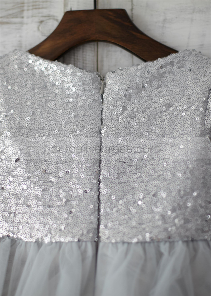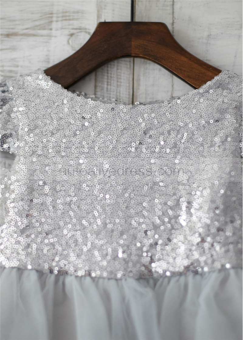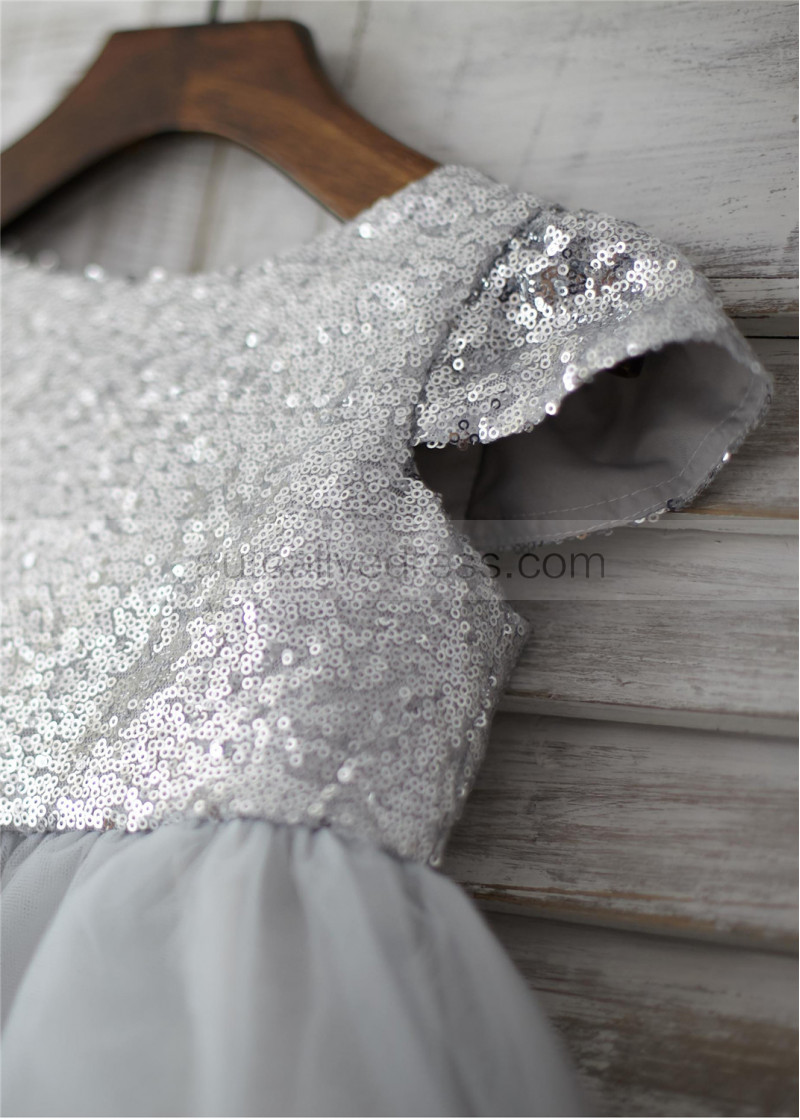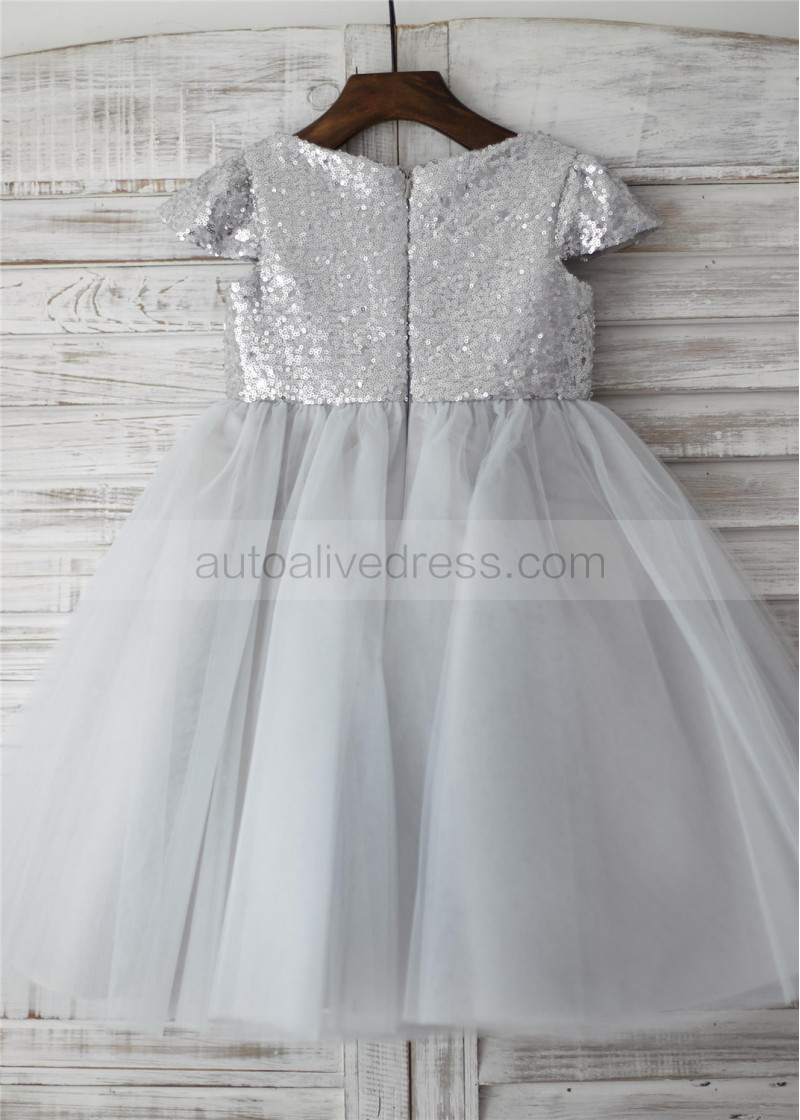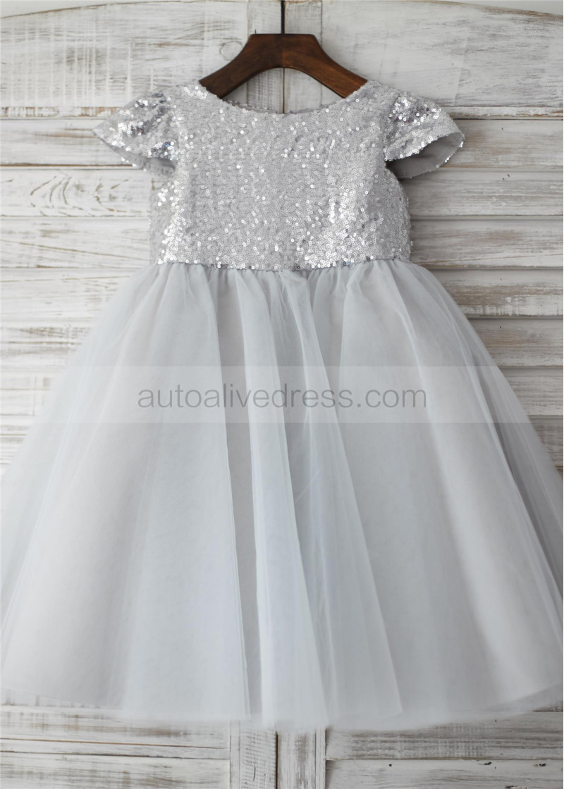 Cap Sleeves Silver Sequin Tulle Wedding Flower Girl Dress