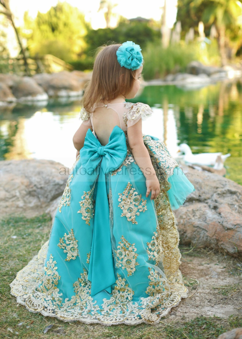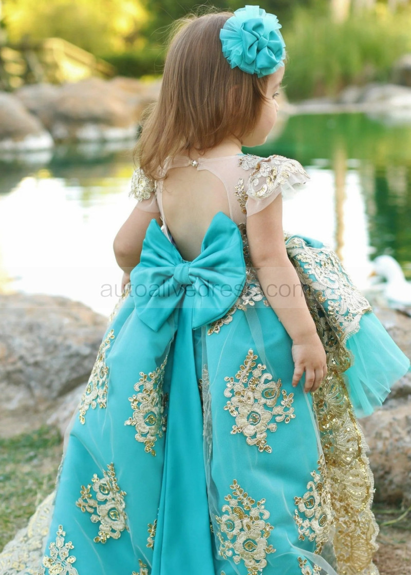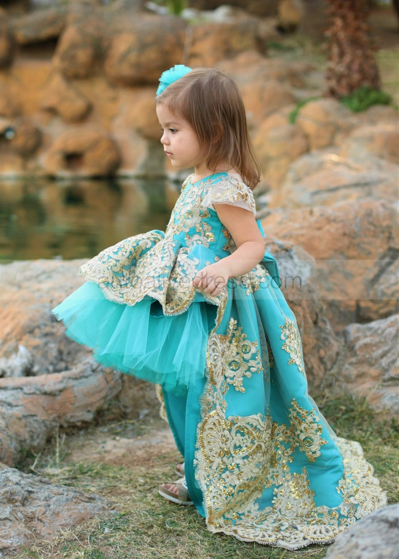 Cap Sleeves Turquoise High Low Flower Girl Dress