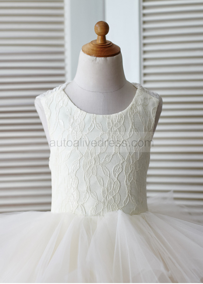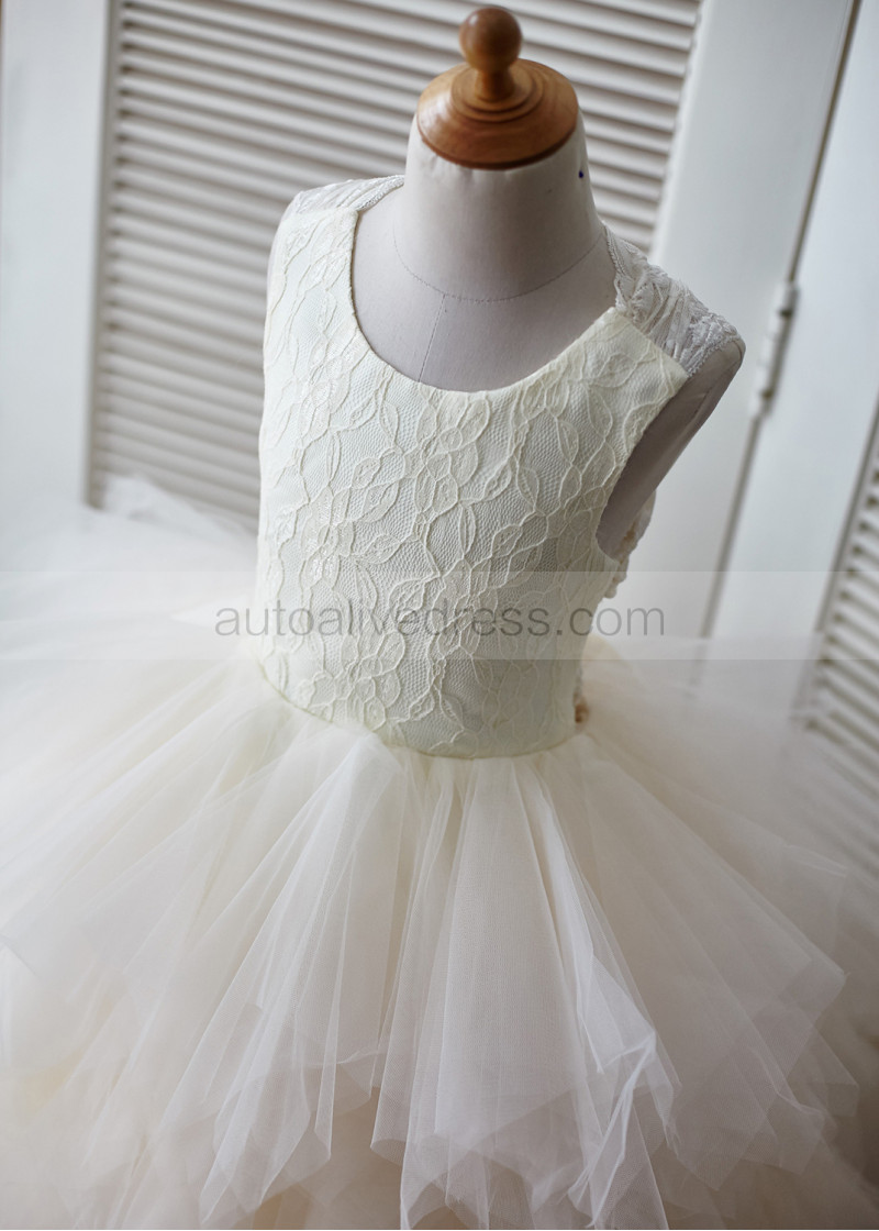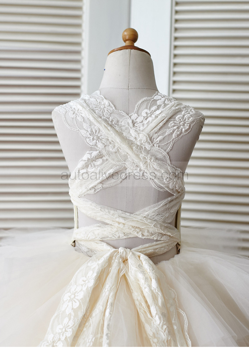 Champagne Lace Ruffled Tulle Cross Back Flower Girl Dress