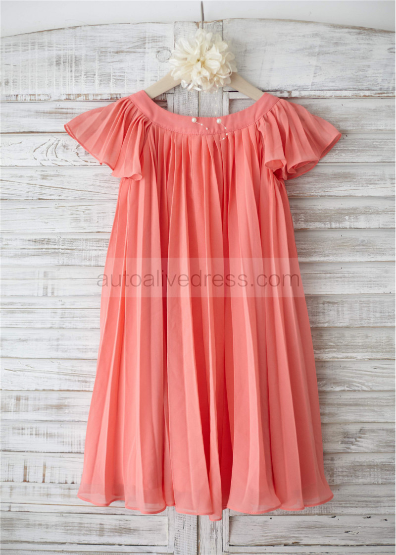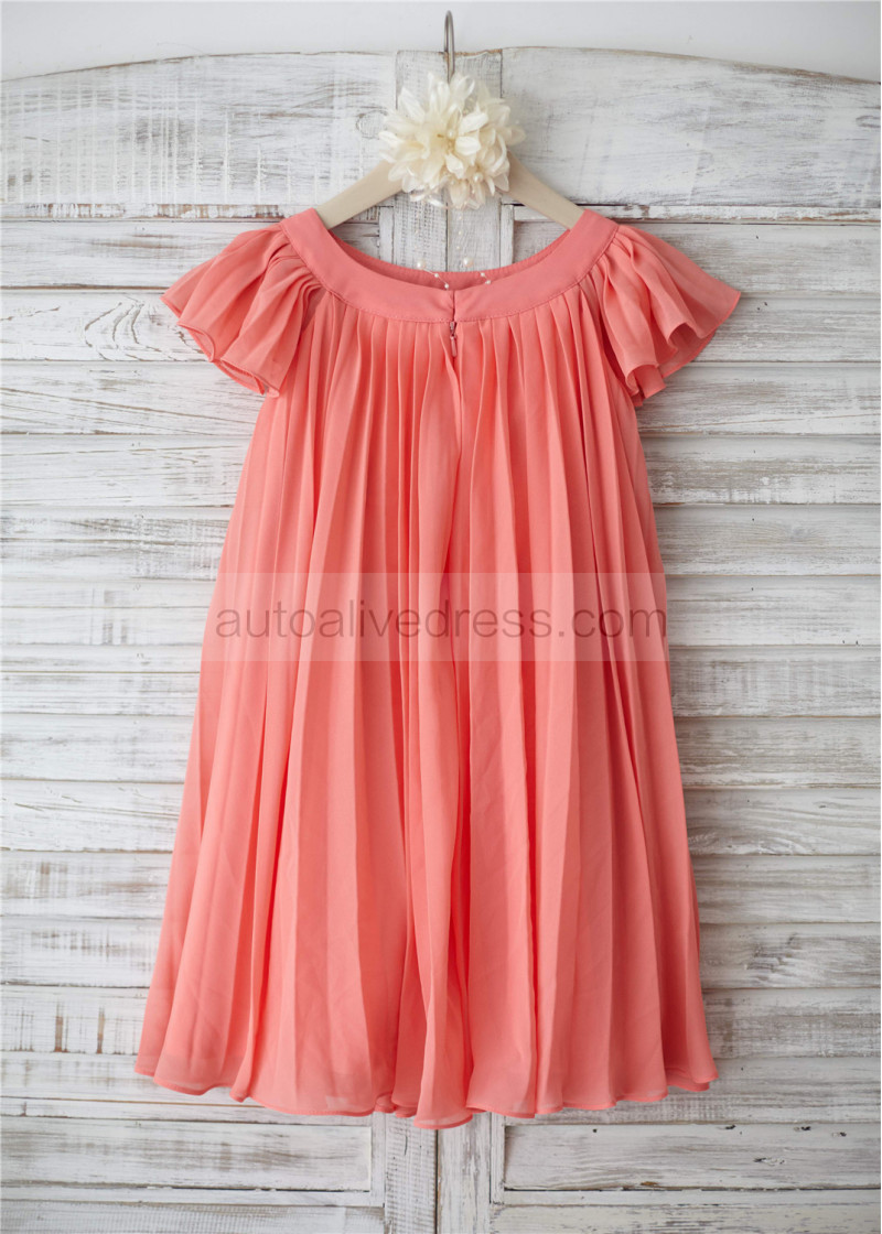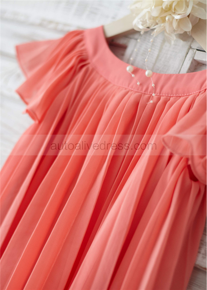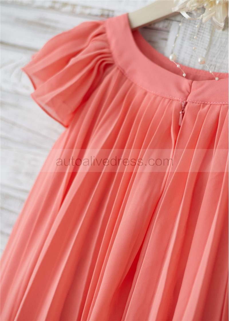 Coral Pleated Chiffon Knee Length Flower Girl Dress