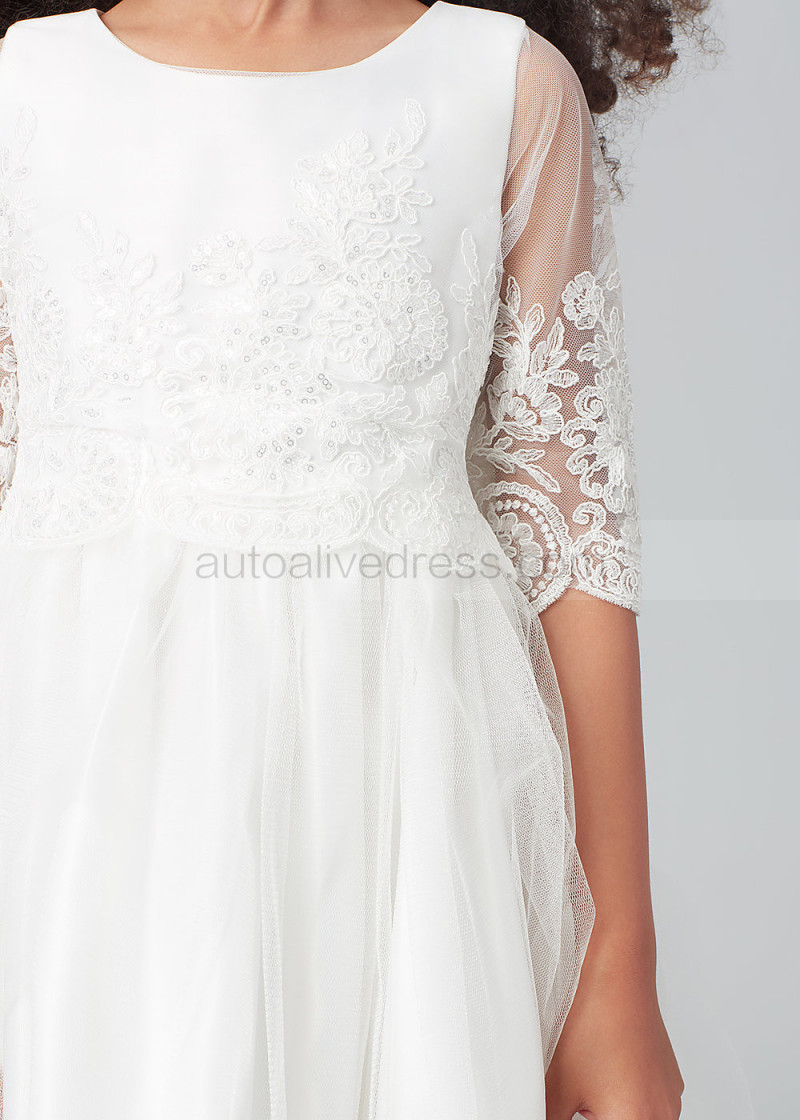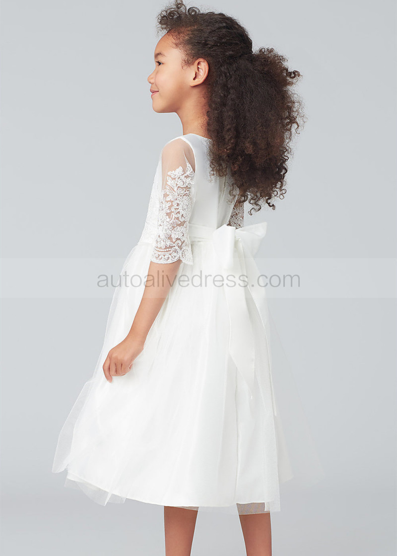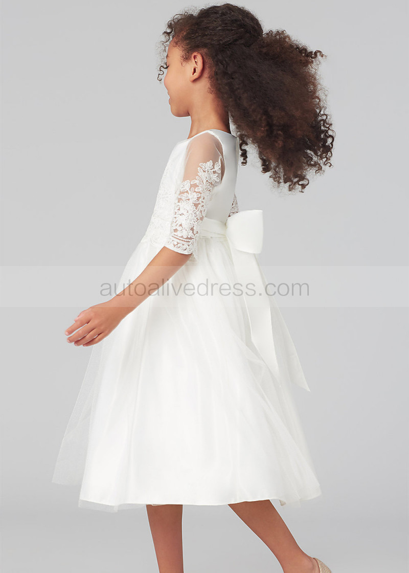 Elbow Sleeves Ivory Lace Tulle Tea Length Flower Girl Dress