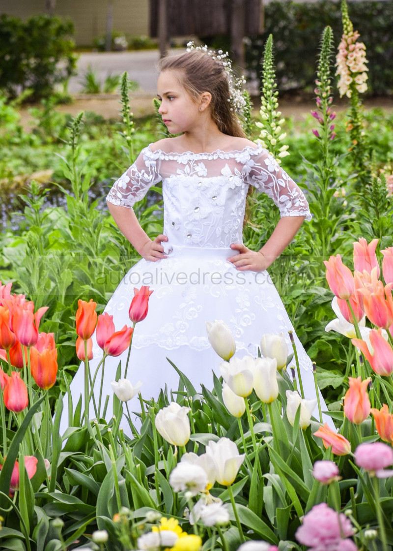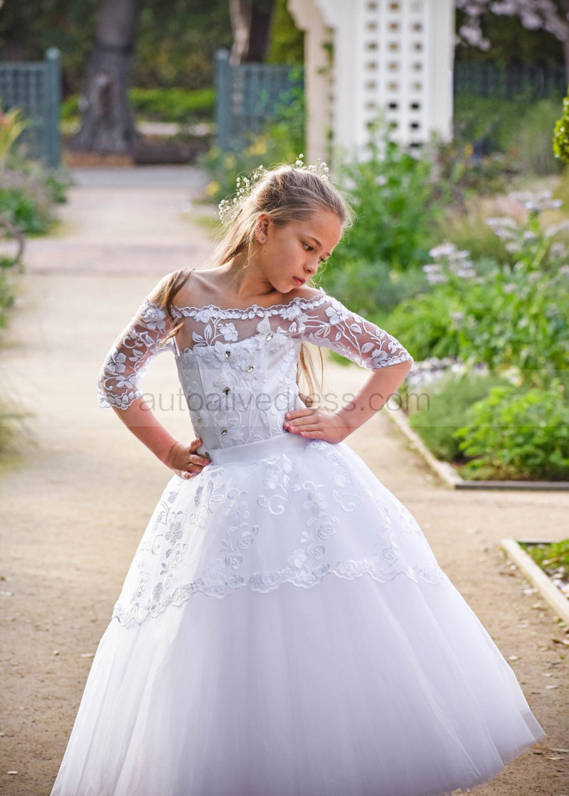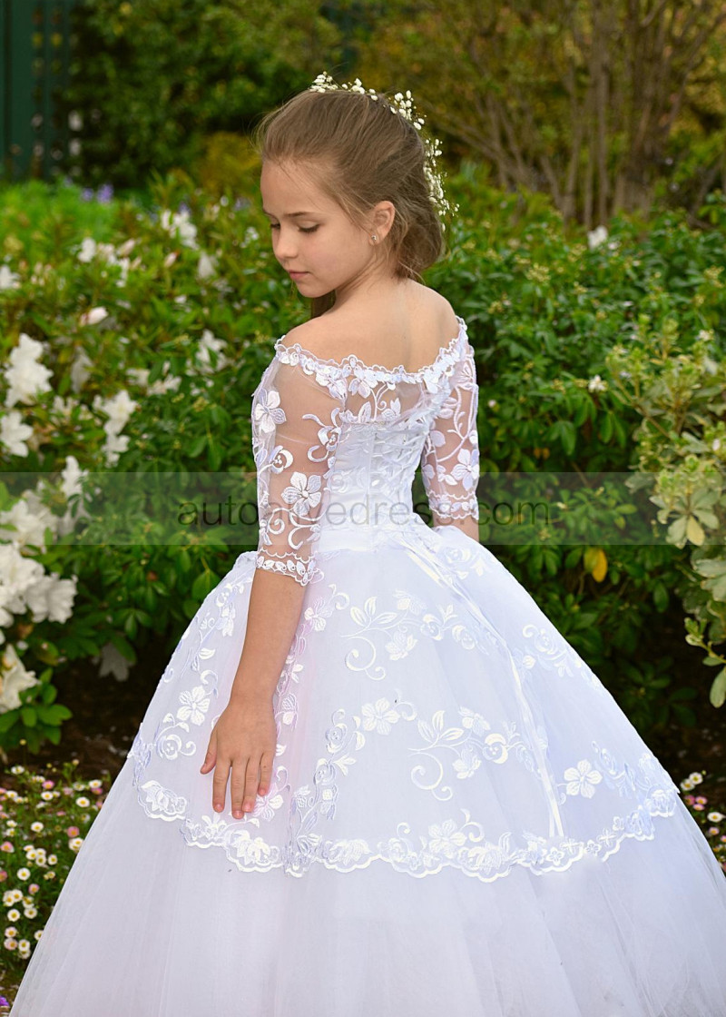 Elbow Sleeves Off Shoulder White Floral Lace Tulle Flower Girl Dress
