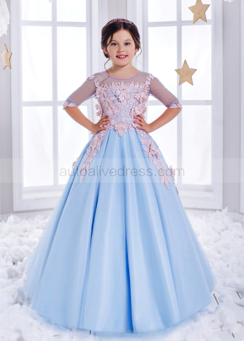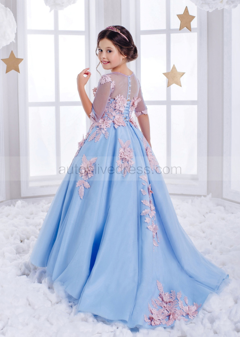 Elbow Sleeves Sky Blue Tulle Pink 3D Floral Appliques Flower Girl Dress