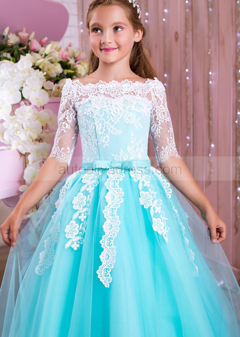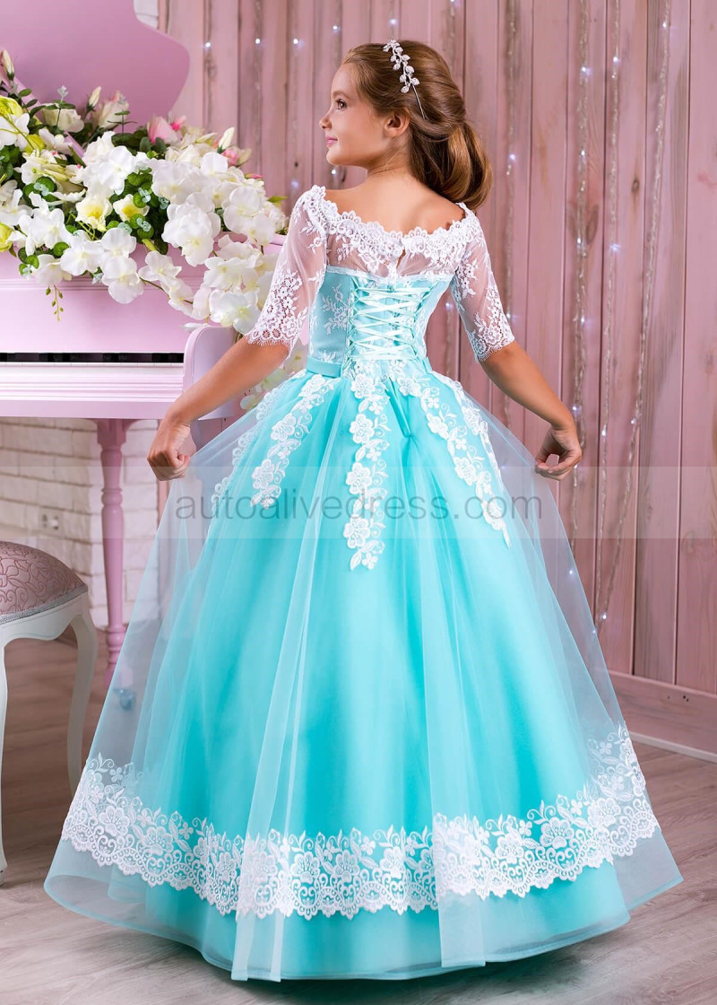 Elbow Sleeves White Lace Turquoise Tulle Unique Flower Girl Dress