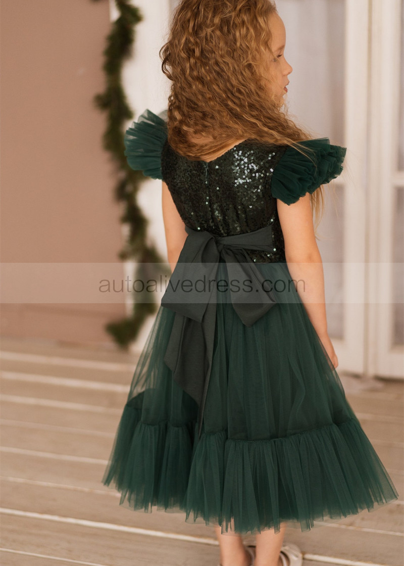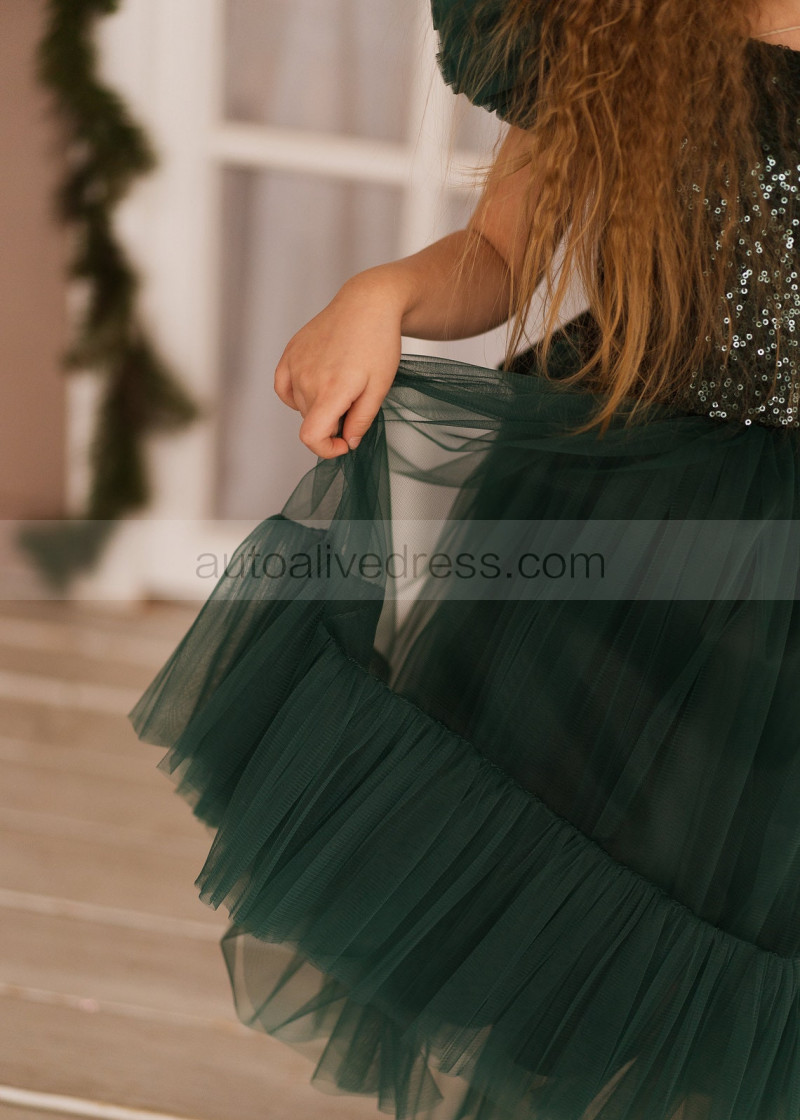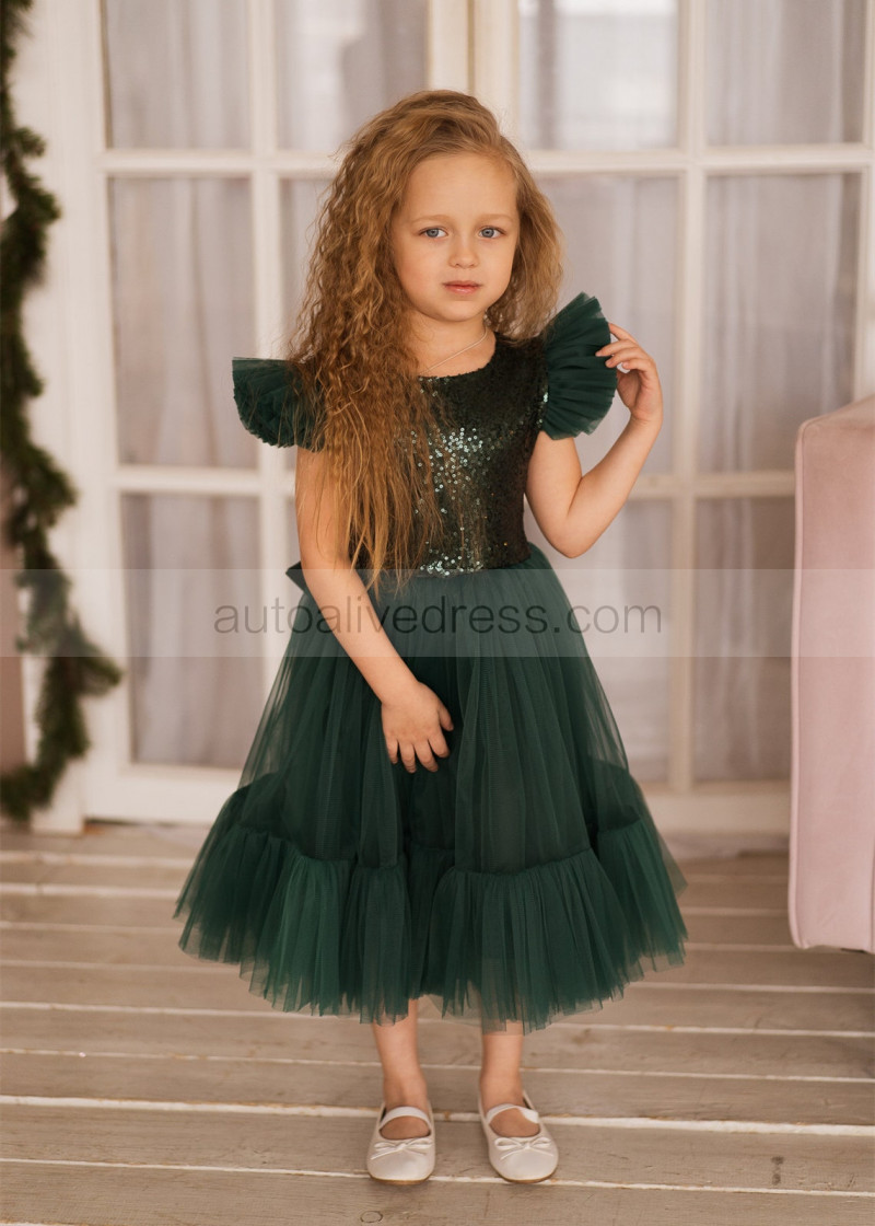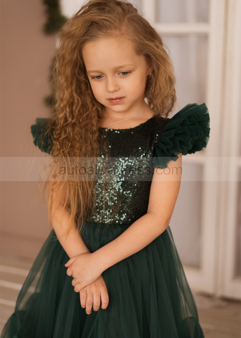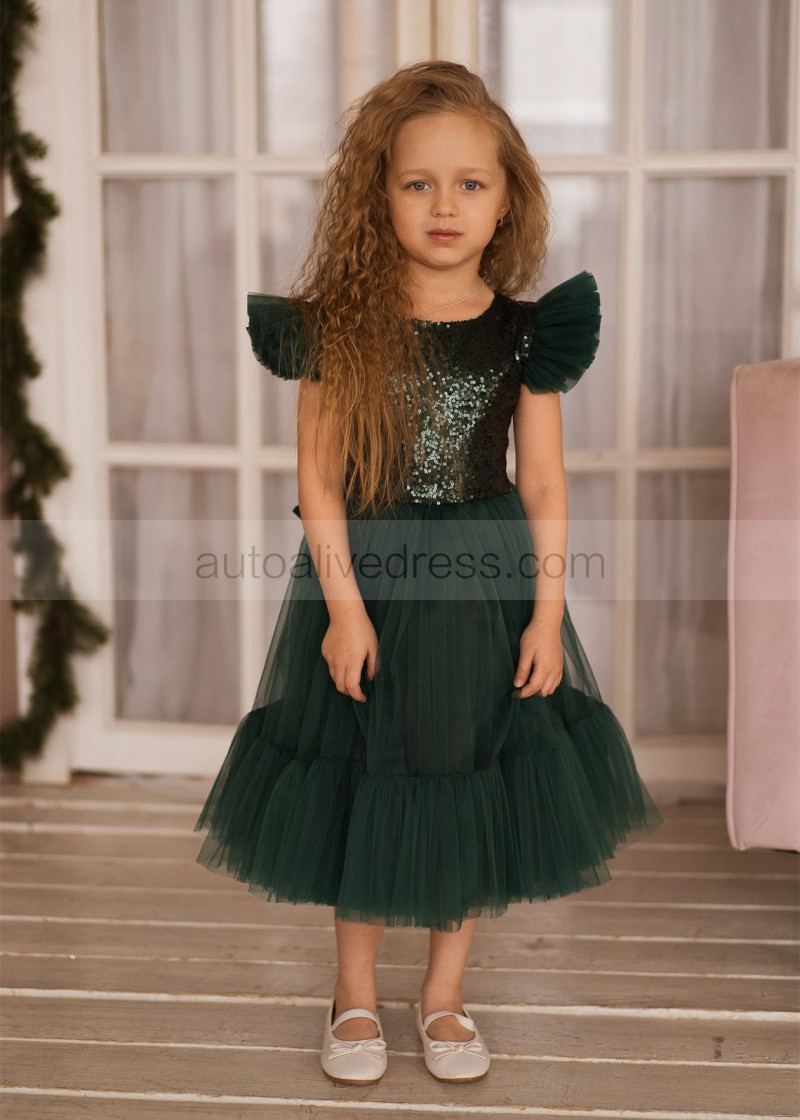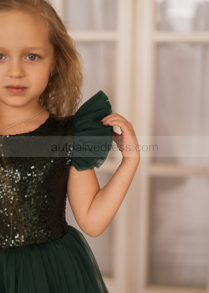Feifei Sleeves Emerald Sequin Tulle Chic Flower Girl Dress