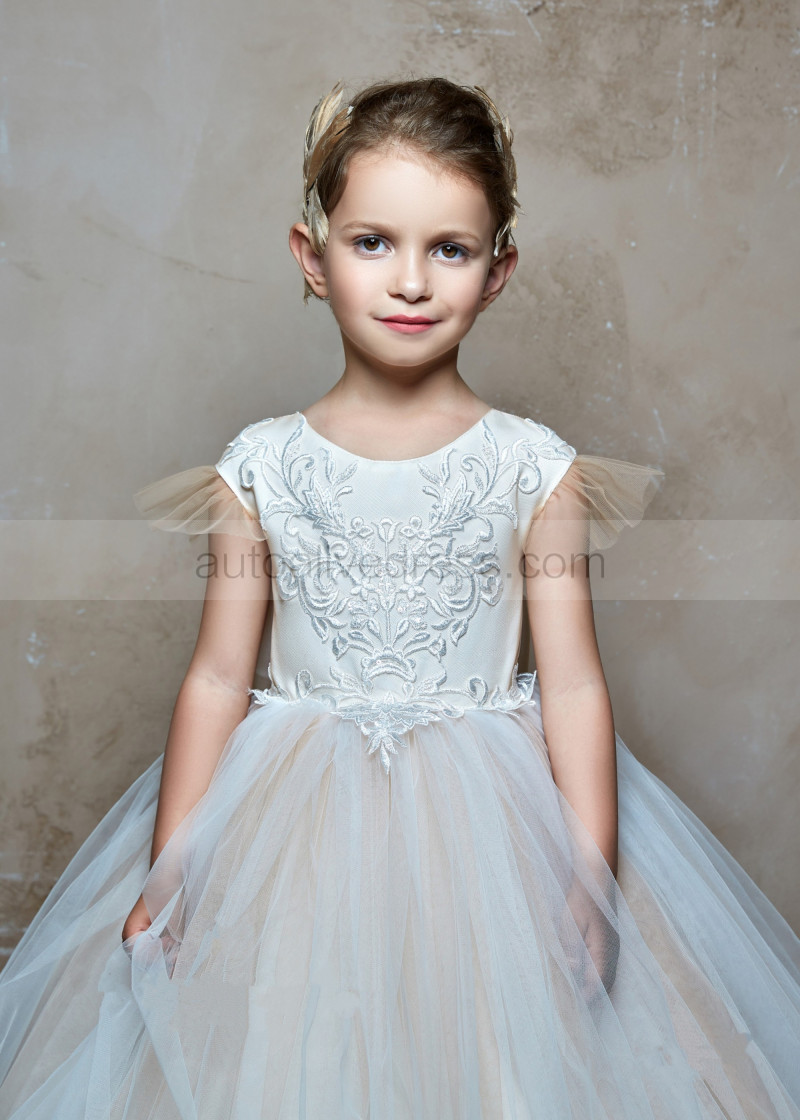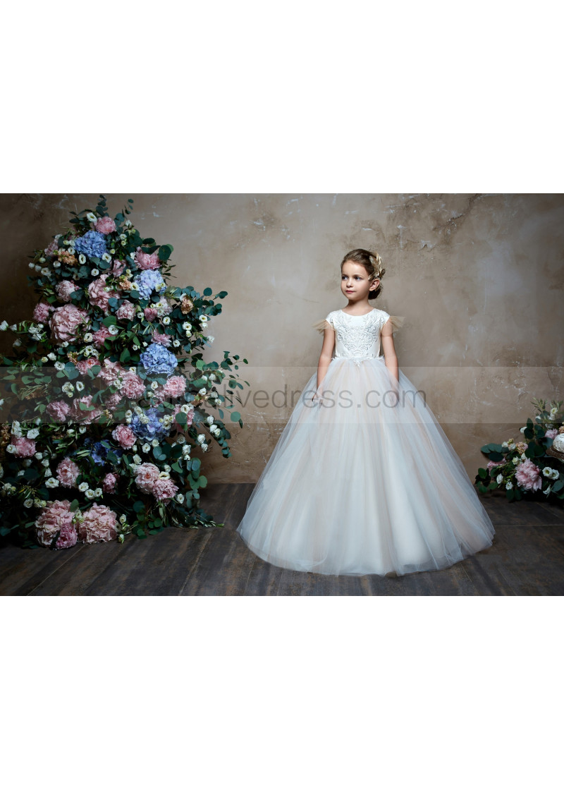 Feifei Sleeves Ivory And Cappuccino Lace Tulle Illusion Back Flower Girl Dress