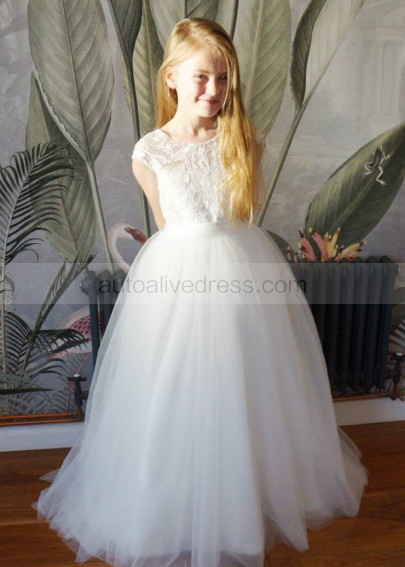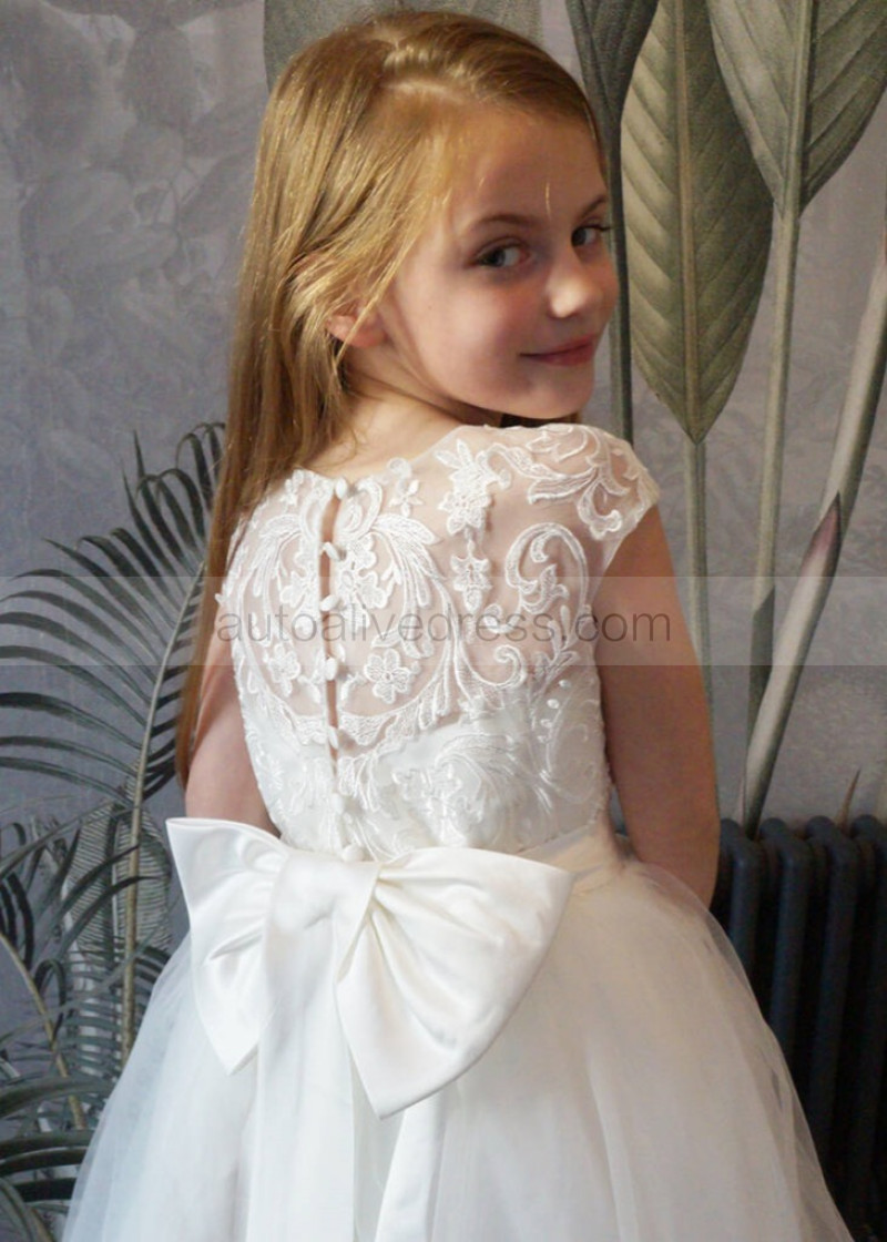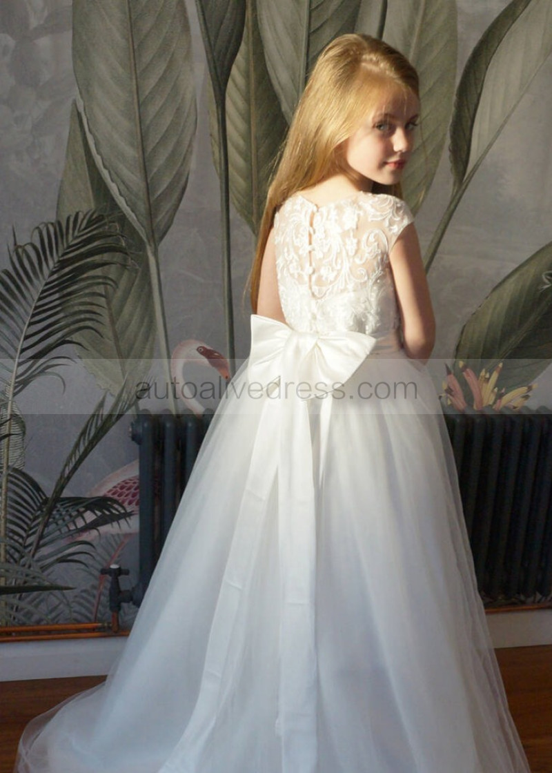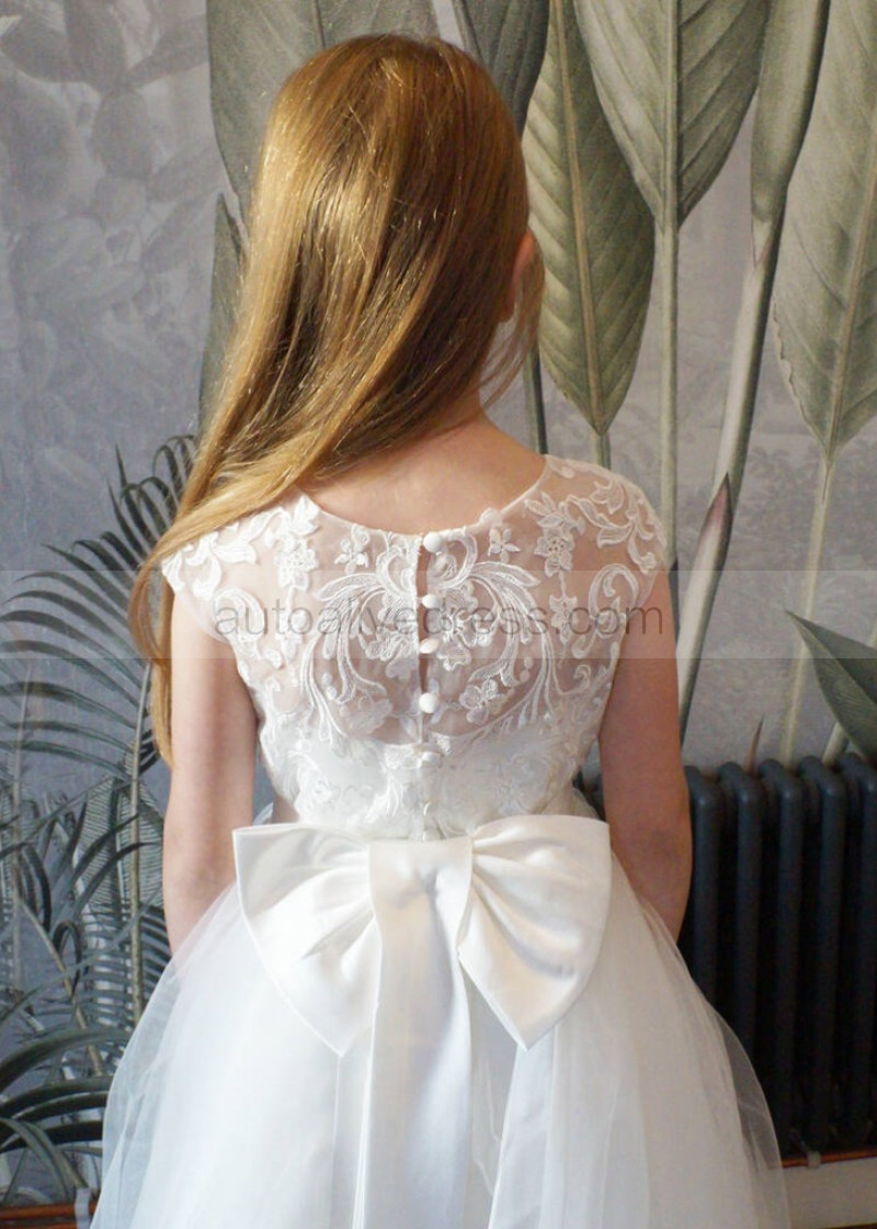 Ivory Embroidered Lace Tulle Buttons Back Flower Girl Dress