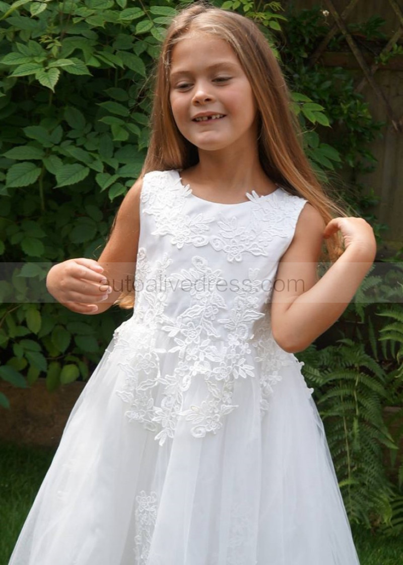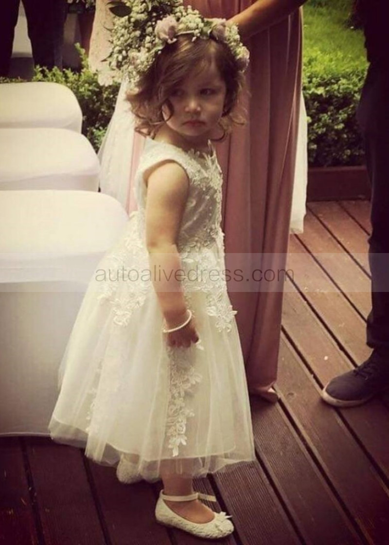 Ivory Lace Tulle Tea Length Lovely Flower Girl Dress
