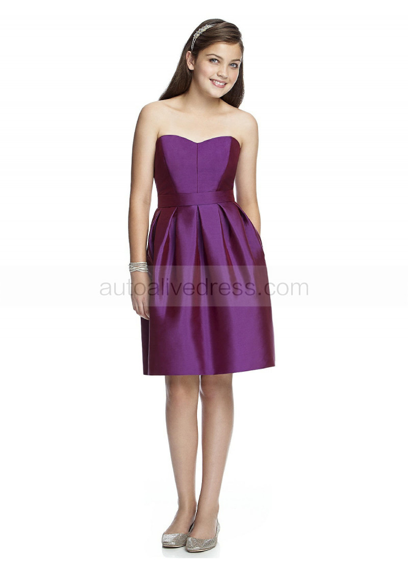 Strapless Purple Box Pleated Satin Junior Bridesmaid Dress WIth Pockets