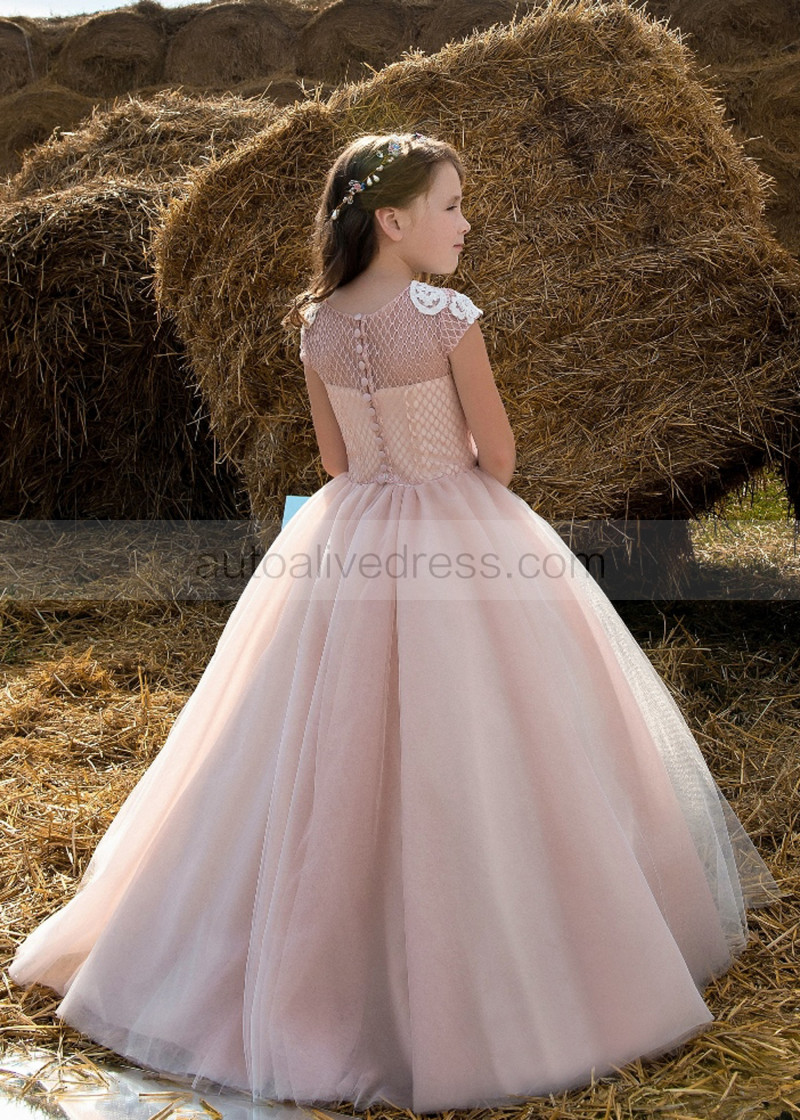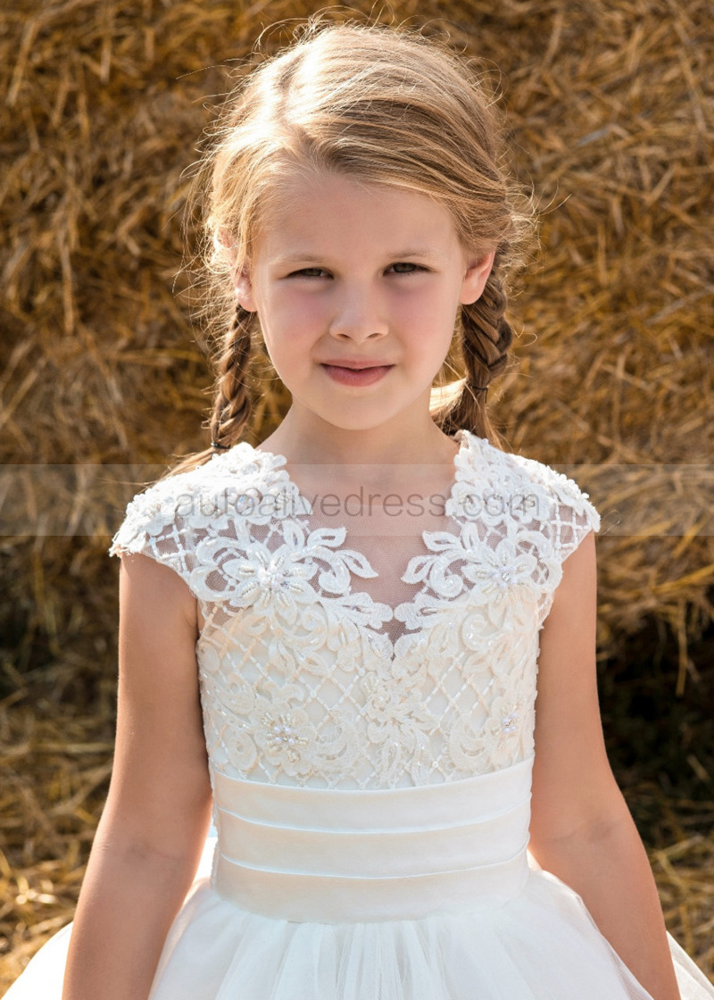Beaded Check Lace Tulle Buttons Back Flower Girl Dress