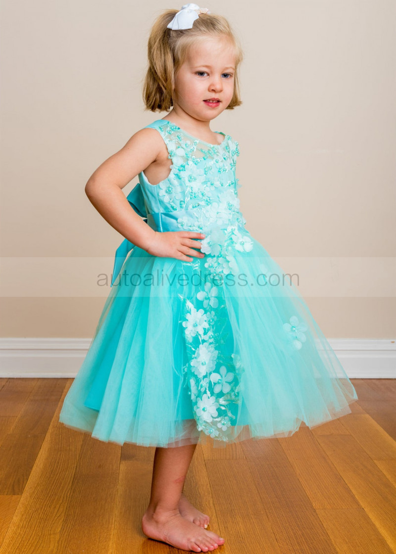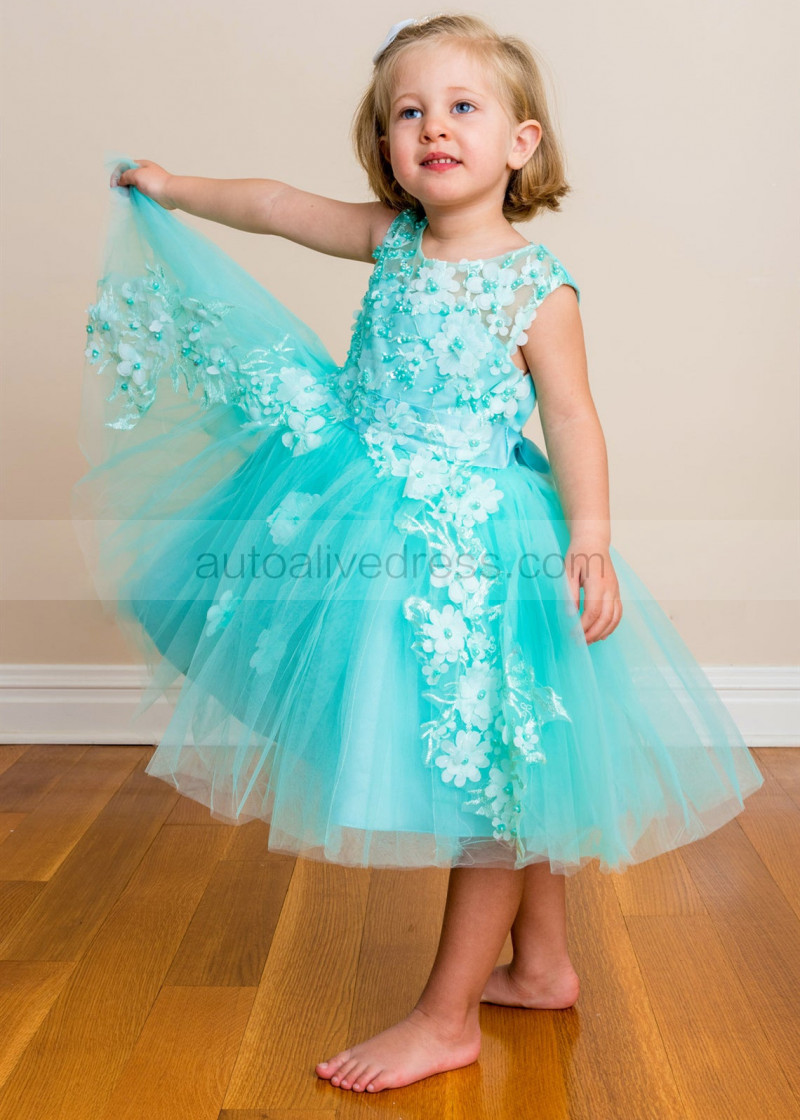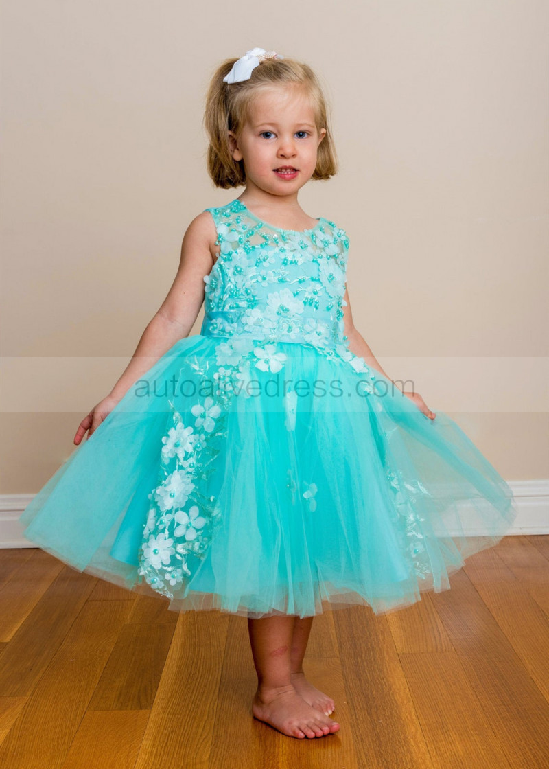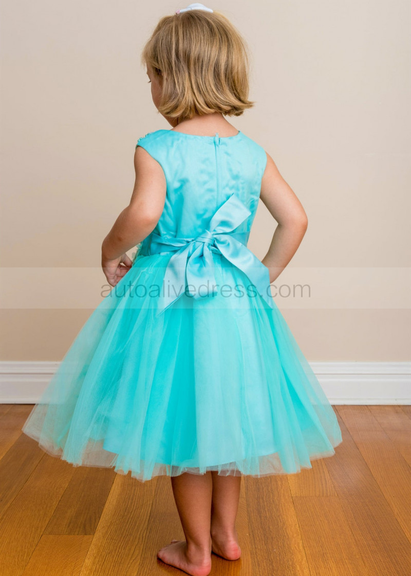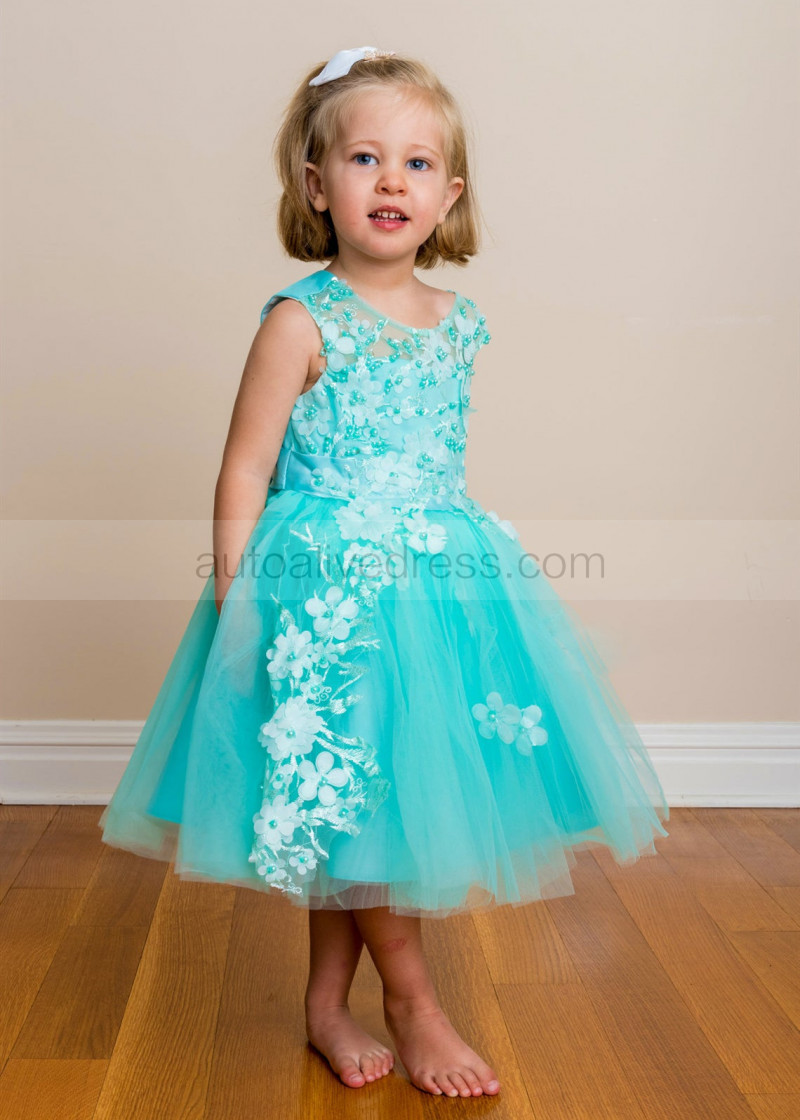 Illusion Neck Beaded Aqua Lace Tulle Flower Girl Dress