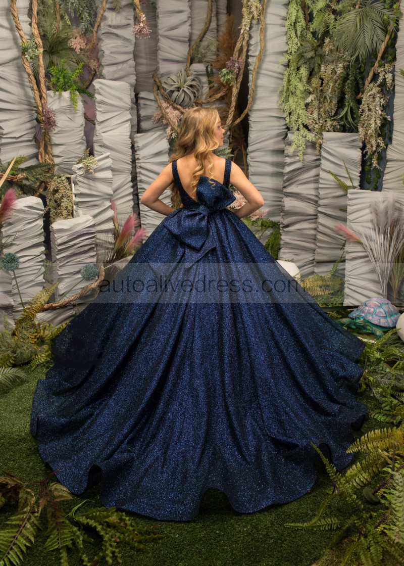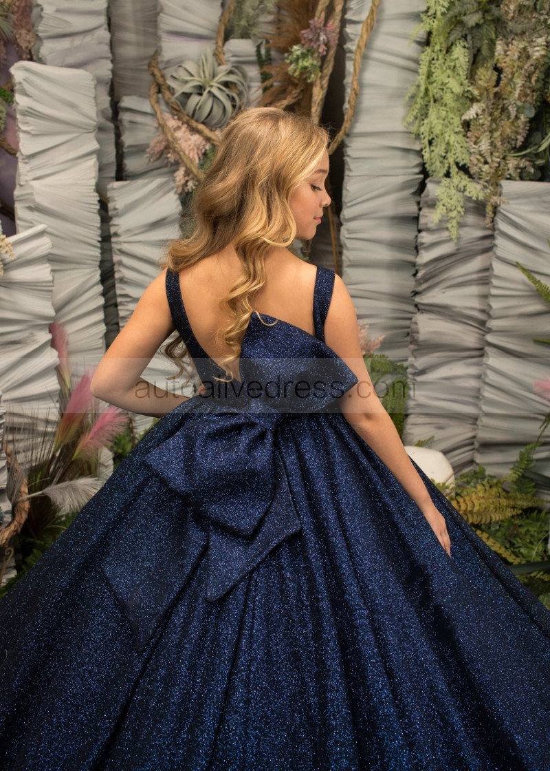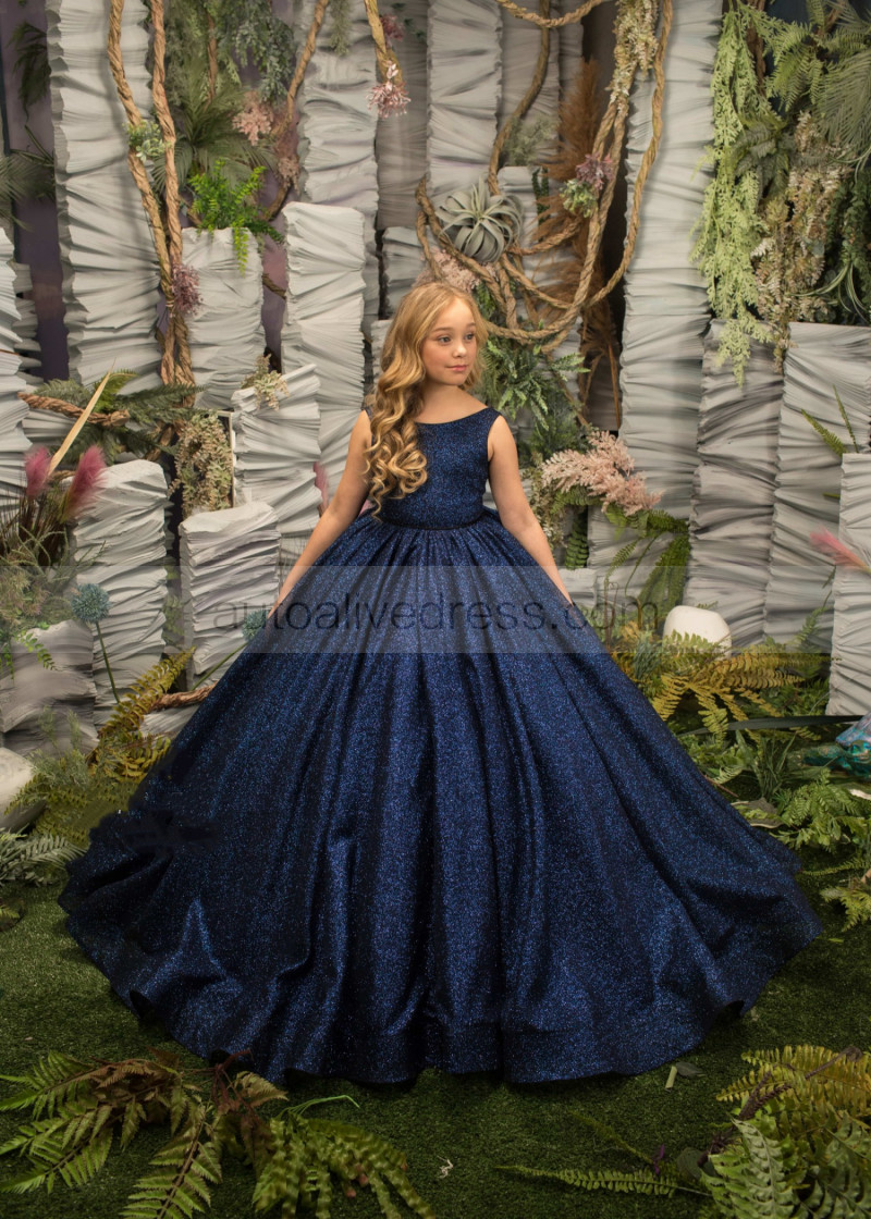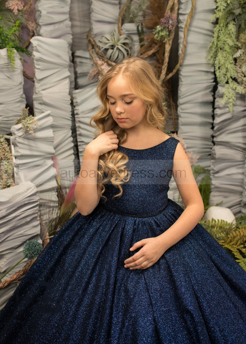 Navy Blue Glitter Tulle Floor Length Flower Girl Dress