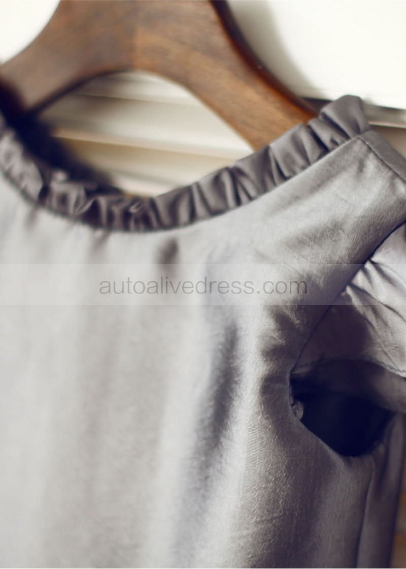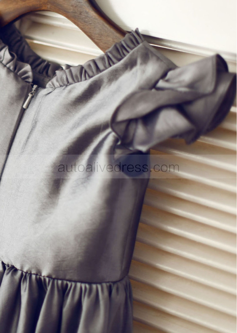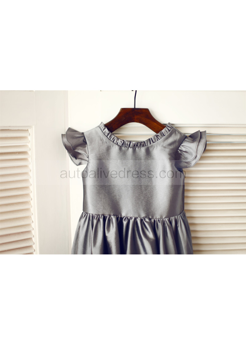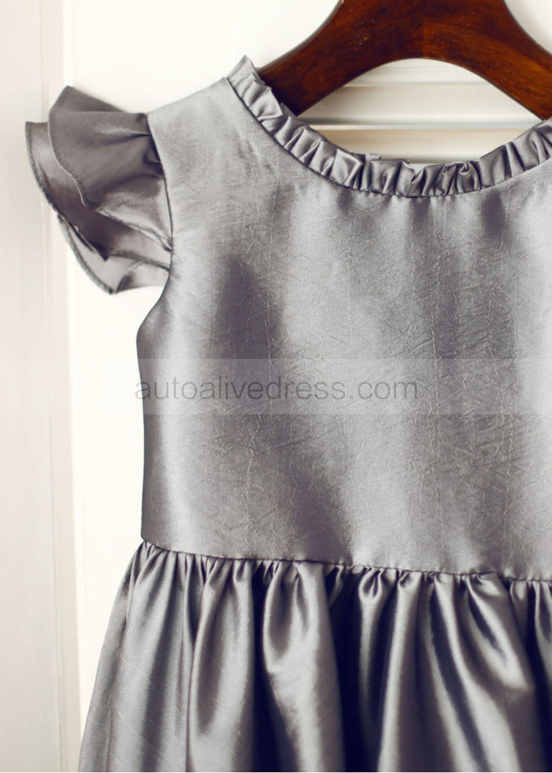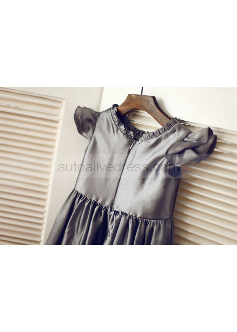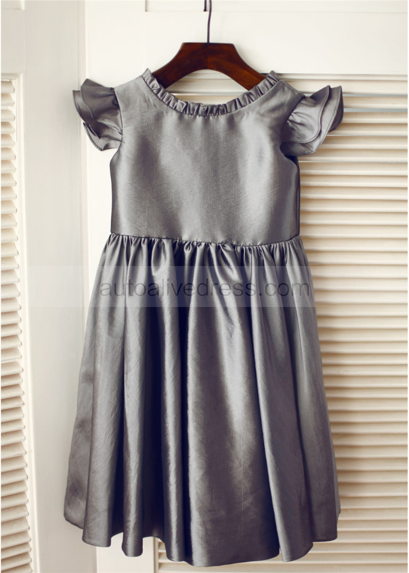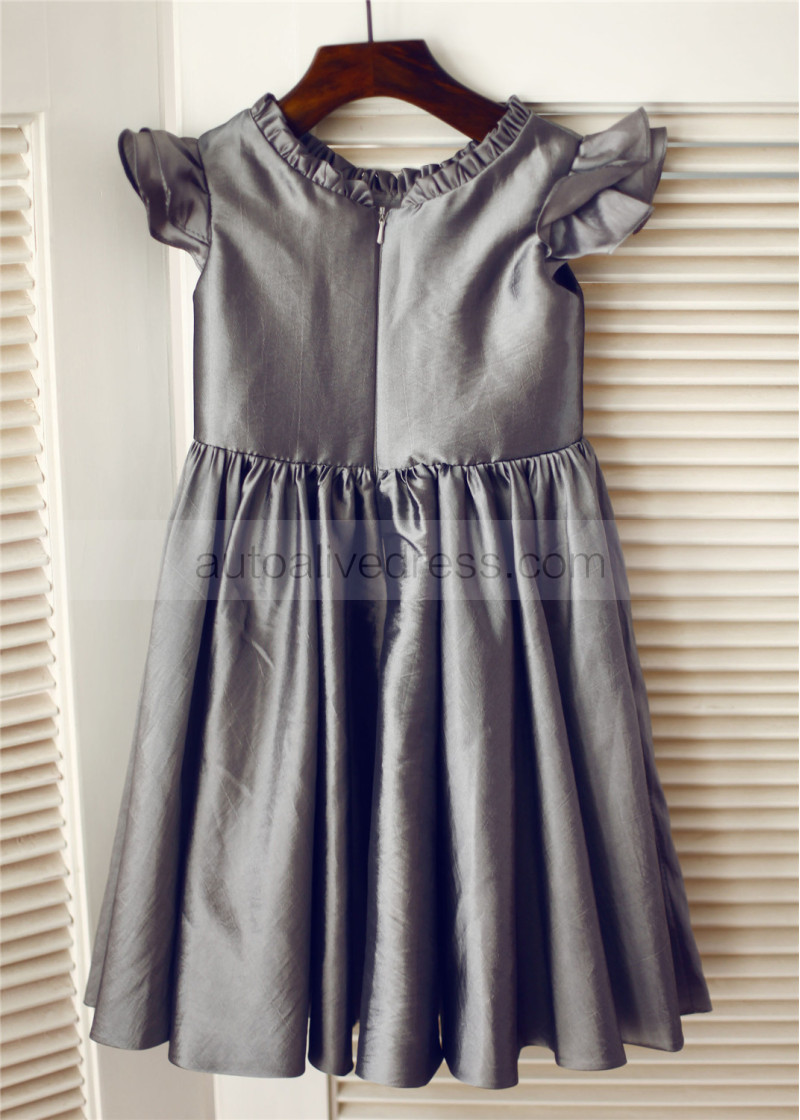 Flutter Cap Sleeves Gray Taffeta Knee Length Flower Girl Dress