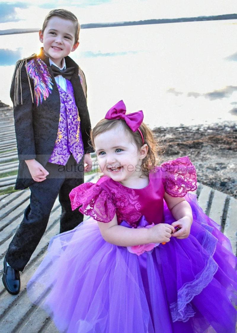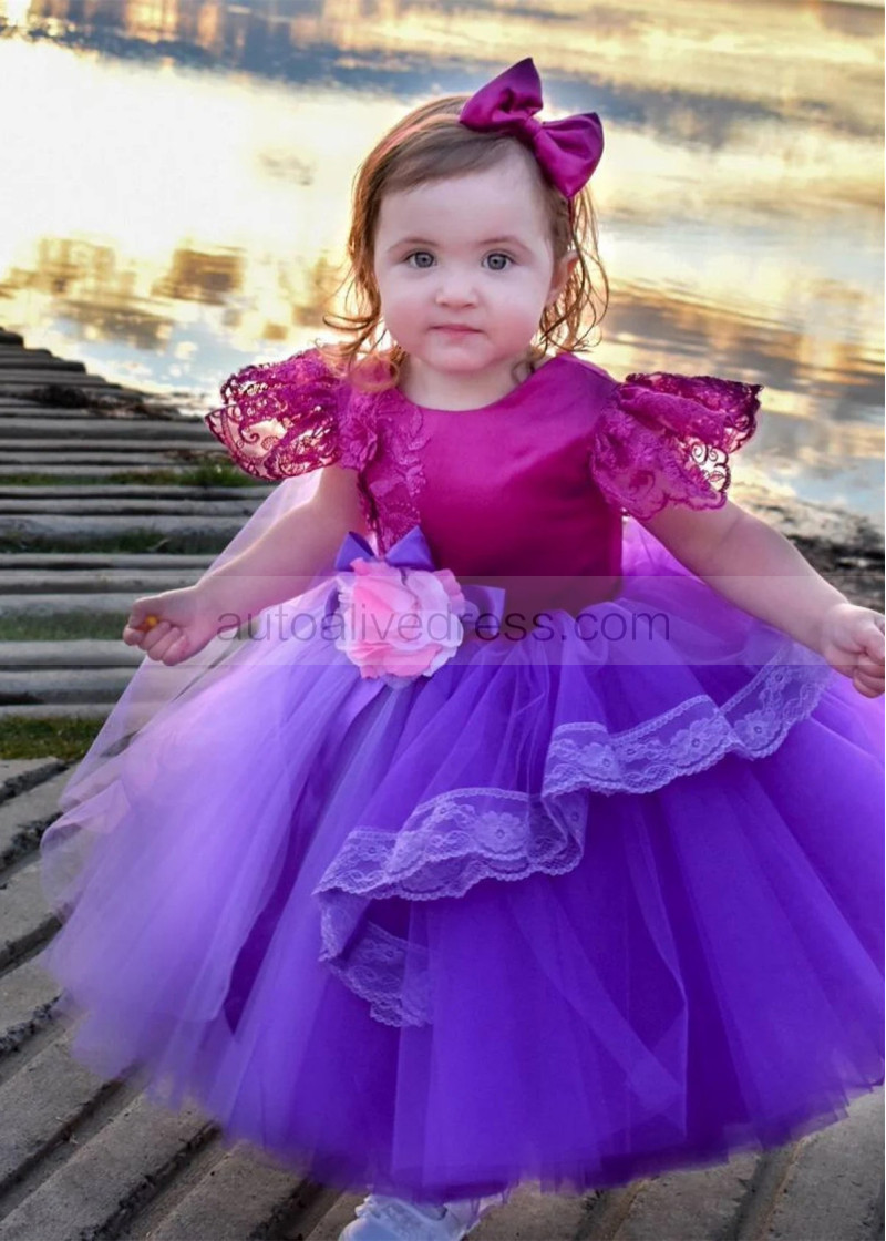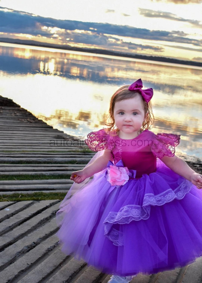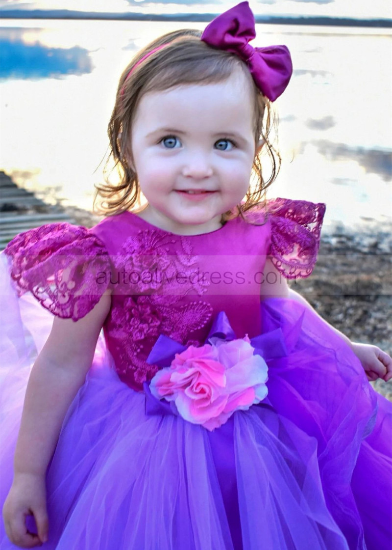Flutter Sleeves Lace Tulle Flower Girl Dress With Handmade Flower