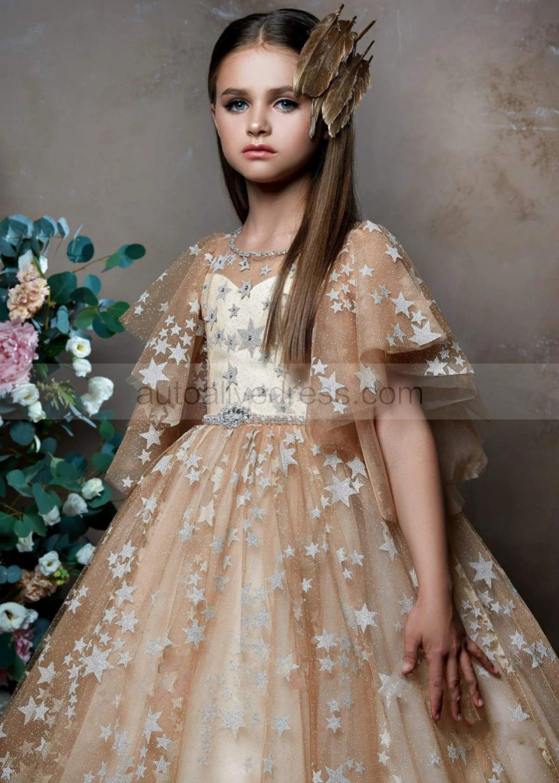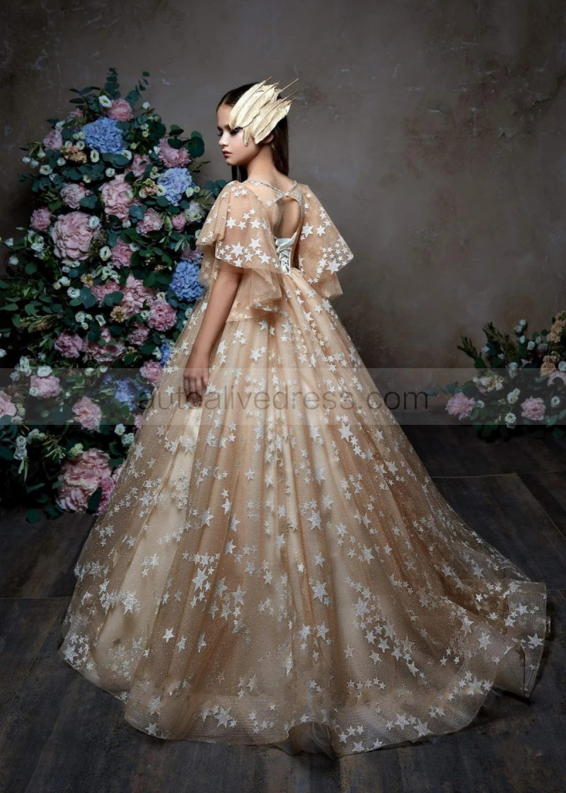 Flutter Sleeves Star Lace Tulle Keyhole Back Flower Girl Dress
