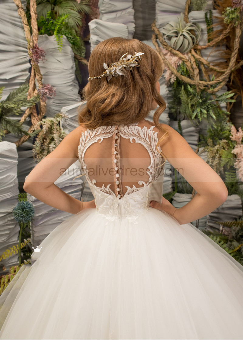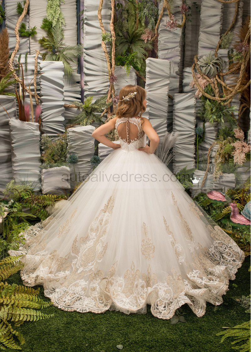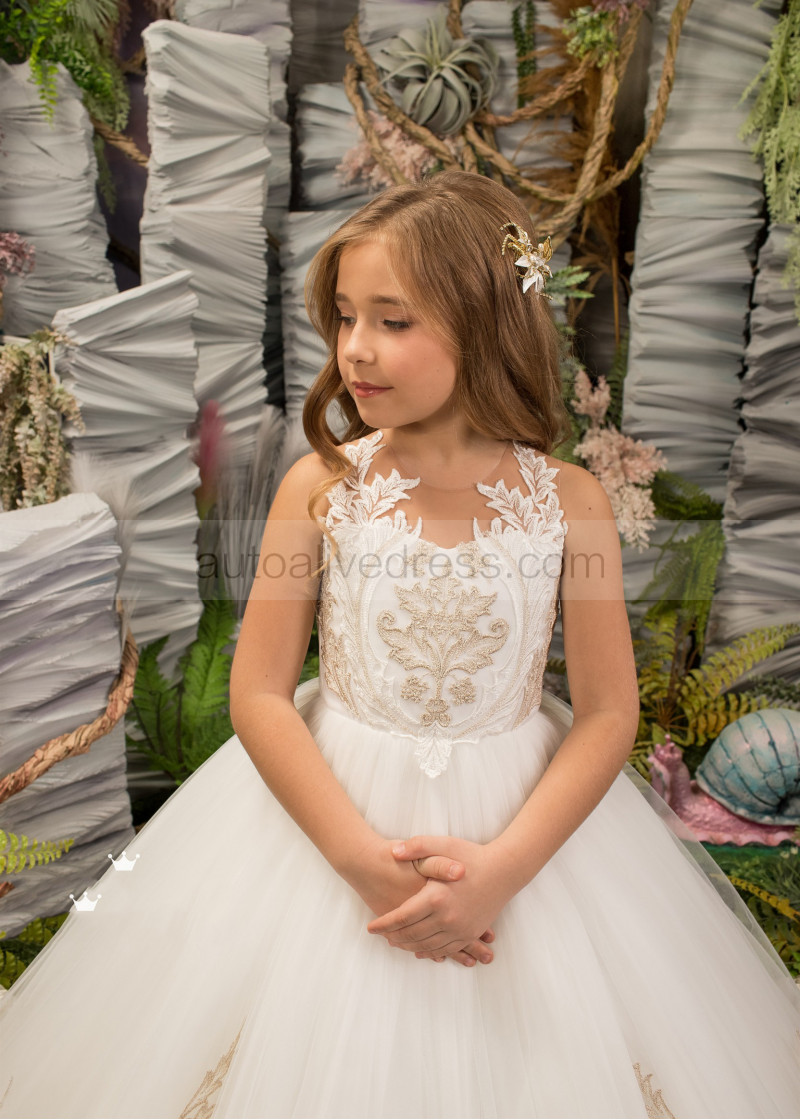 Gold Lace Ivory Tulle Floor Length Flower Girl Dress