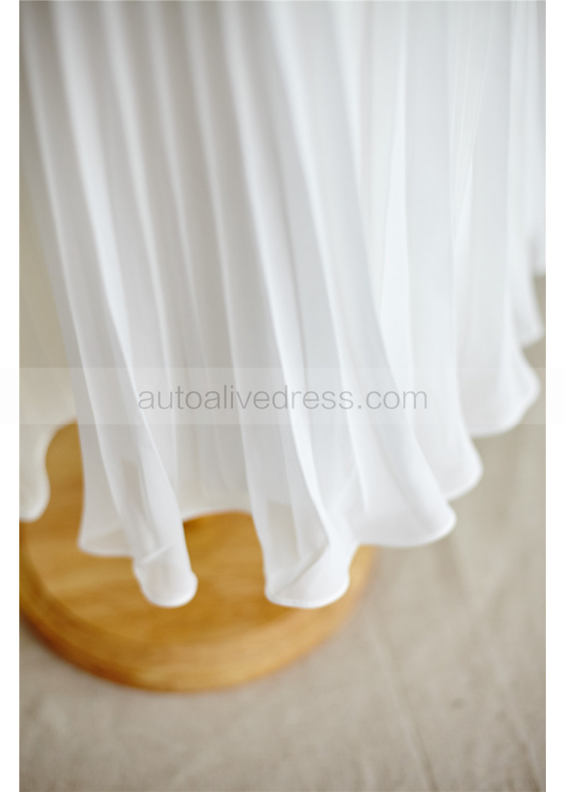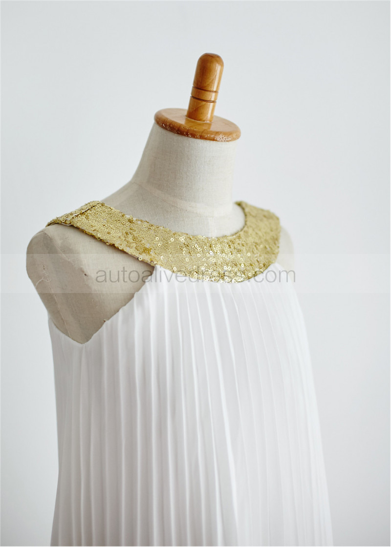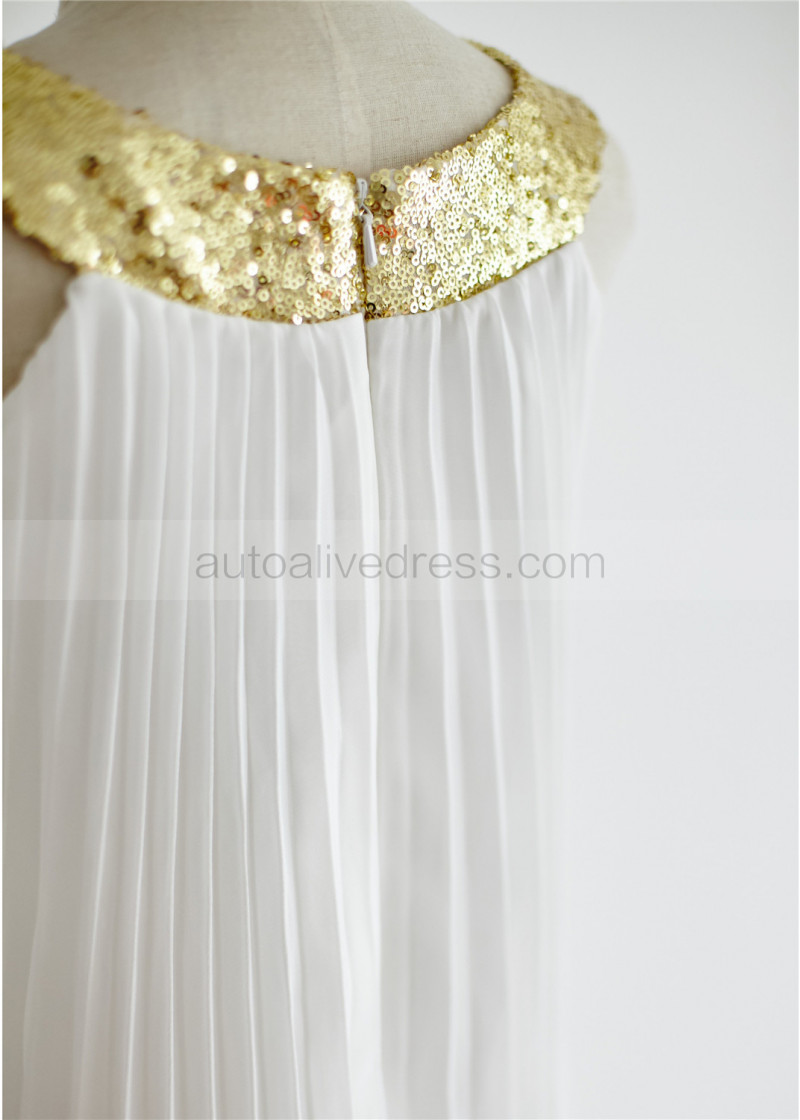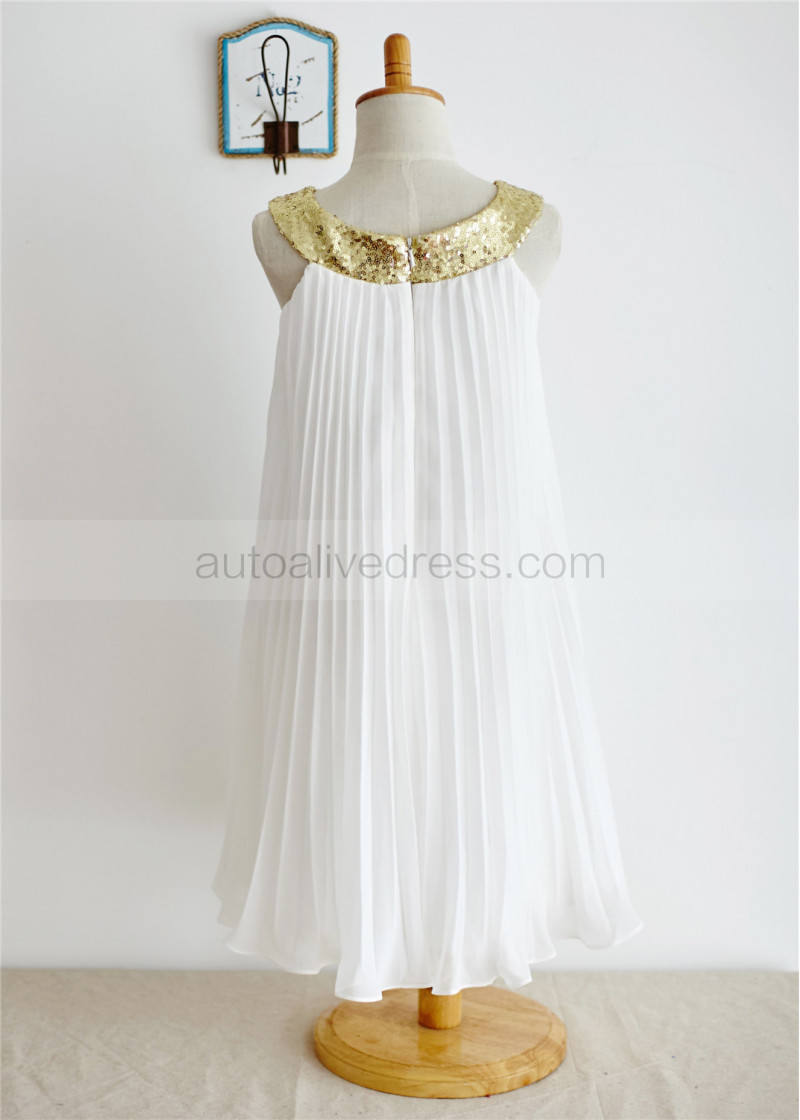 Gold Sequin Collar Ivory Pleated Chiffon Tea Length Flower Girl Dress