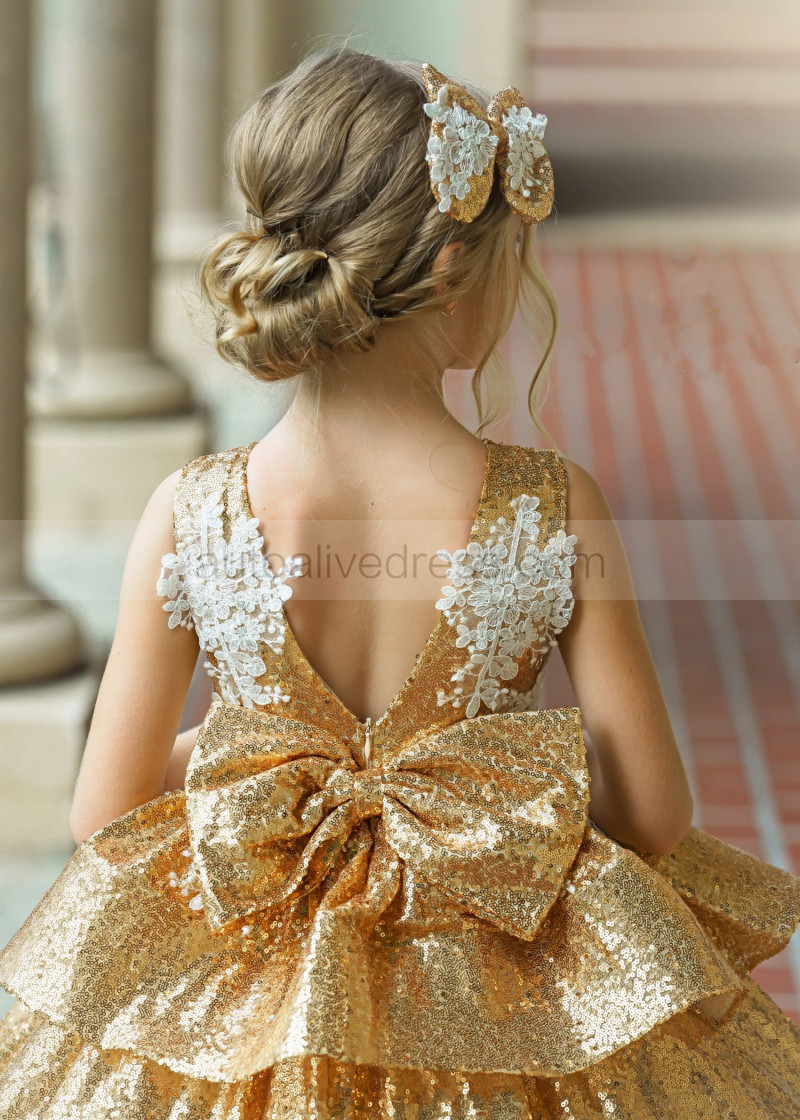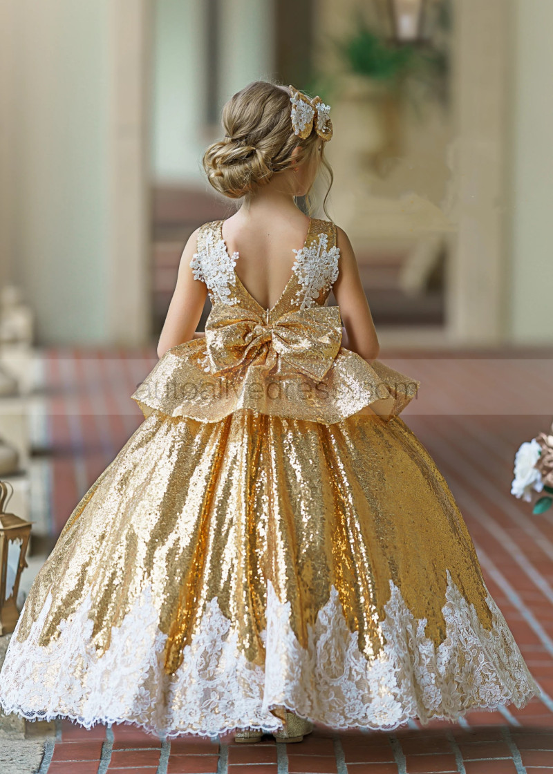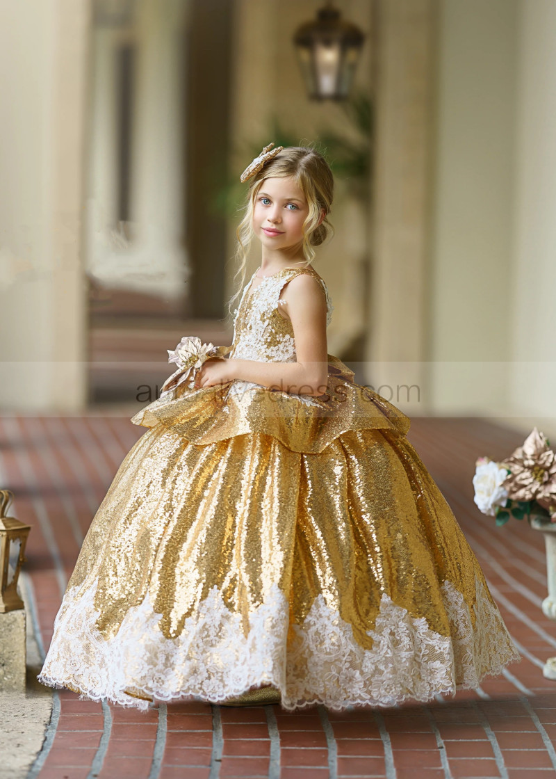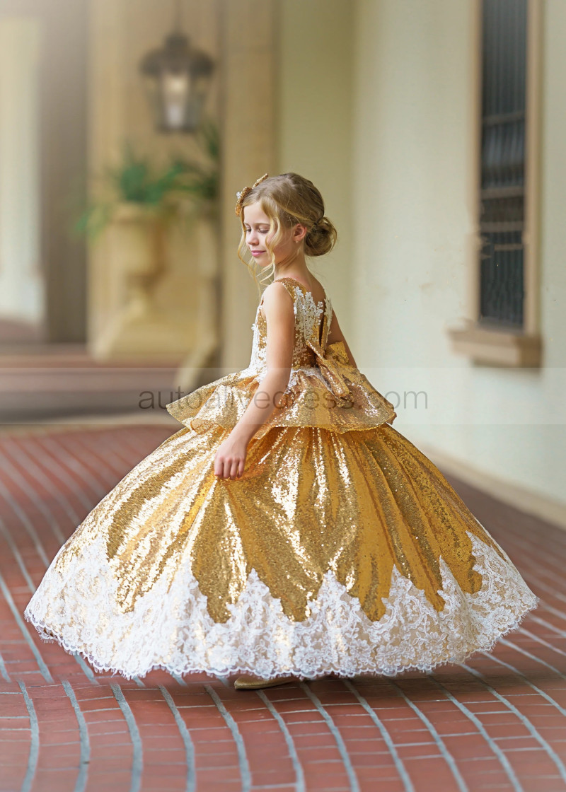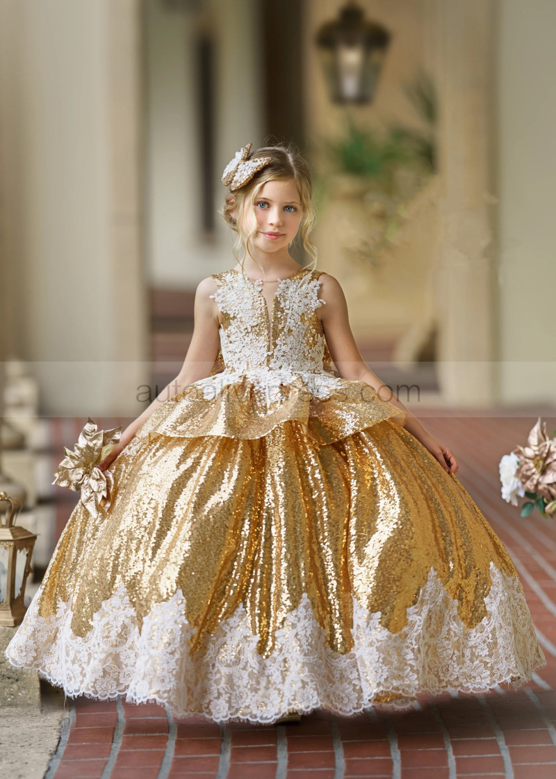 Gold Sequin Ivory Lace Peplum Gorgeous Flower Girl Dress