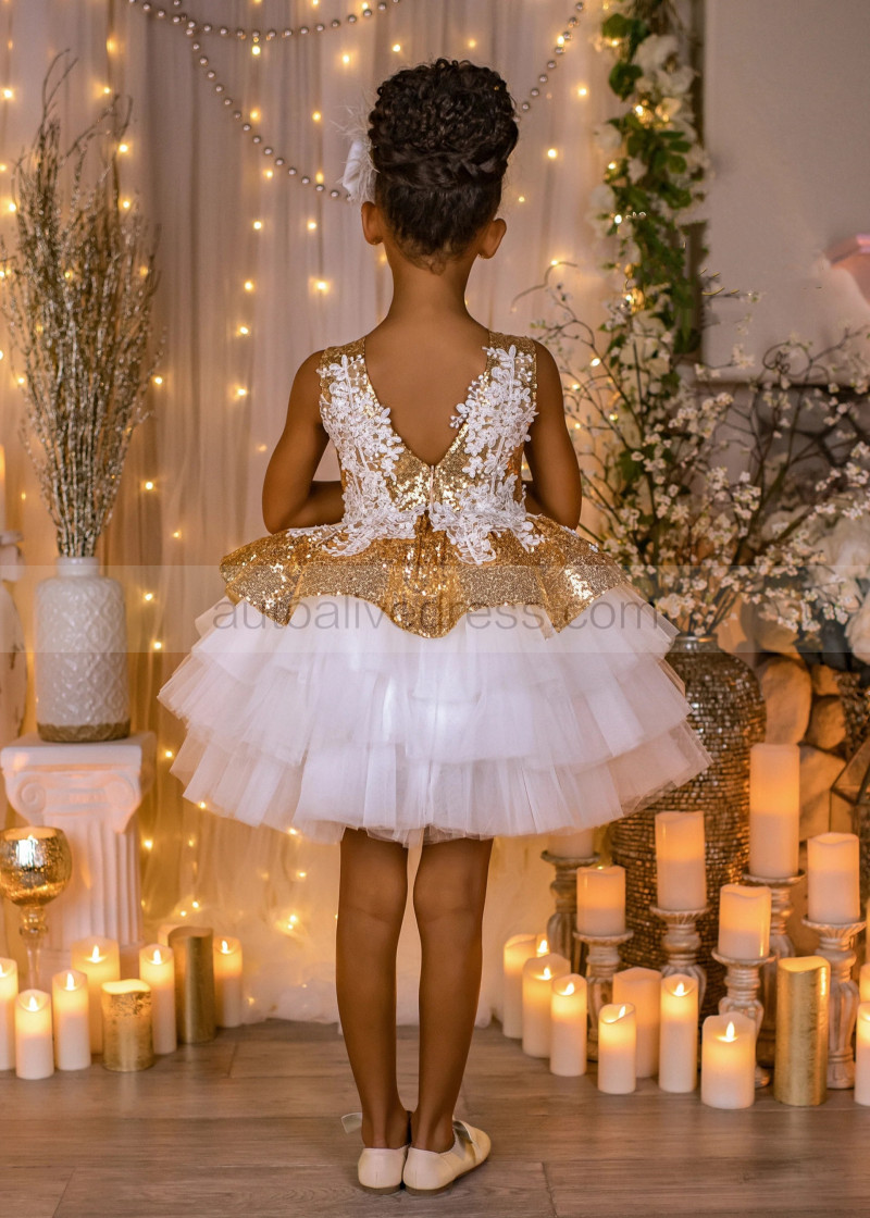 Gold Sequin Ivory Lace V Back Short Flower Girl Dress