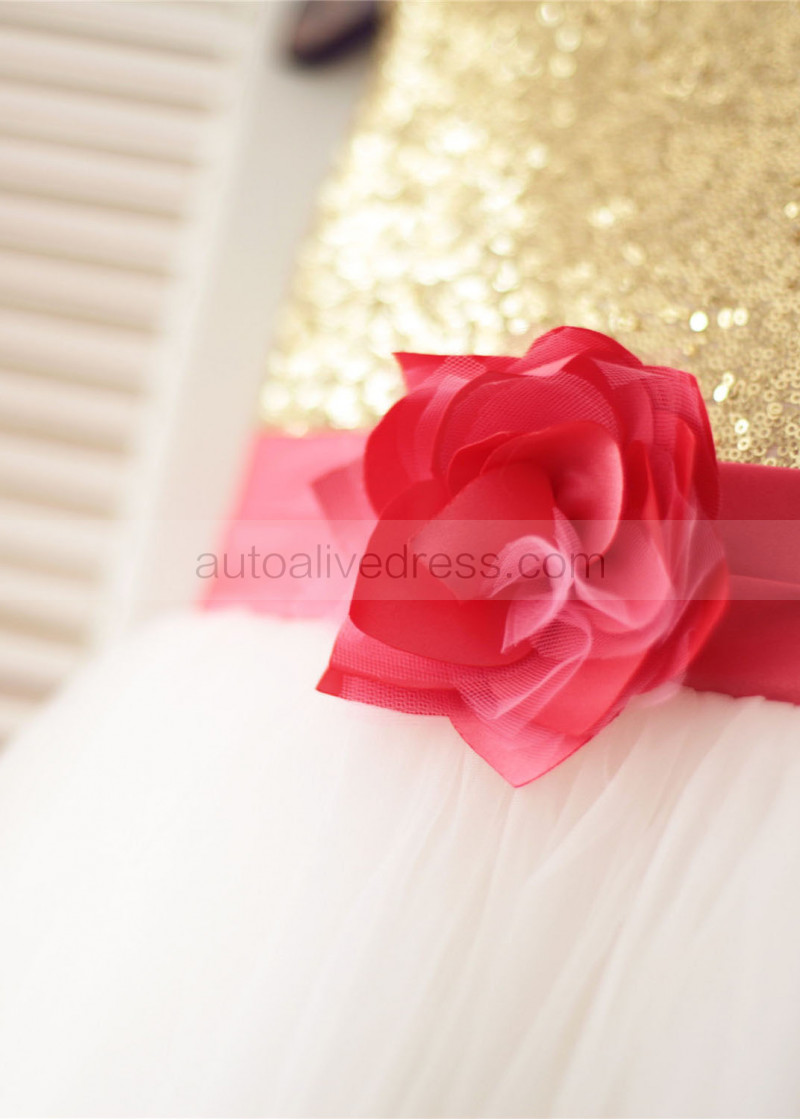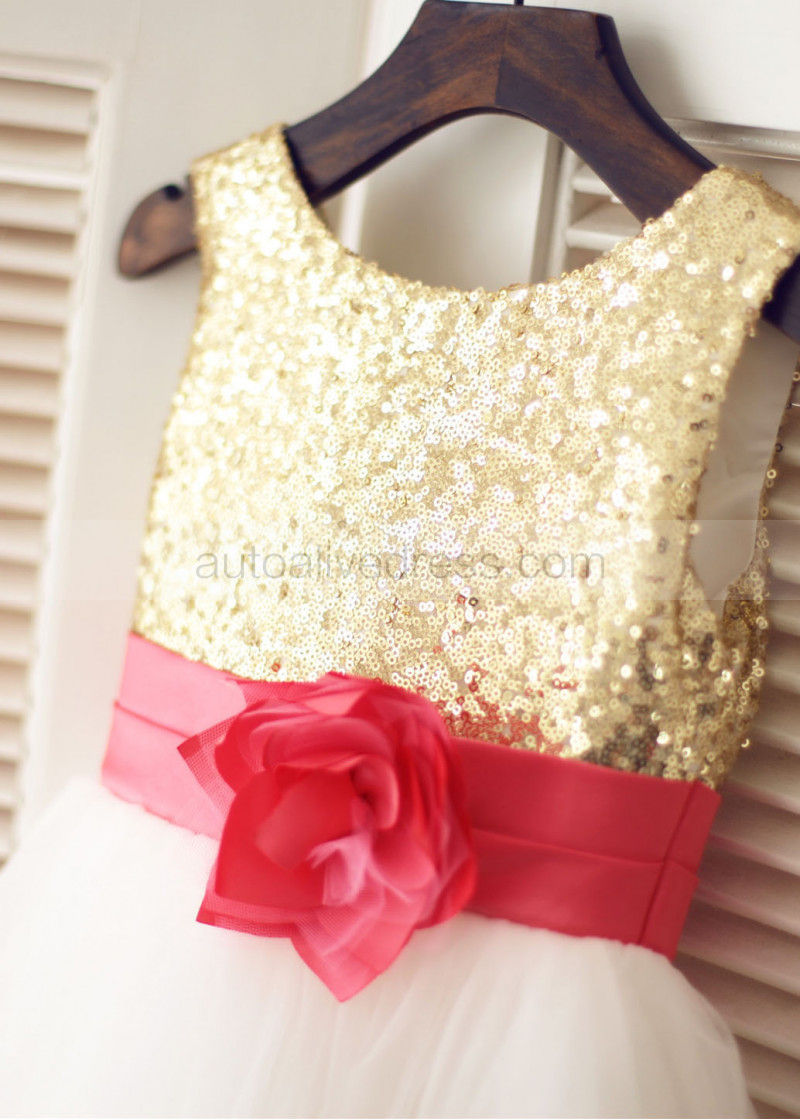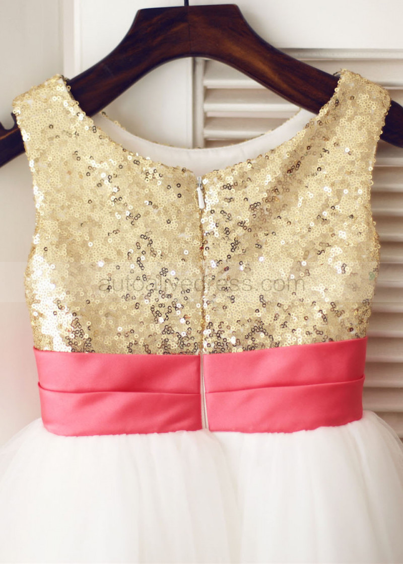Shown Color | Gold Sequin, Ivory Tulle With Coral Sash/Flower |