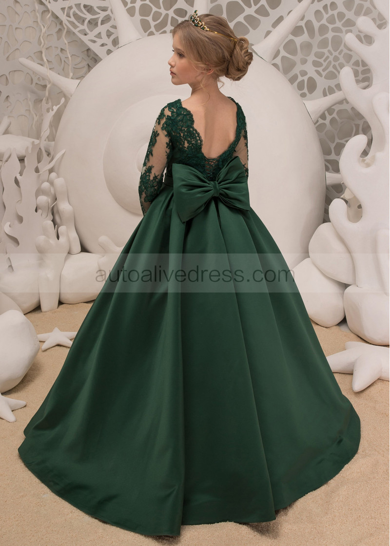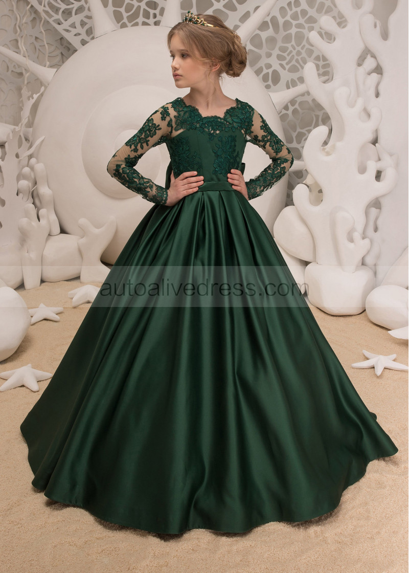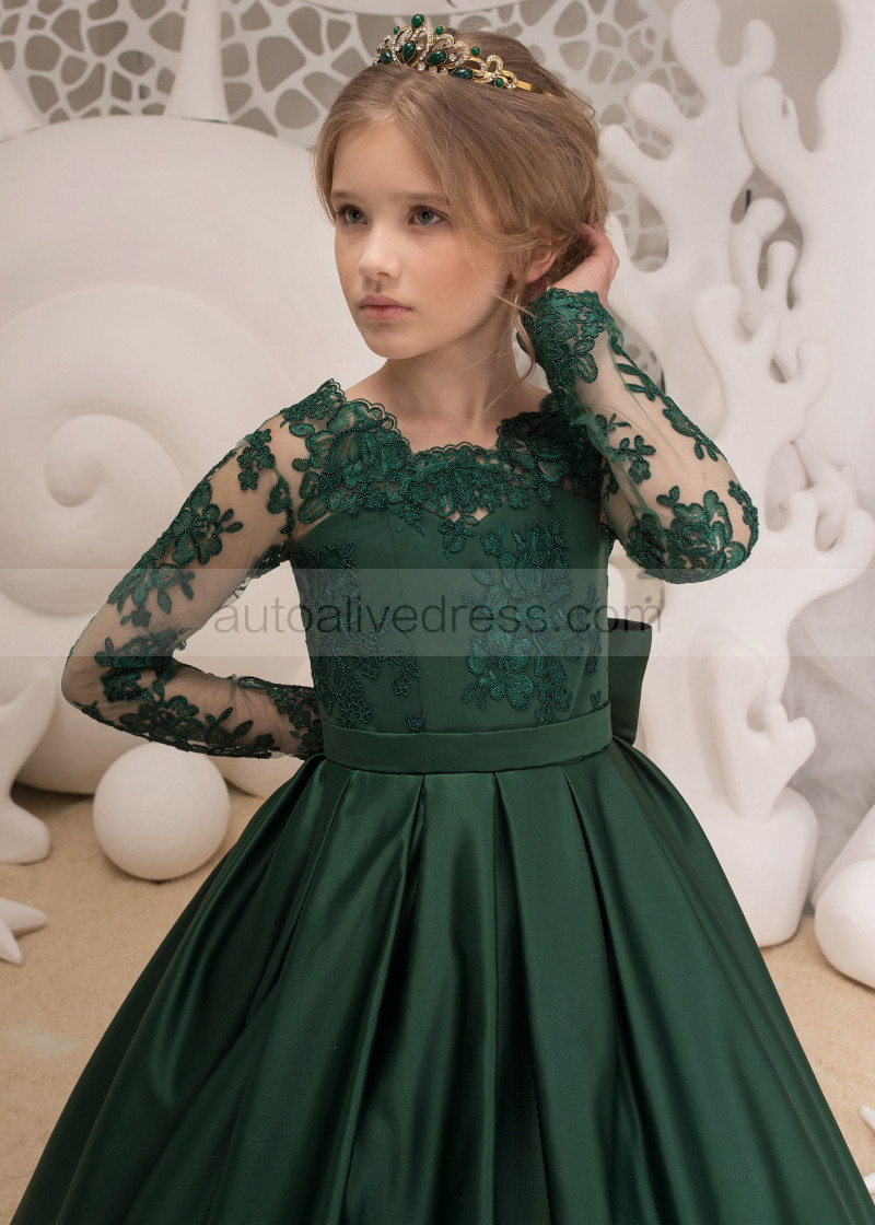 Green Lace Satin Long Sleeves Flower Girl Dress