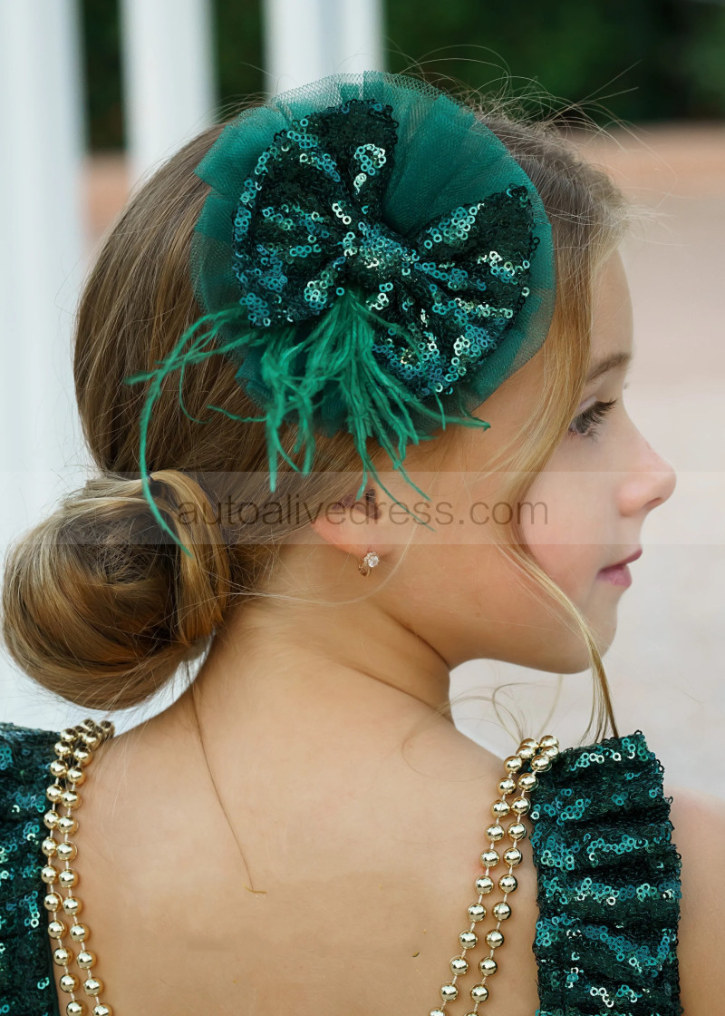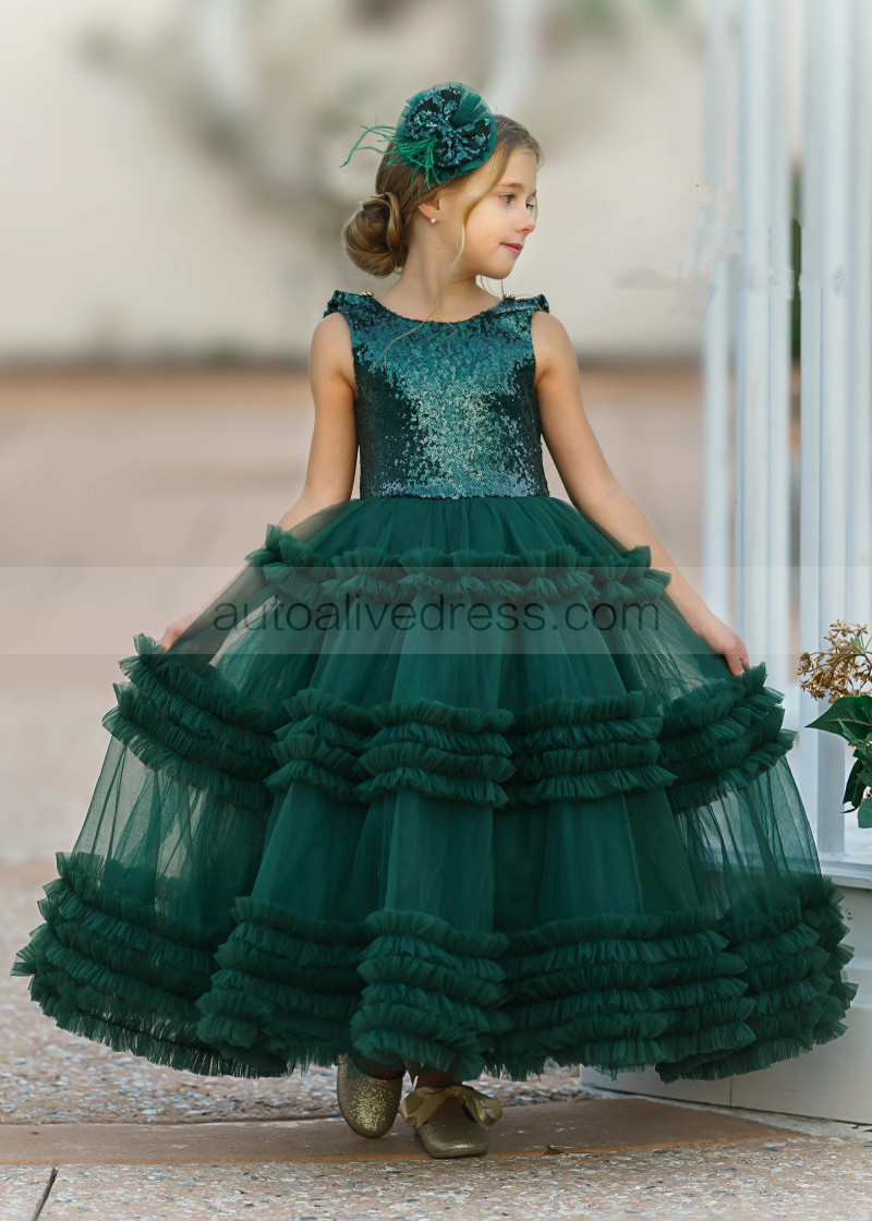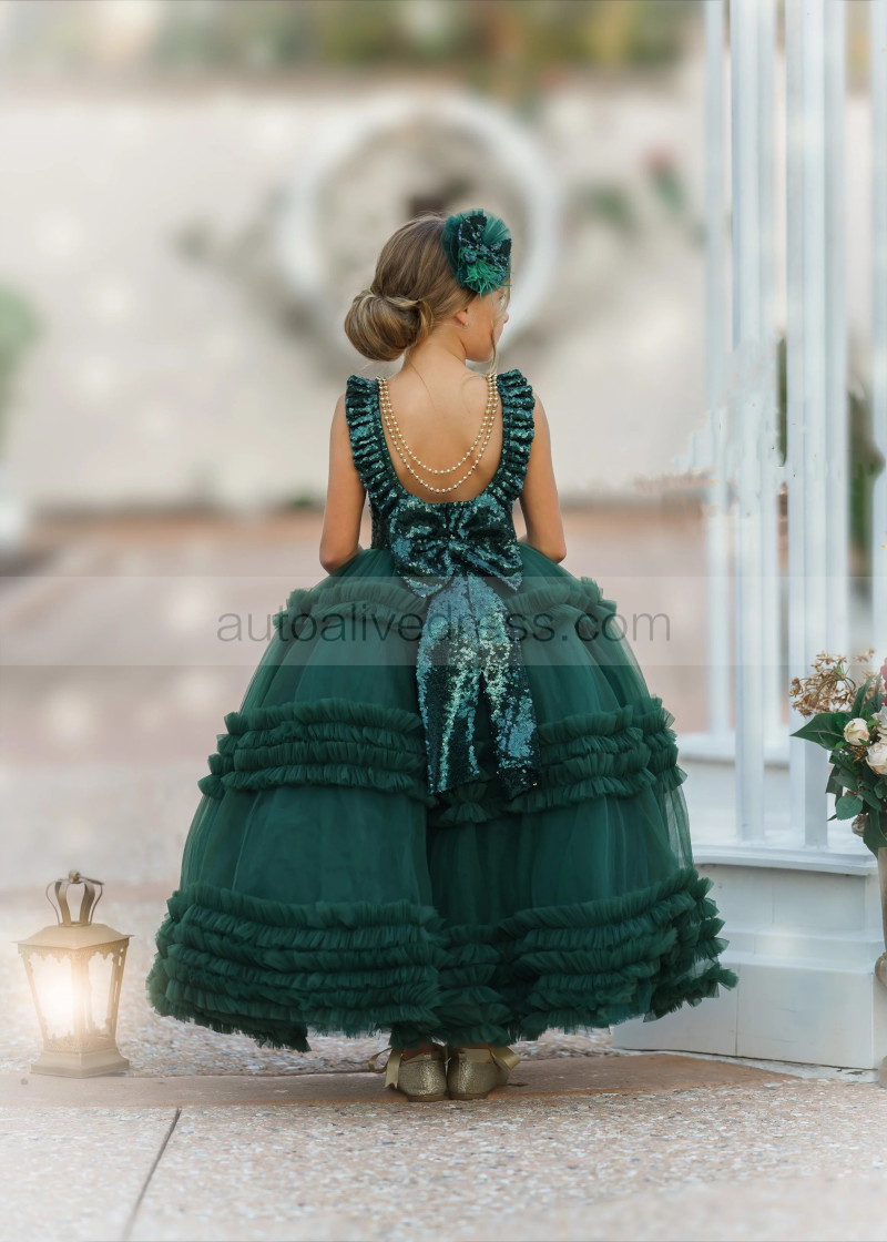 Green Sequin Tulle Open Back Ankle Length Flower Girl Dress