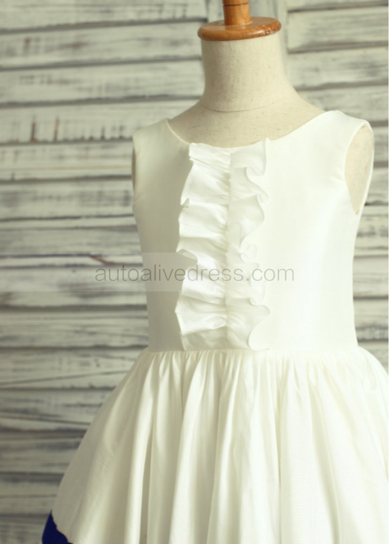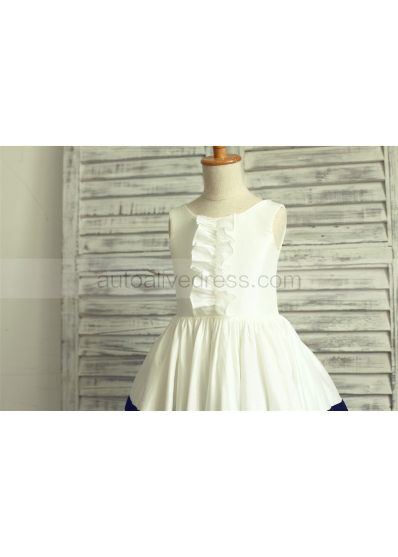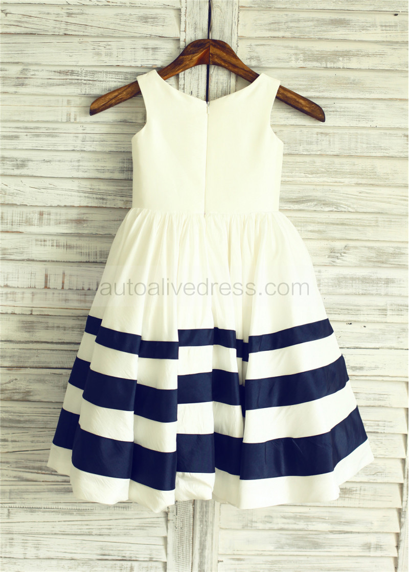 Hand Ruffled Ivory Navy Blue Striped Taffeta Vintage Flower Girl Dress
