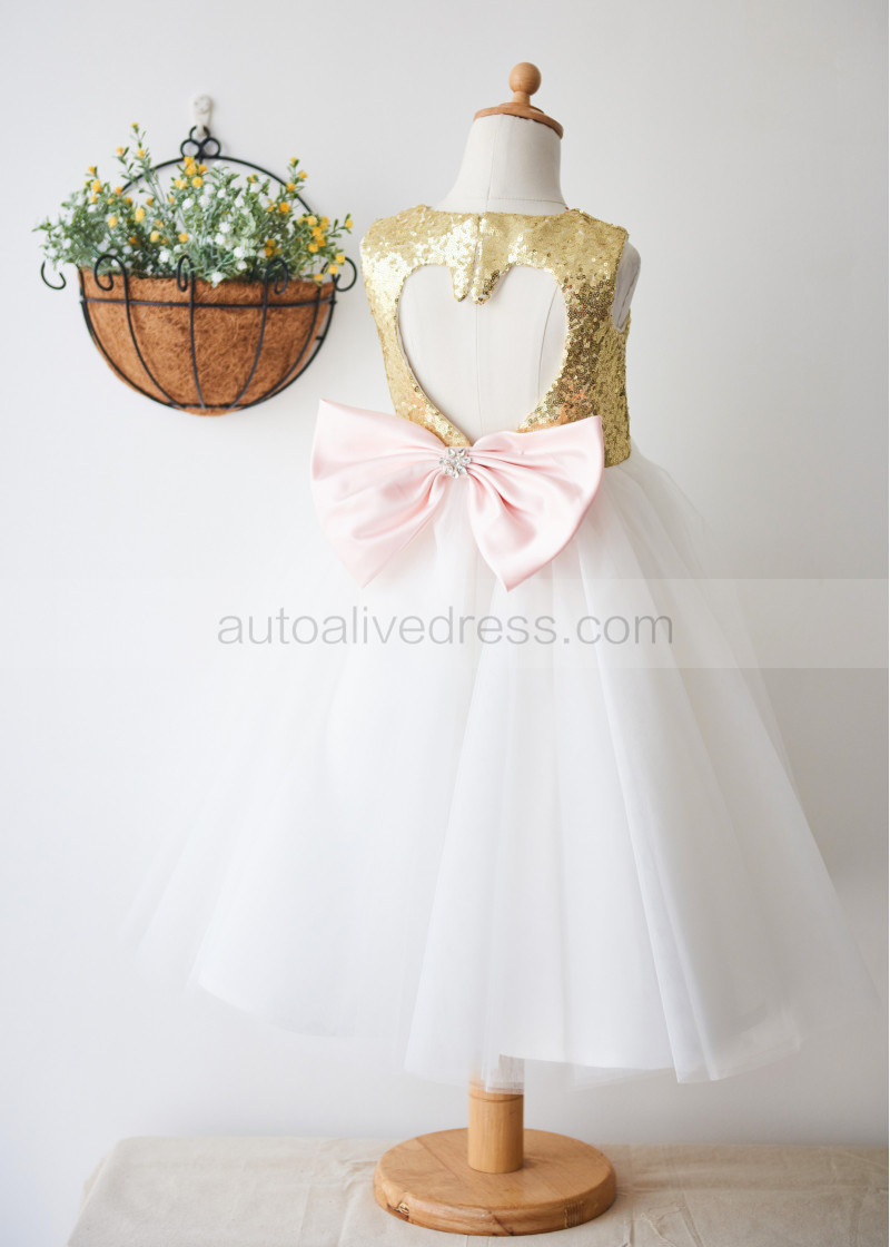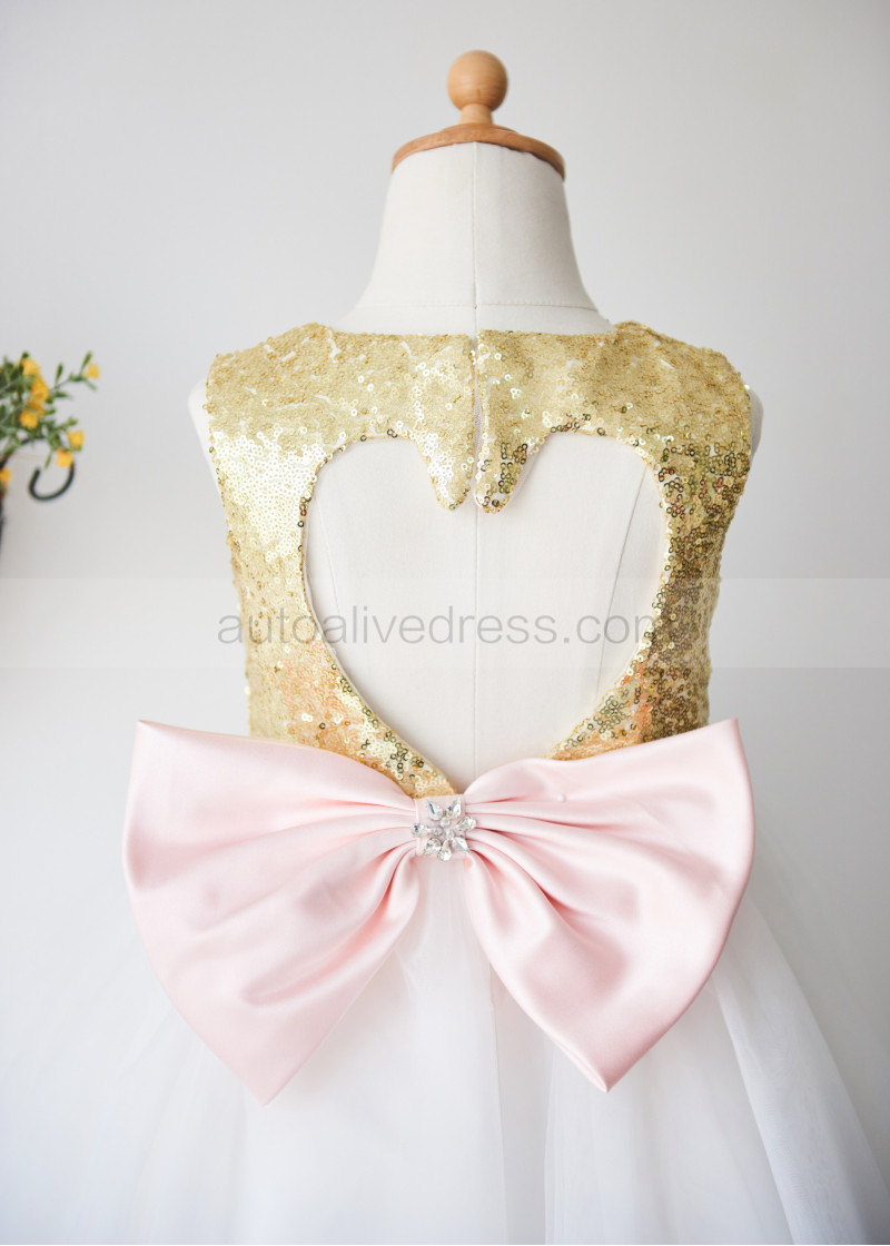 Heart-shaped Keyhole Gold Sequin Tulle Flower Girl Dress