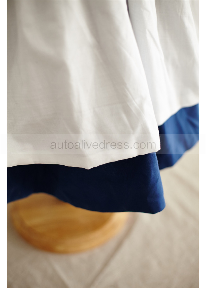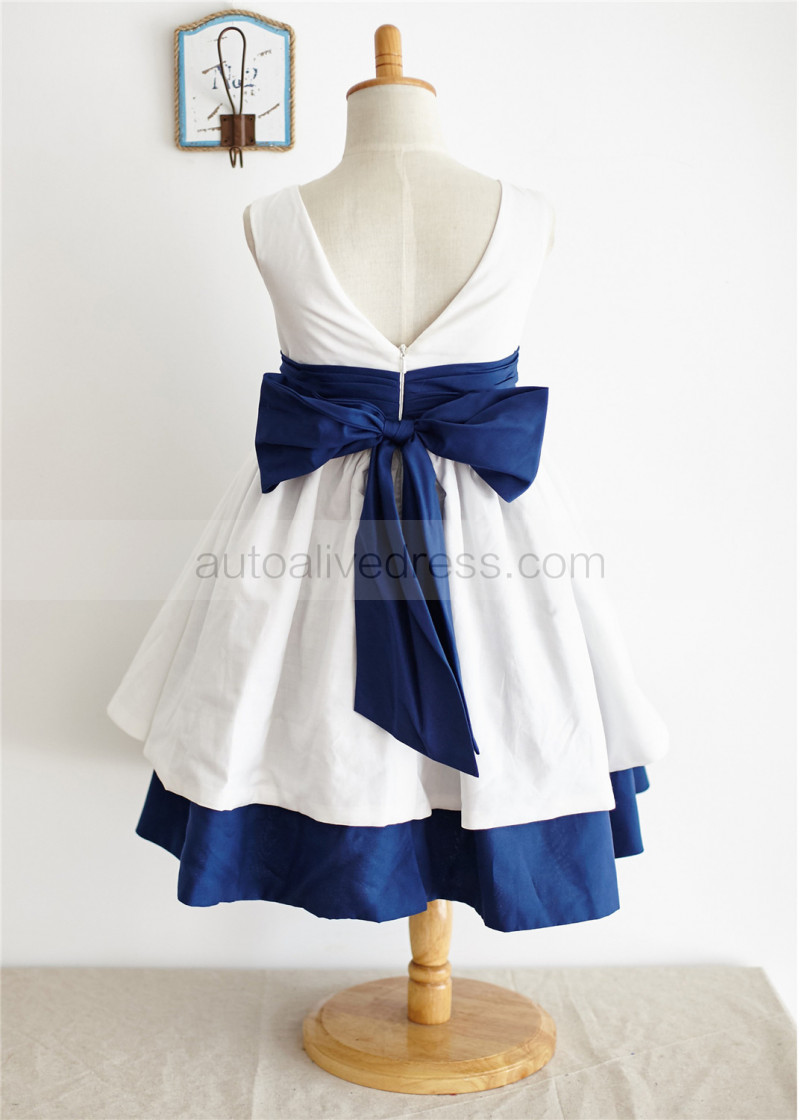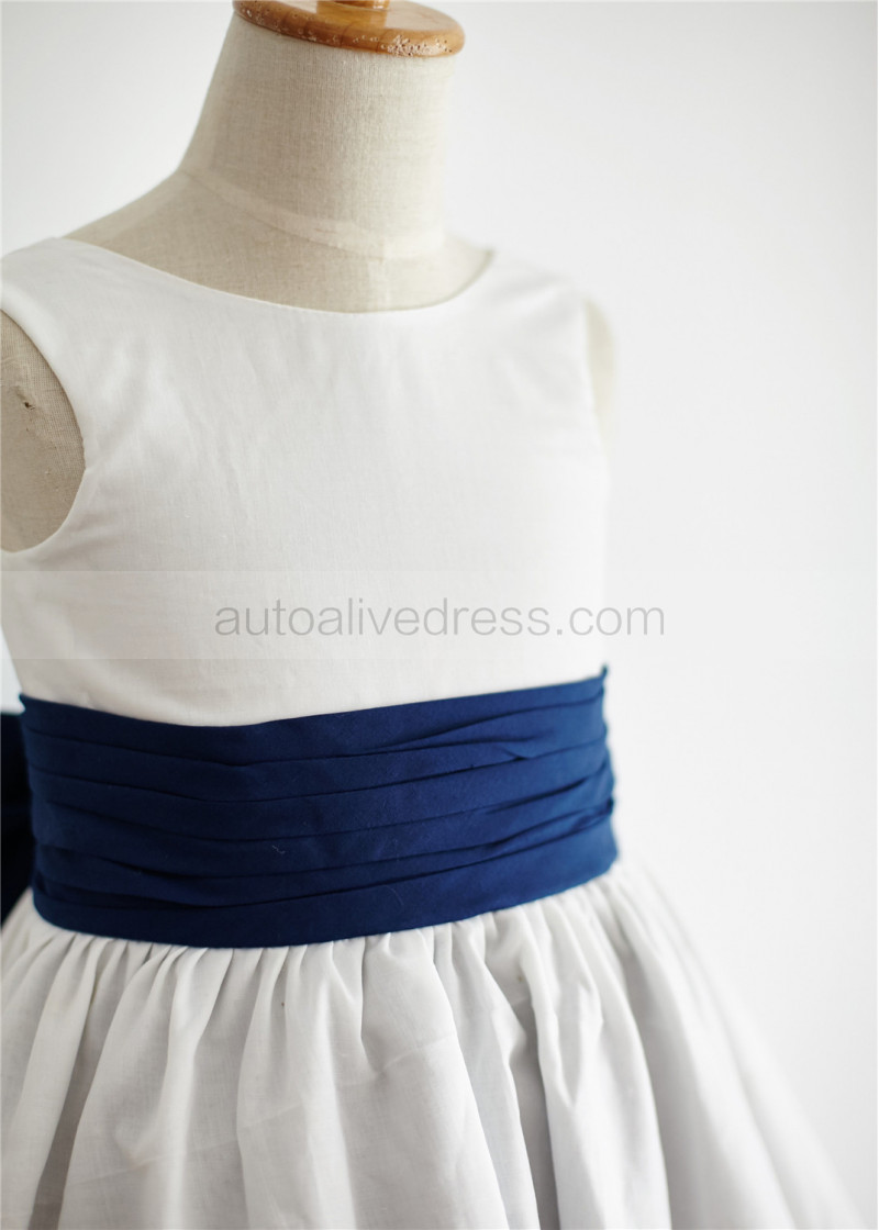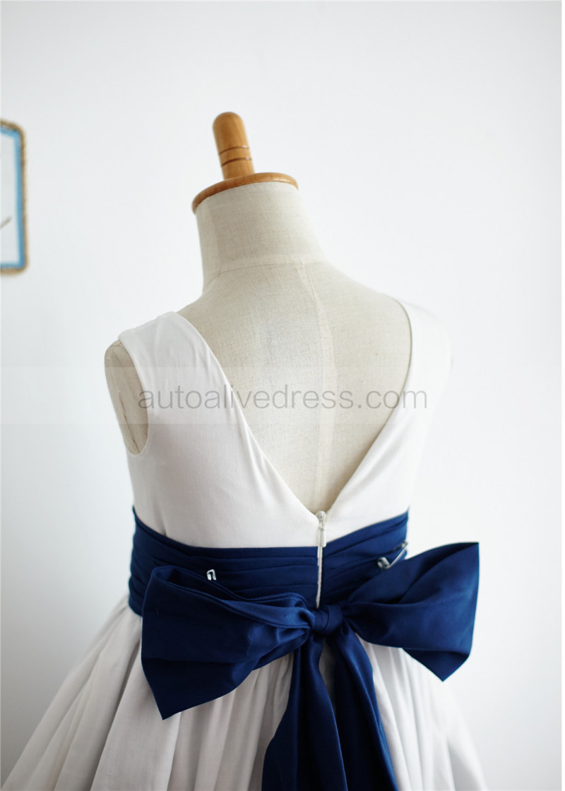 Ivory And Navy Blue Cotton V Back Flower Girl Dress