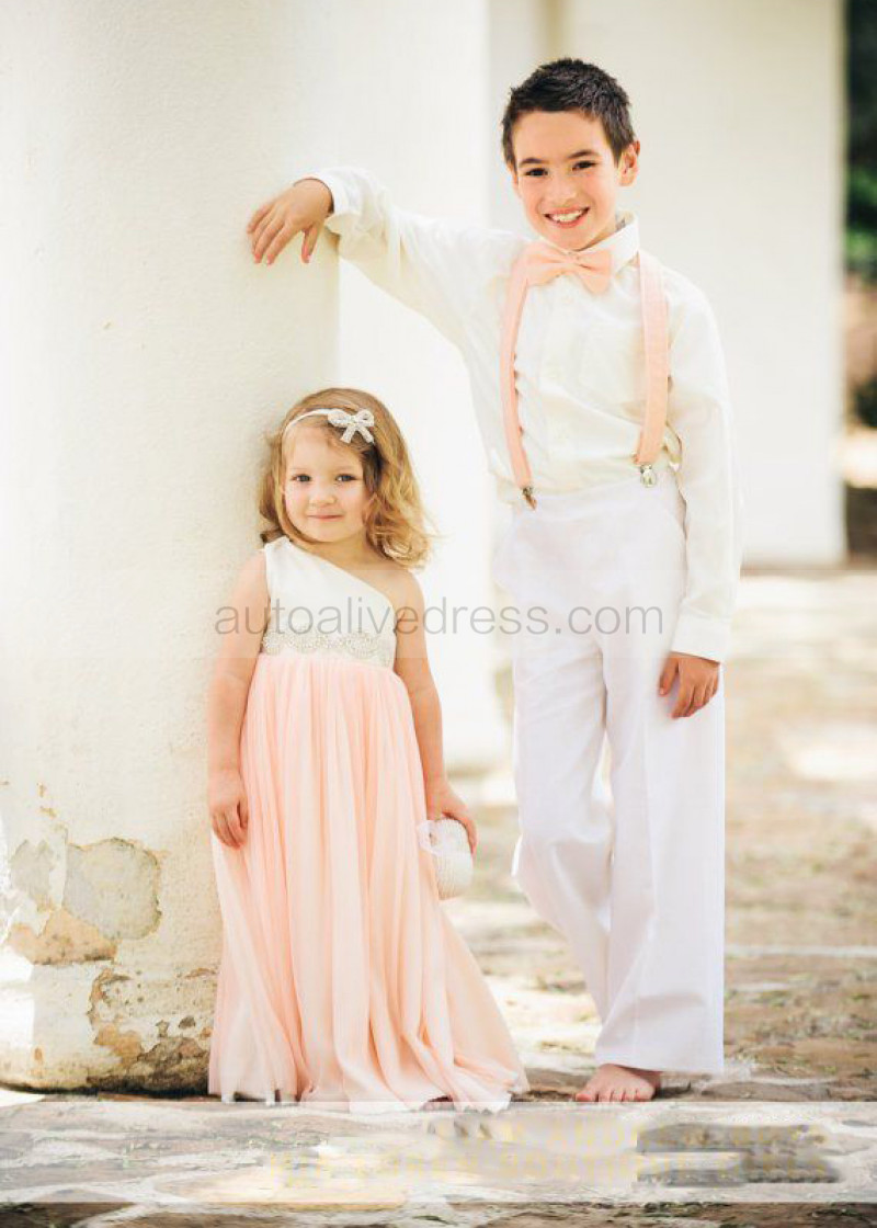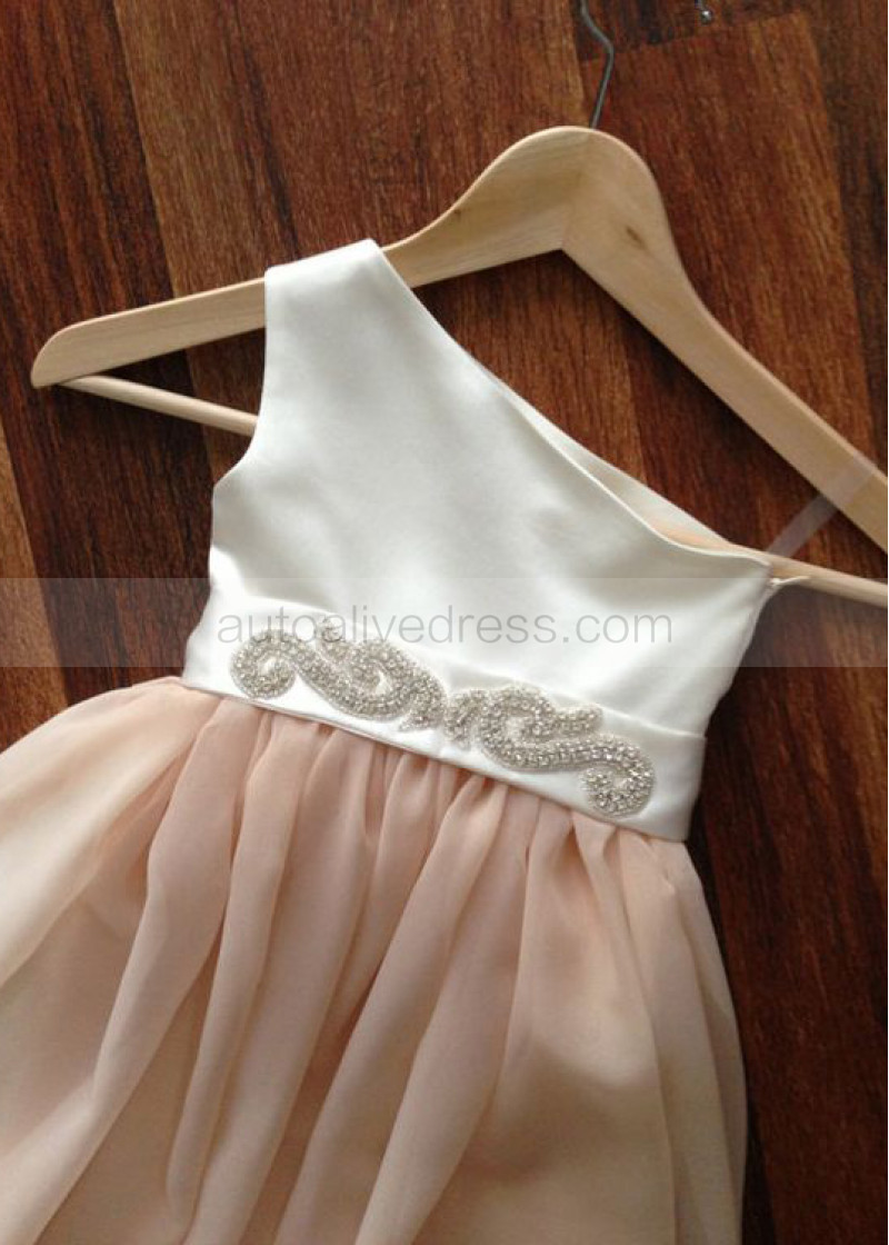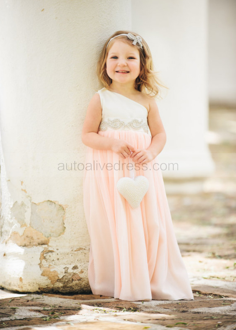 Ivory And Pink One Shoulder Satin Chiffon Flower Girl Dress