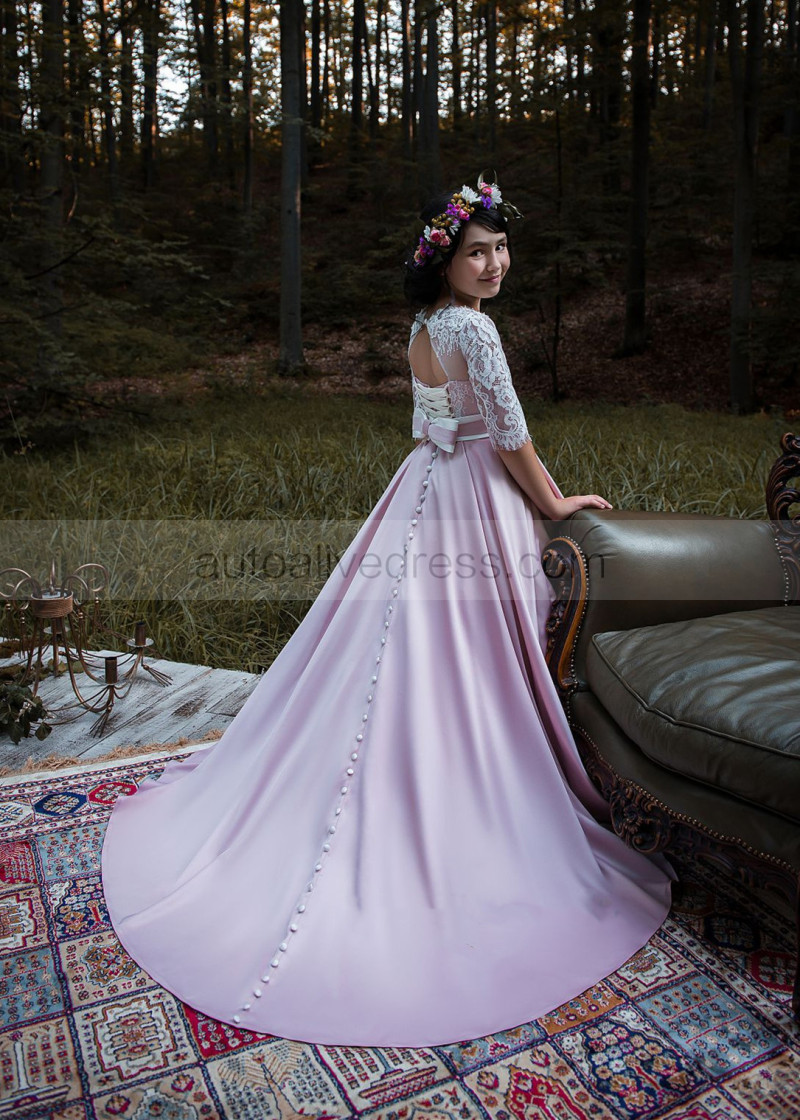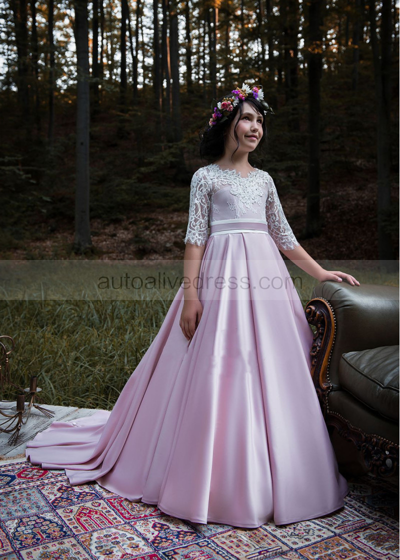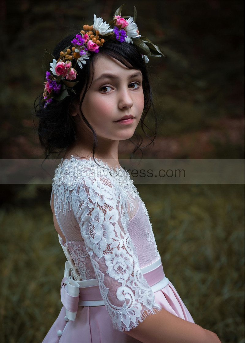Ivory Eyelash Lace Blush Pink Satin Corset Back Flower Girl Dress