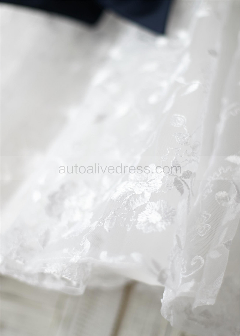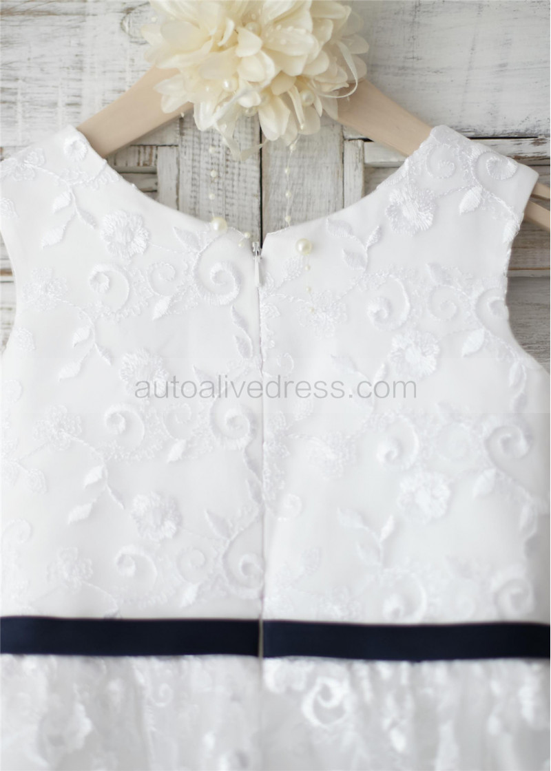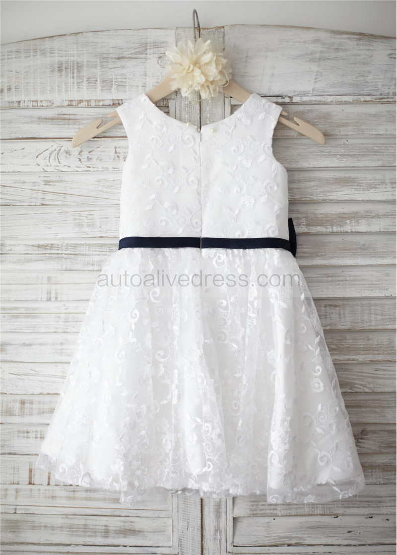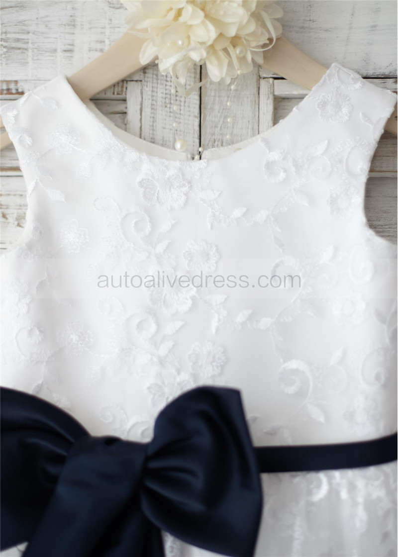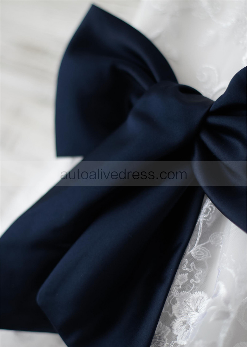 Ivory Lace Big Navy Blue Bow Knee Length Flower Girl Dress