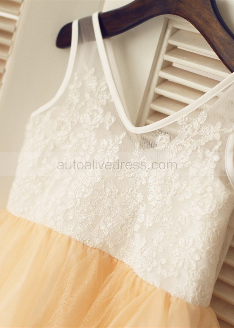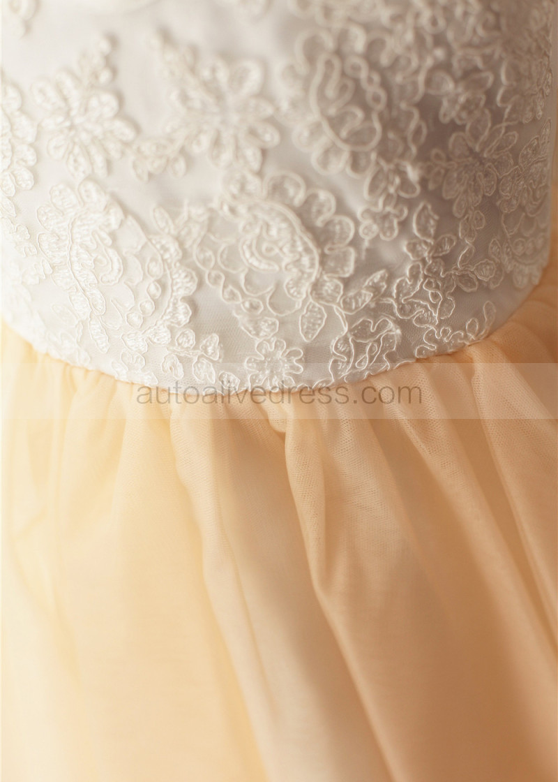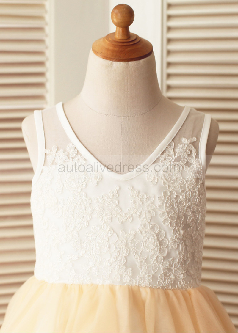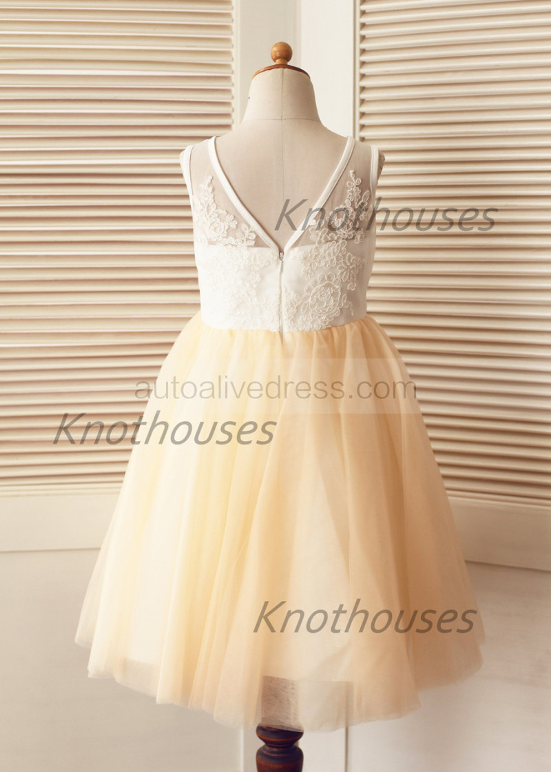 Ivory Lace Champagne Tulle V Neck Tea Length Flower Girl Dress