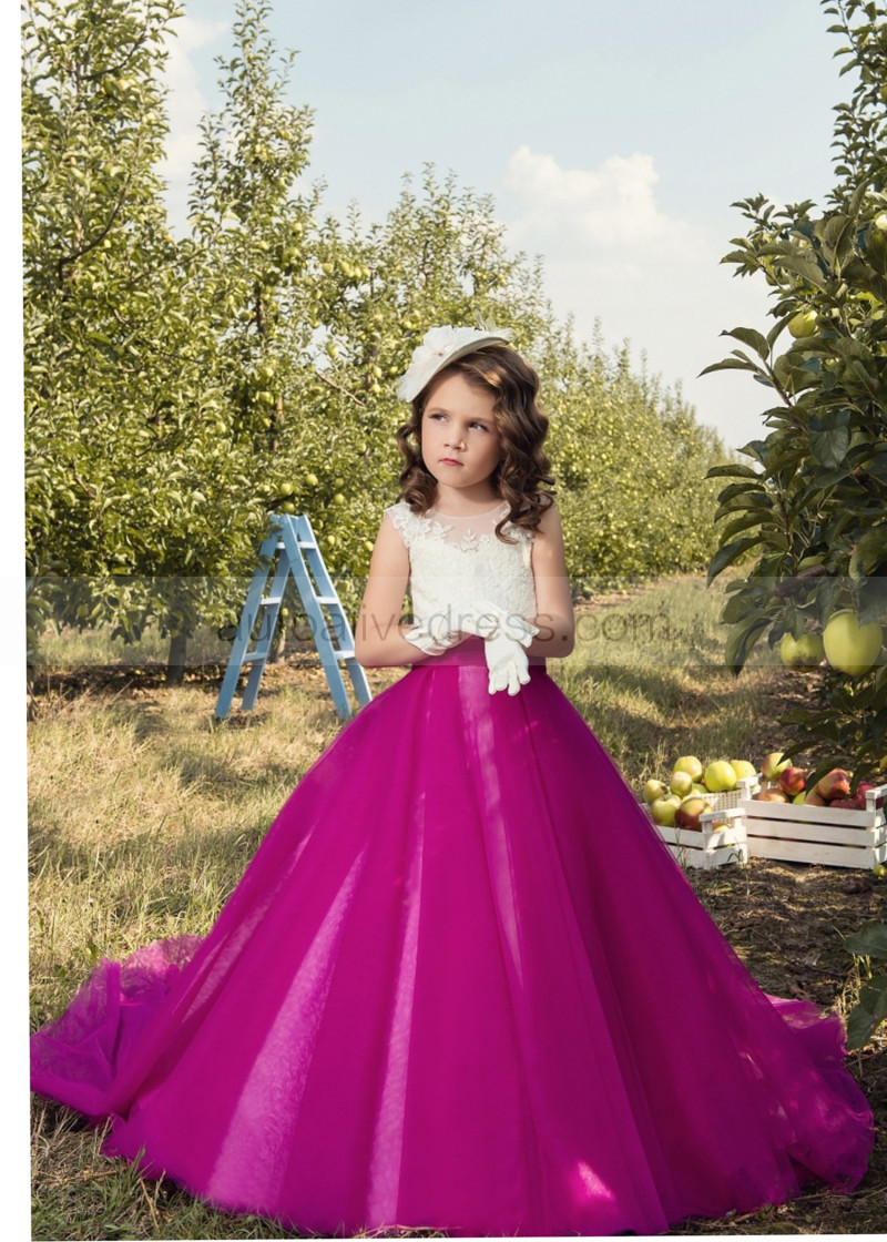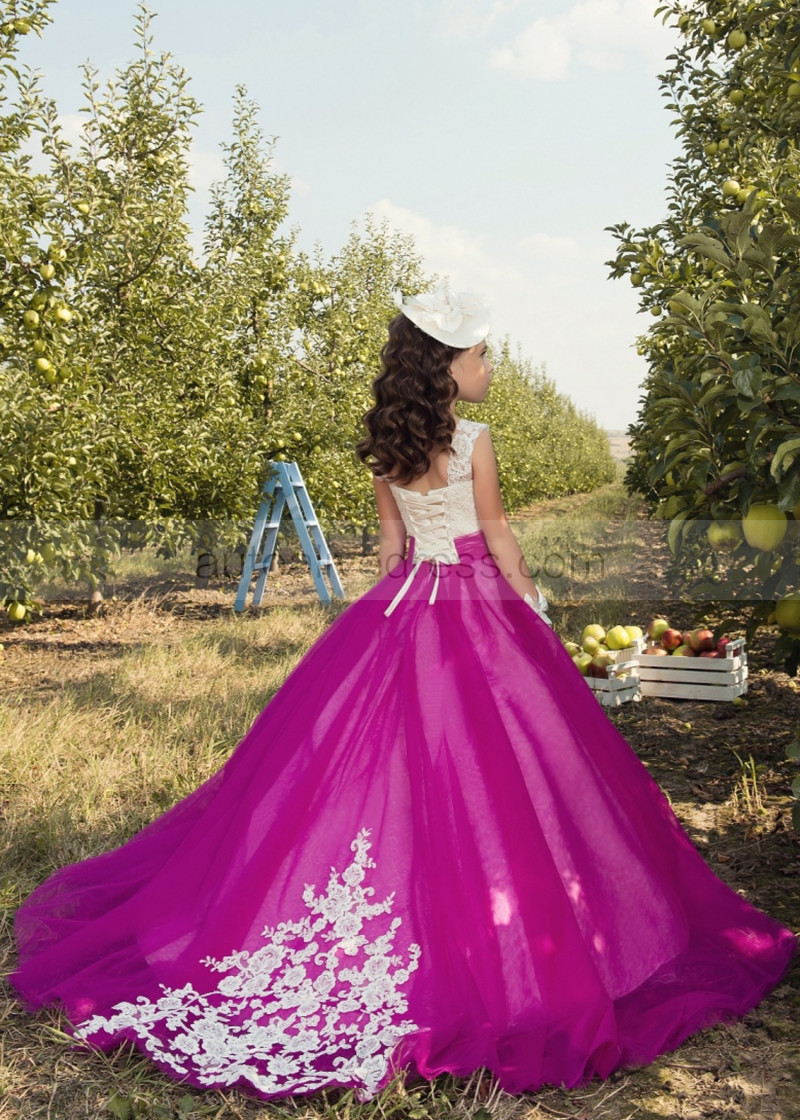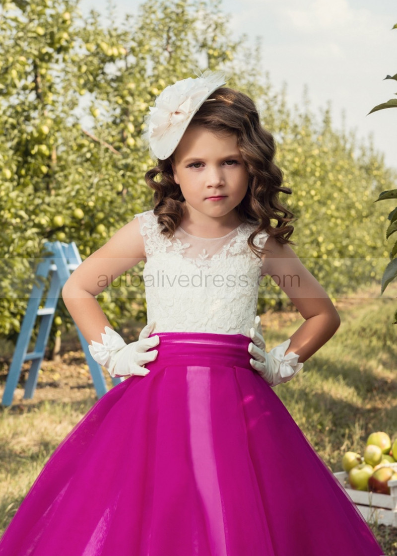 Ivory Lace Fuchsia Tulle Corset Back Flower Girl Dress