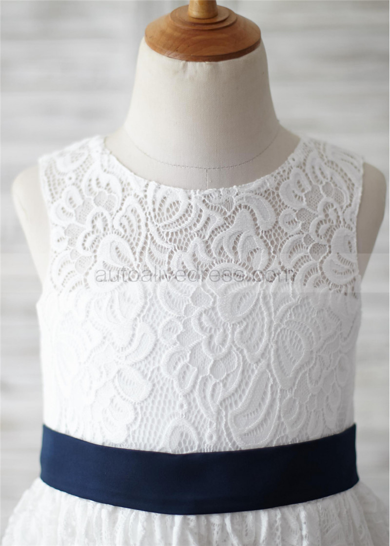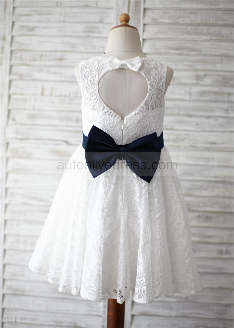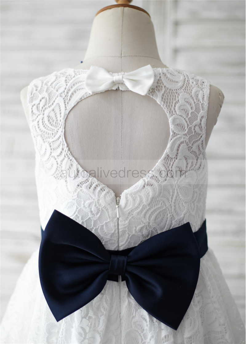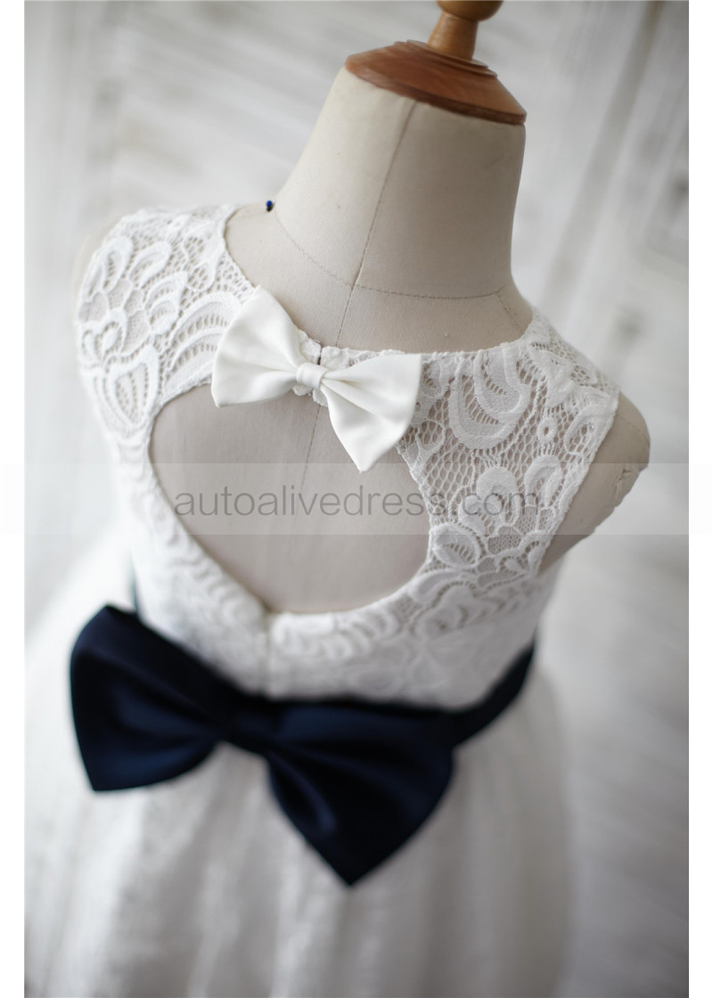 Ivory Lace Navy Blue Bow Heart Hole Back Flower Girl Dress