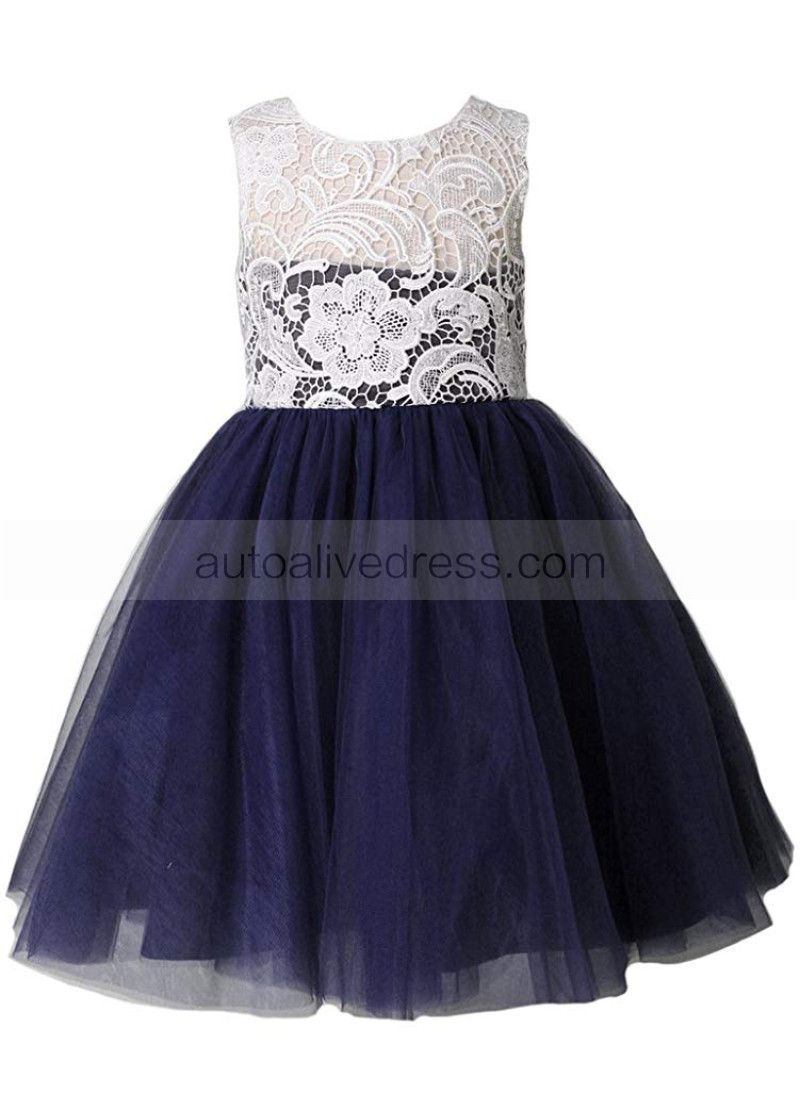 Ivory Lace Navy Blue Tulle Classic Short Flower Girl Dress