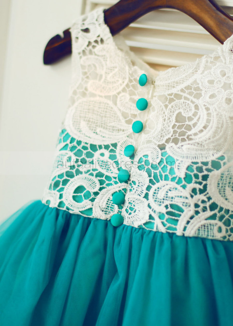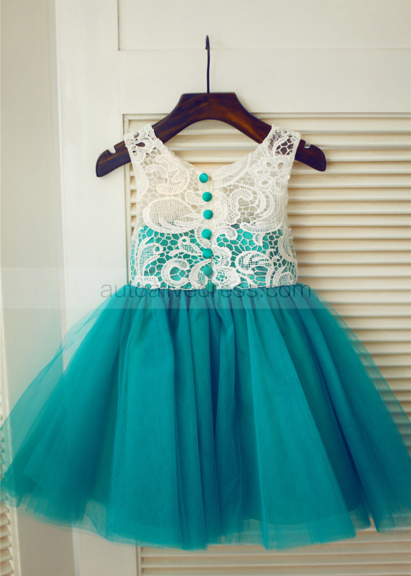 Ivory Lace Peacock Blue Tulle Unique Flower Girl Dress