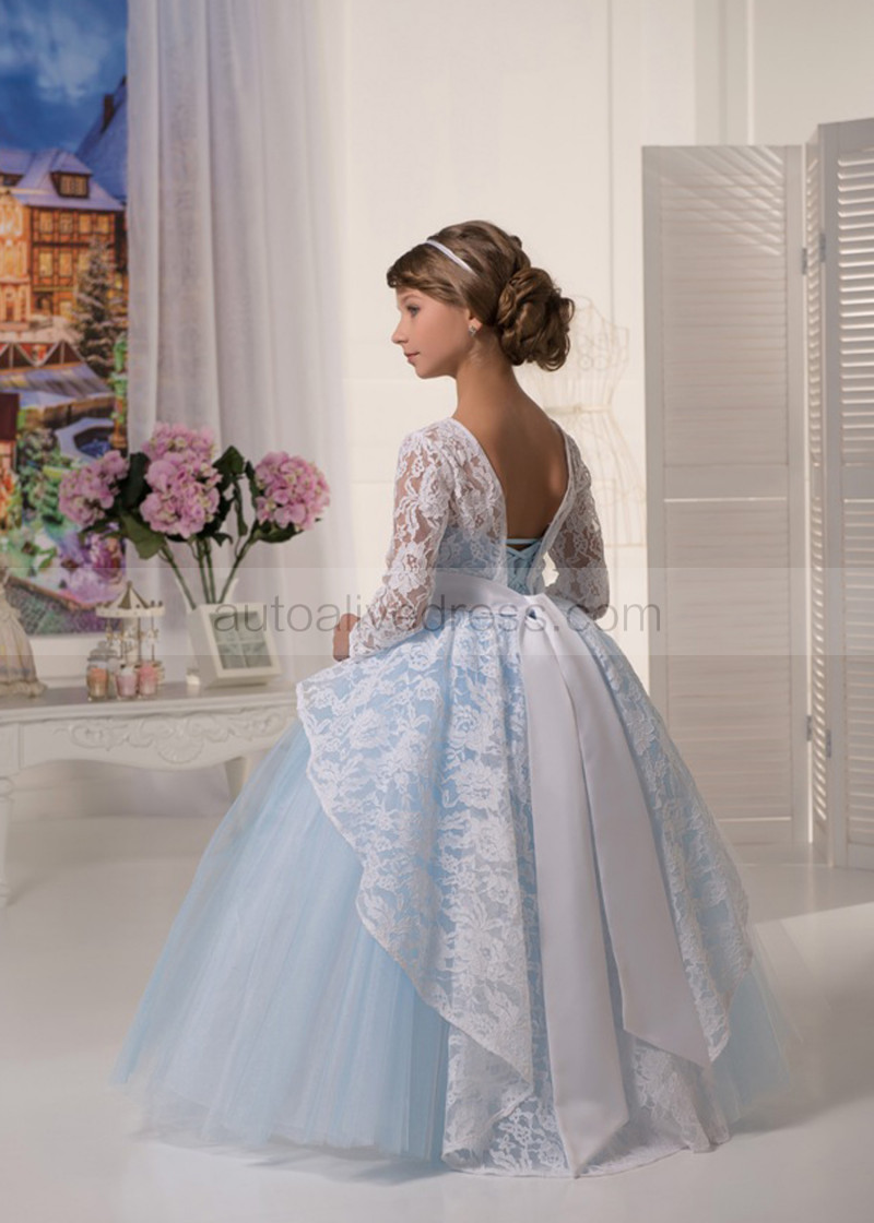 Ivory Lace Sky Blue Tulle Corset Back Floor Length Flower Girl Dress